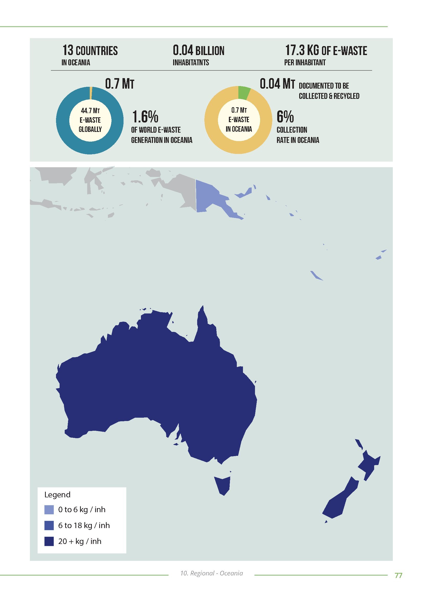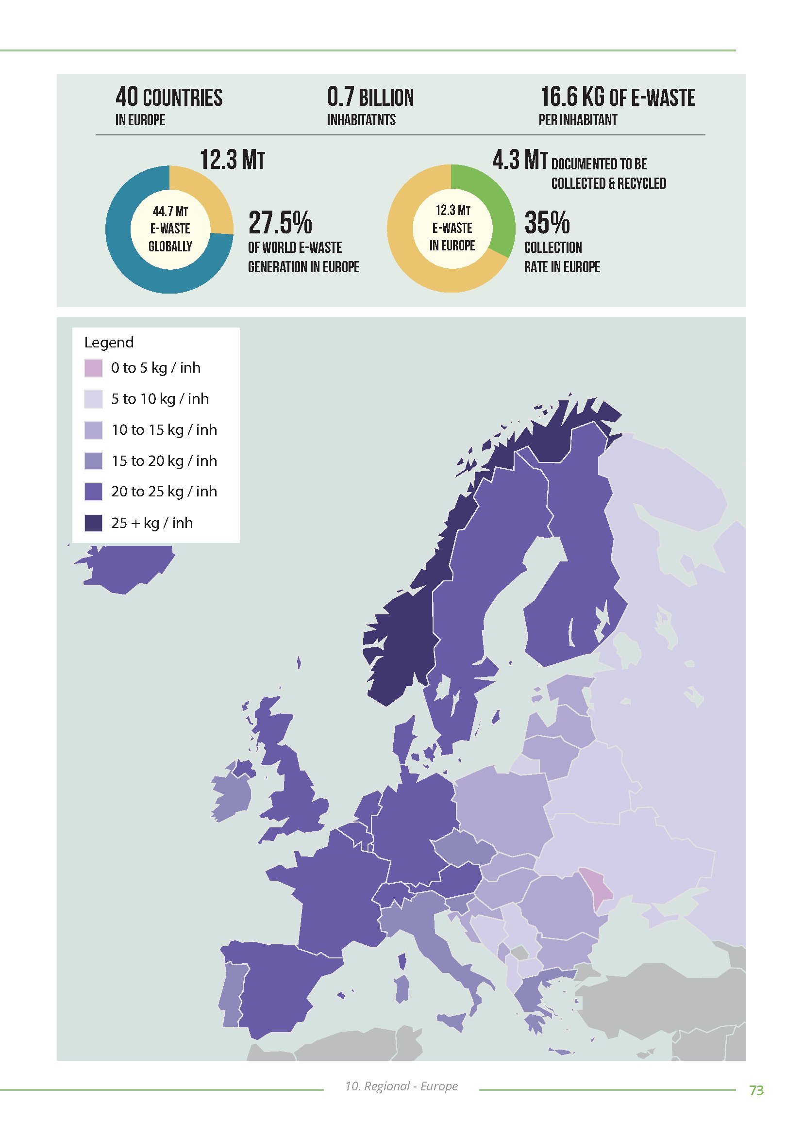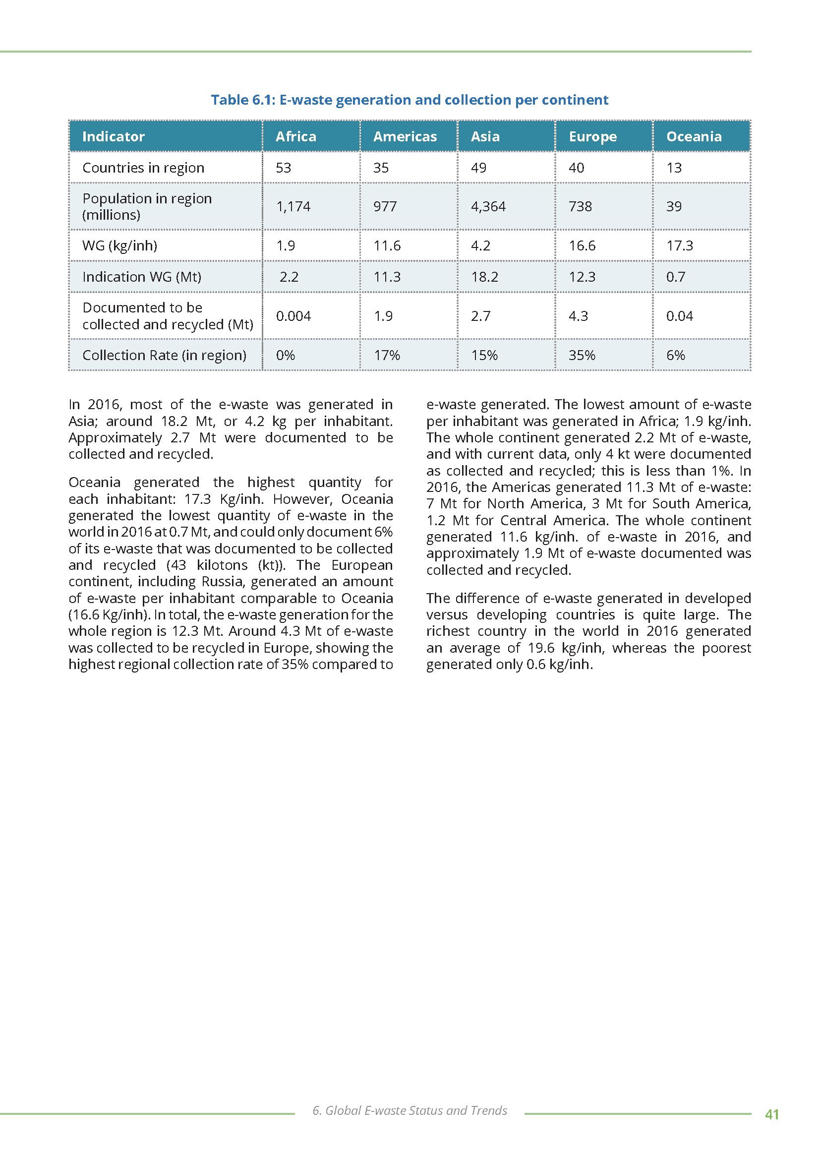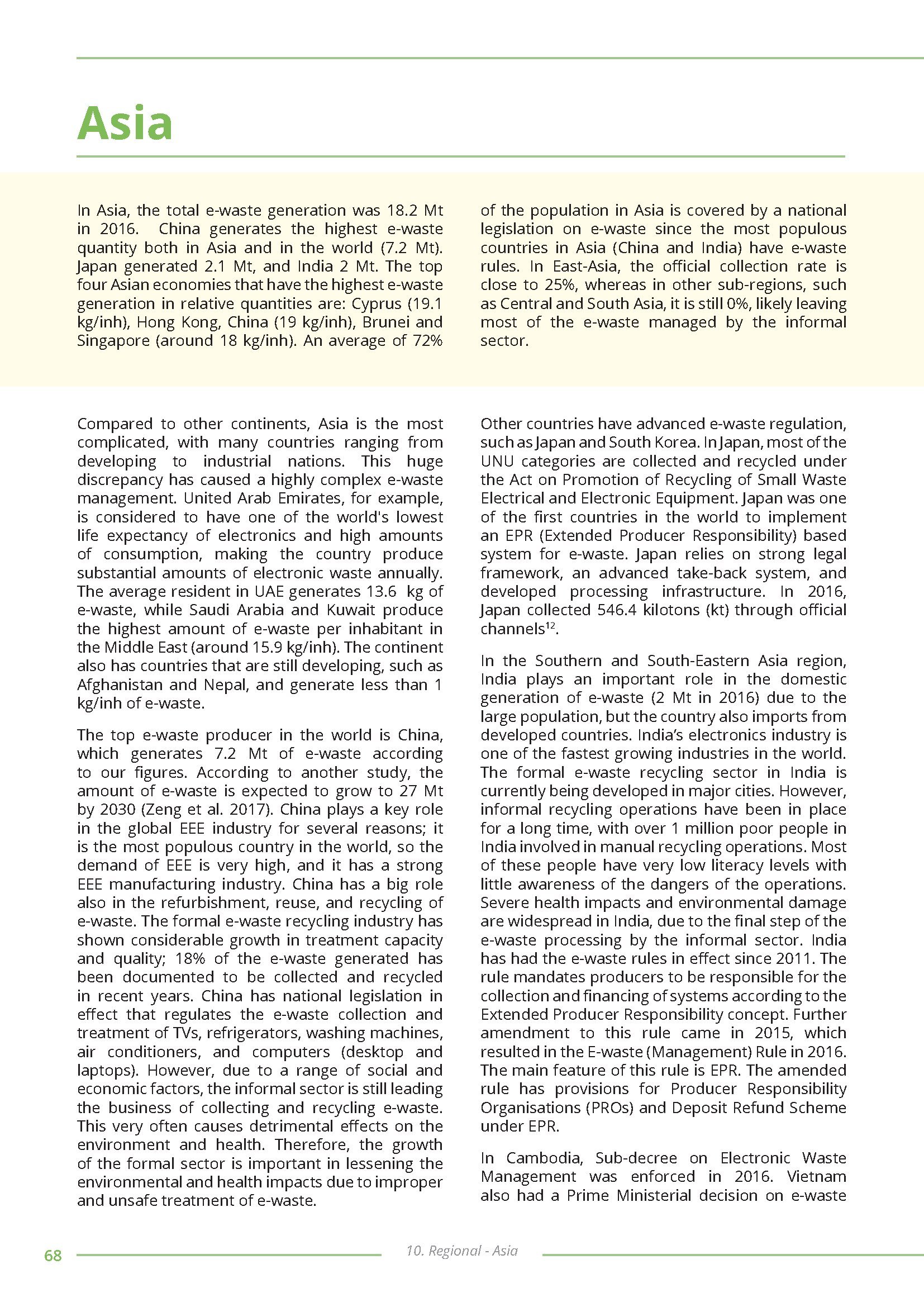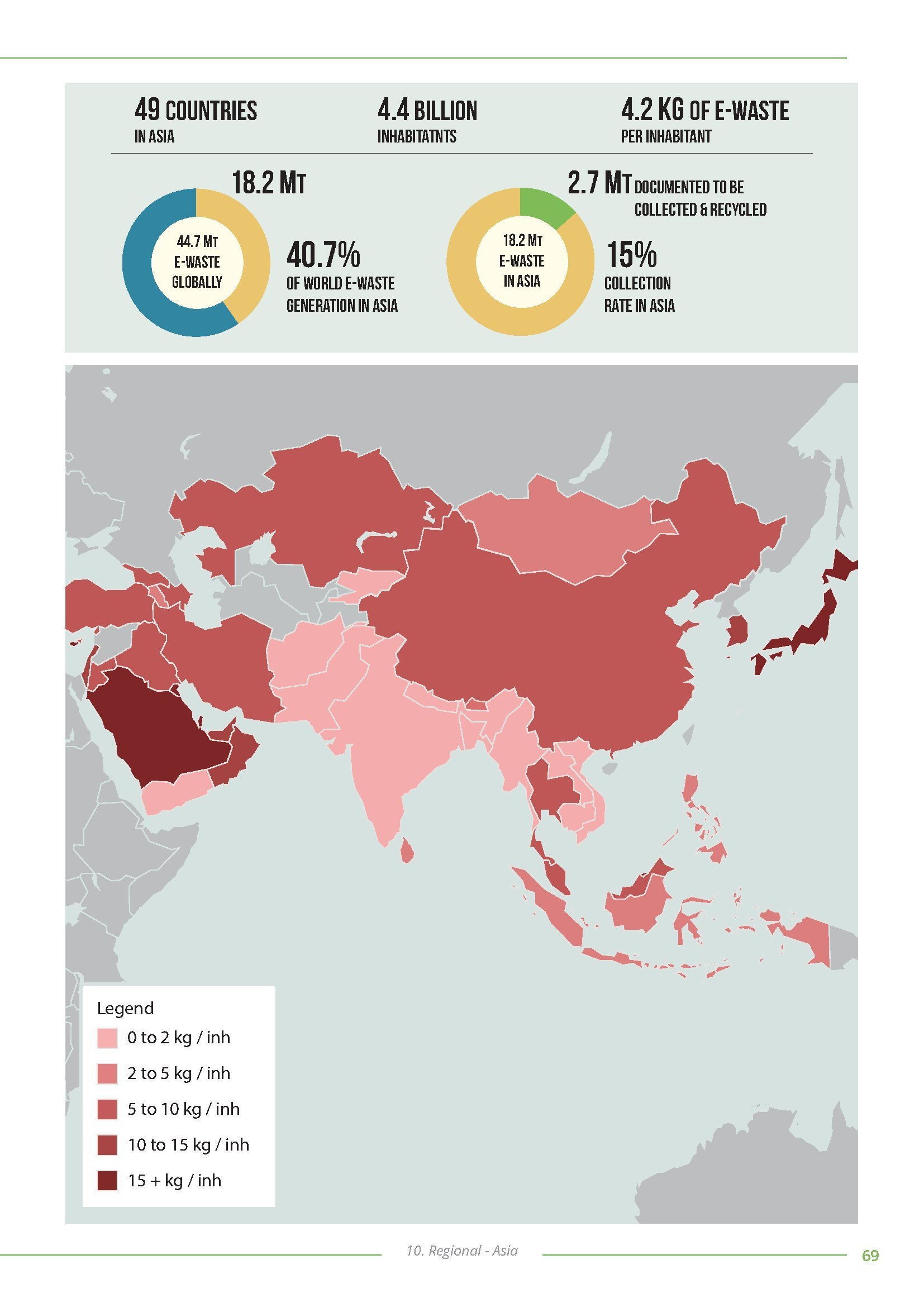 亚洲是电子垃圾生成最多的地方。2016年,亚洲产生1820万吨电子垃圾,其次是欧洲(1230万吨)、美洲(1130万吨)、非洲(220万吨)和大洋洲(70万吨)。但是,从人均电子垃圾产量方面来看,大洋洲排在首位。而欧洲的电子垃圾收集率最高(35%)。