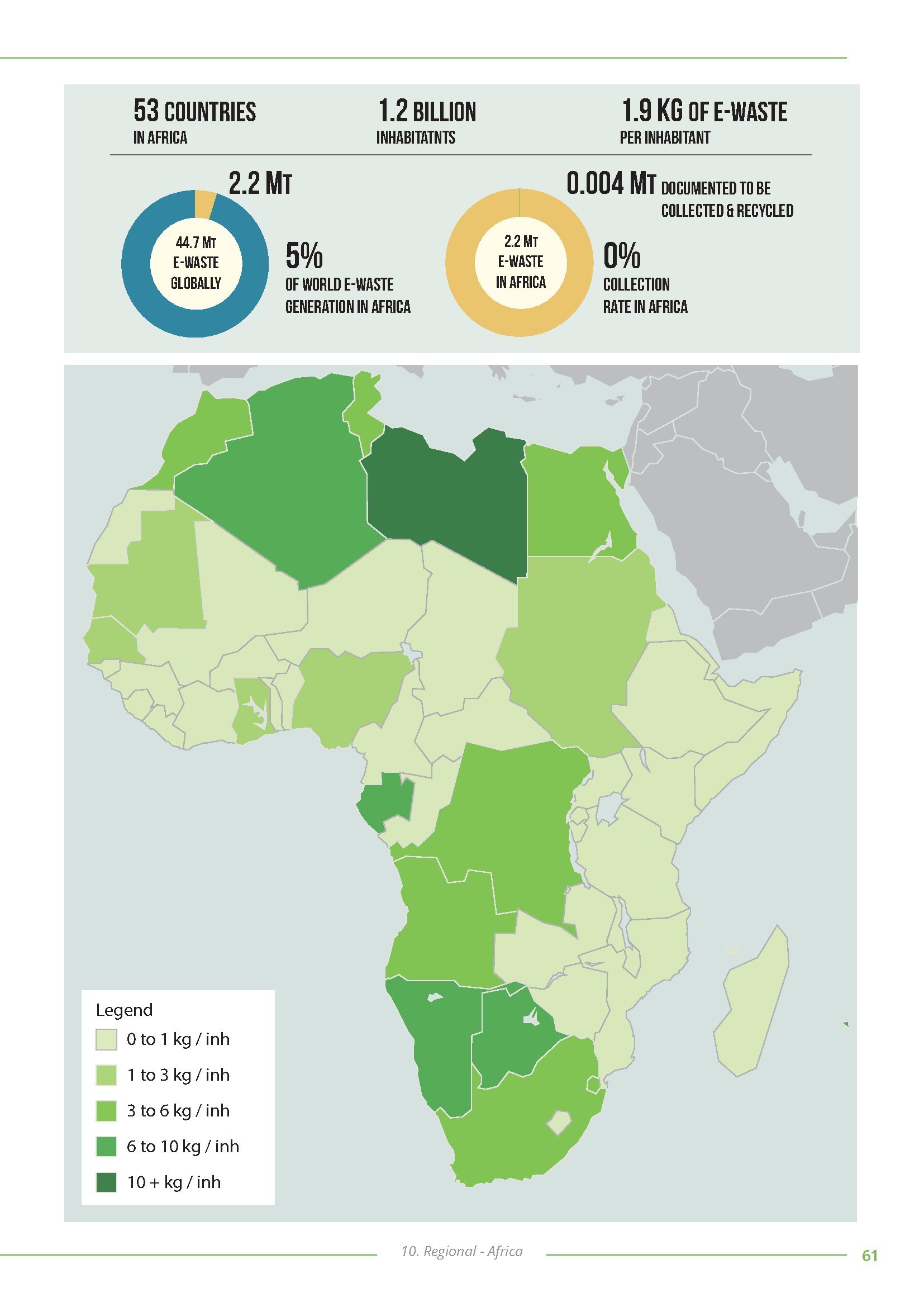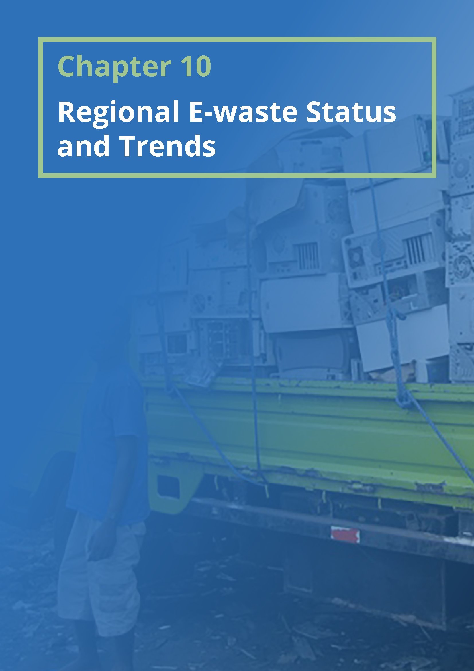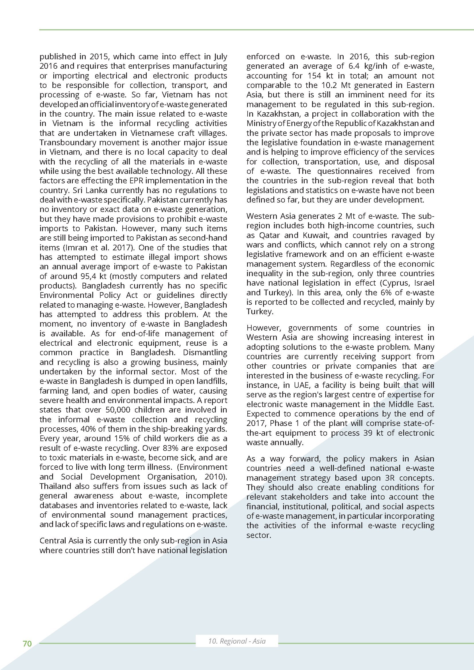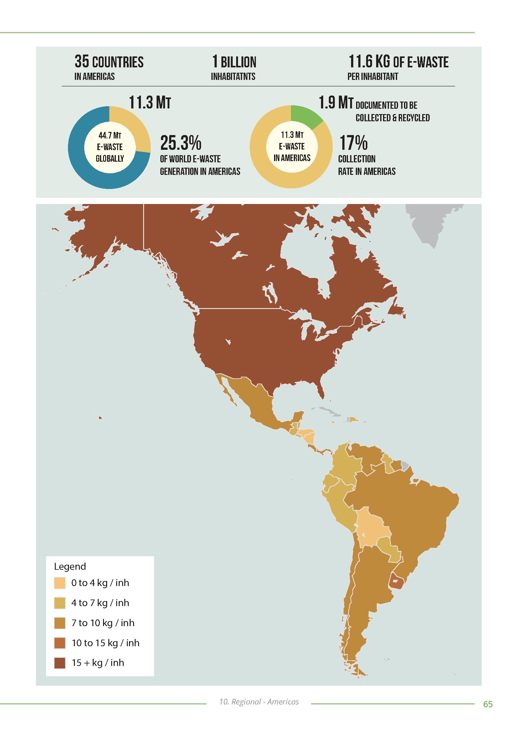 亚洲是电子垃圾生成最多的地方。2016年,亚洲产生1820万吨电子垃圾,其次是欧洲(1230万吨)、美洲(1130万吨)、非洲(220万吨)和大洋洲(70万吨)。但是,从人均电子垃圾产量方面来看,大洋洲排在首位。而欧洲的电子垃圾收集率最高(35%)。
