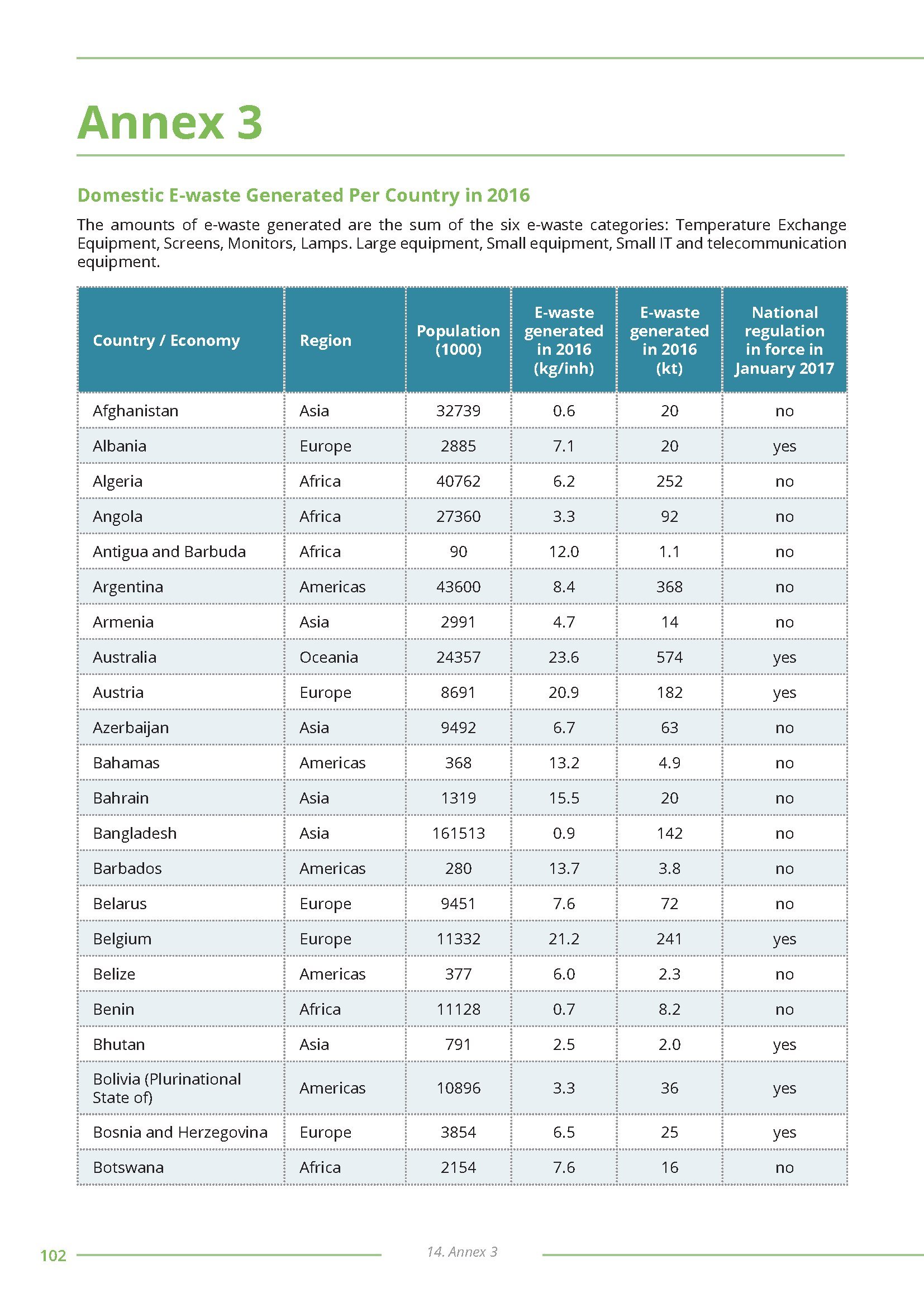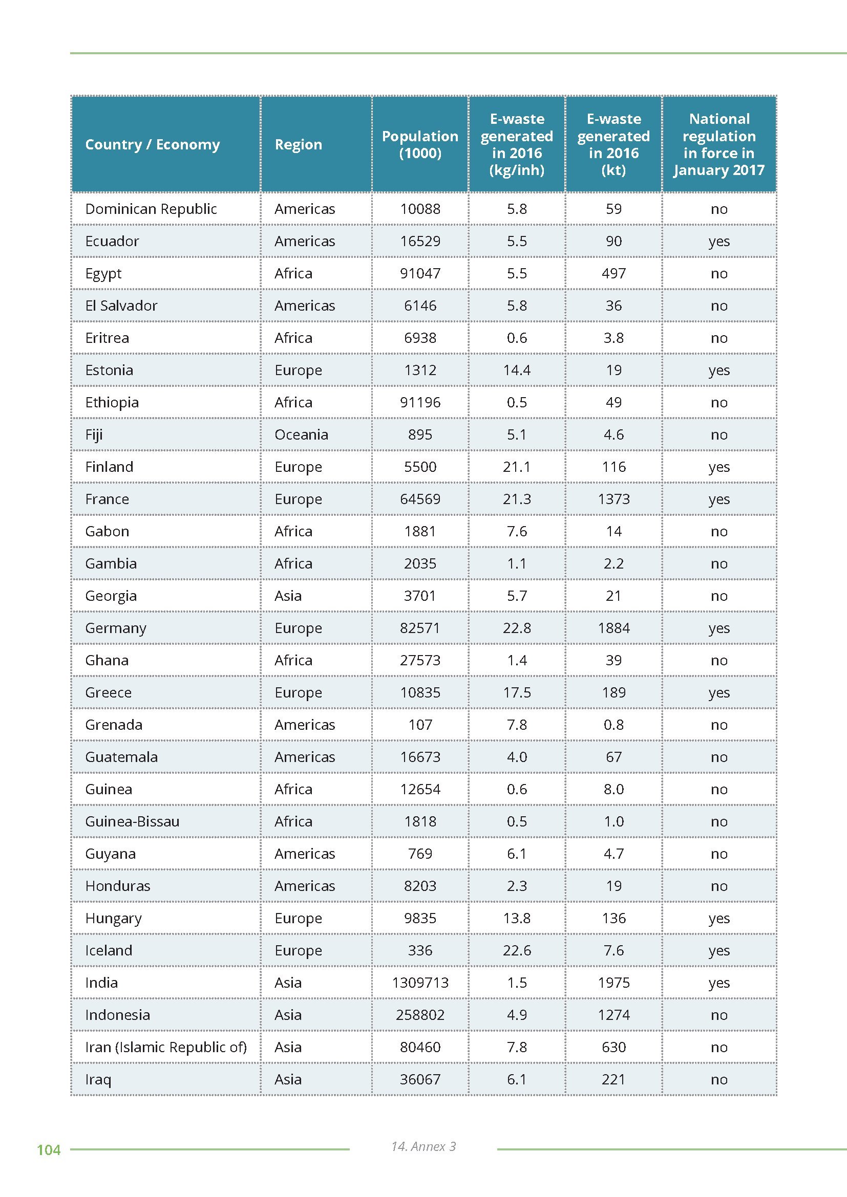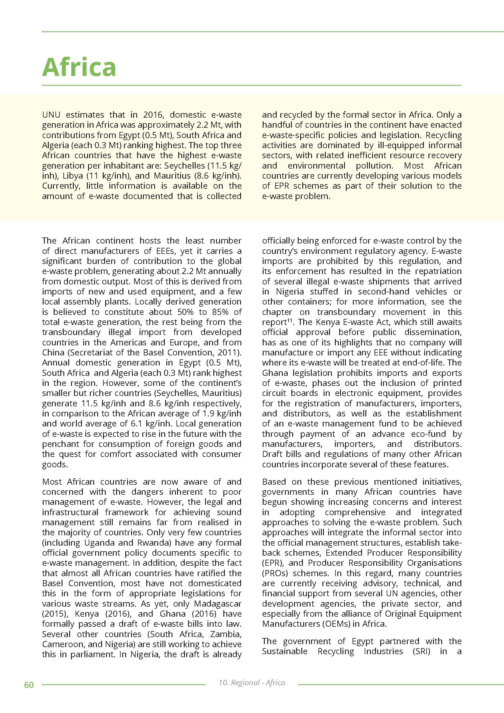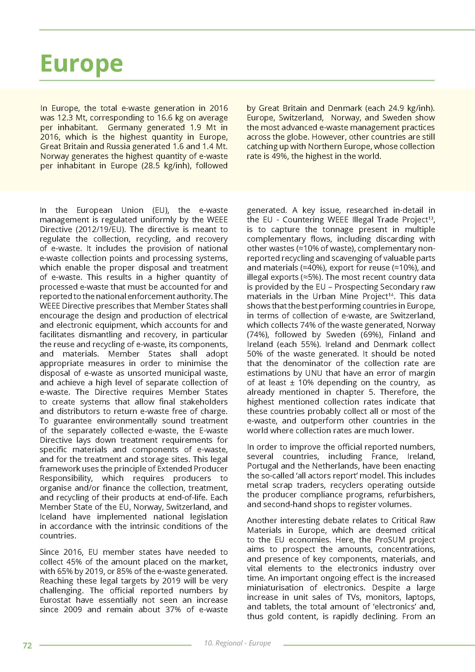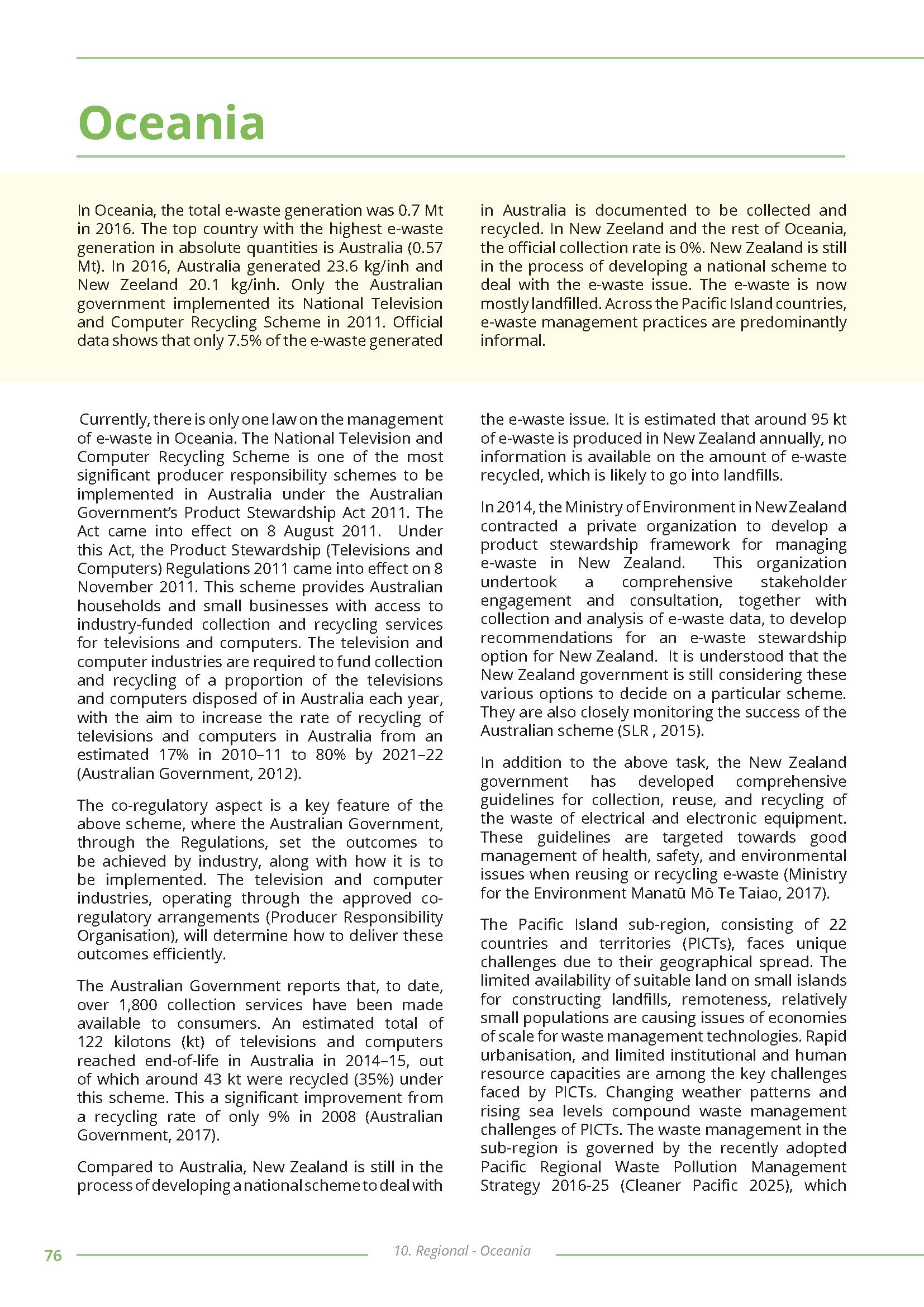 亚洲是电子垃圾生成最多的地方。2016年,亚洲产生1820万吨电子垃圾,其次是欧洲(1230万吨)、美洲(1130万吨)、非洲(220万吨)和大洋洲(70万吨)。但是,从人均电子垃圾产量方面来看,大洋洲排在首位。而欧洲的电子垃圾收集率最高(35%)。