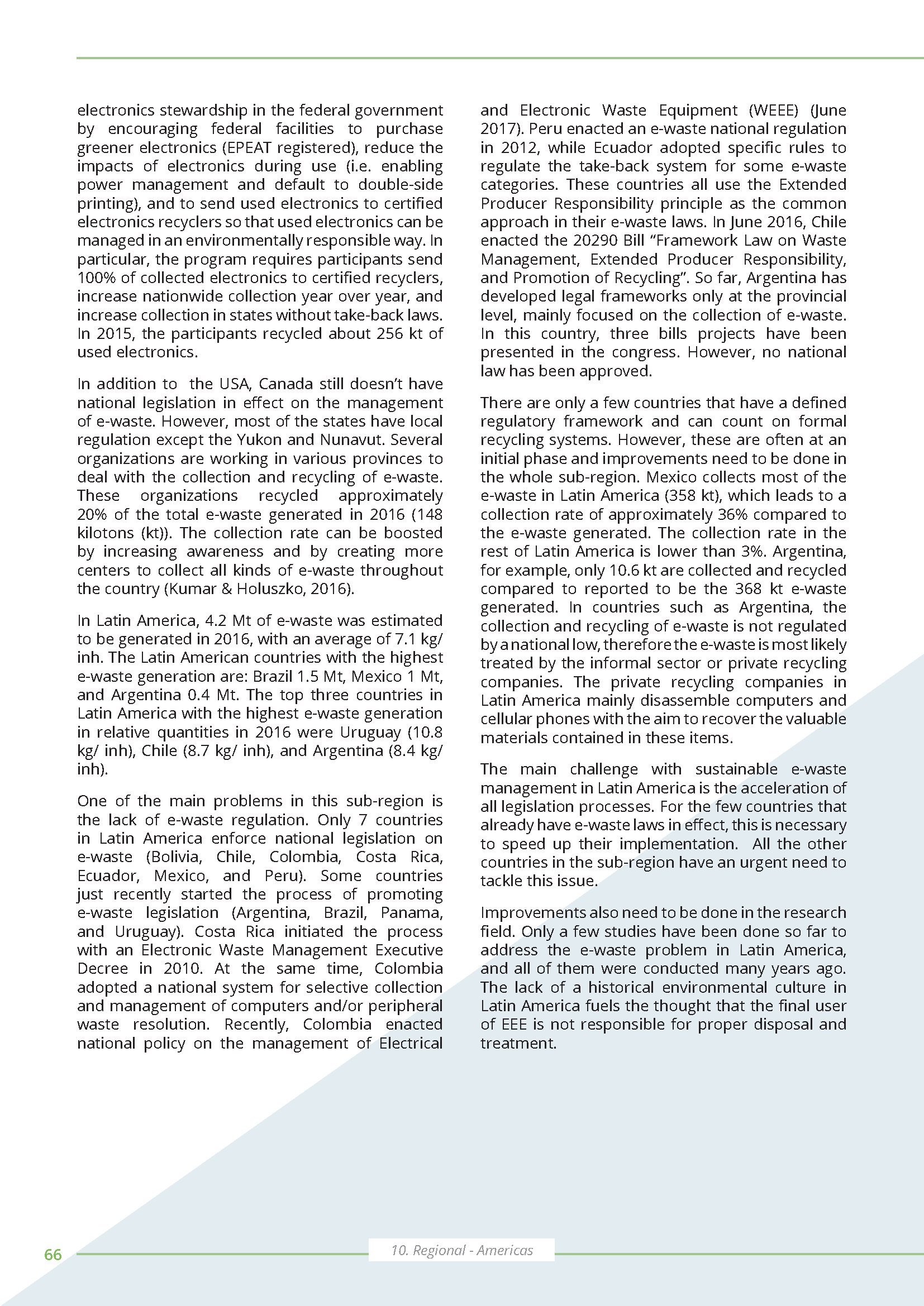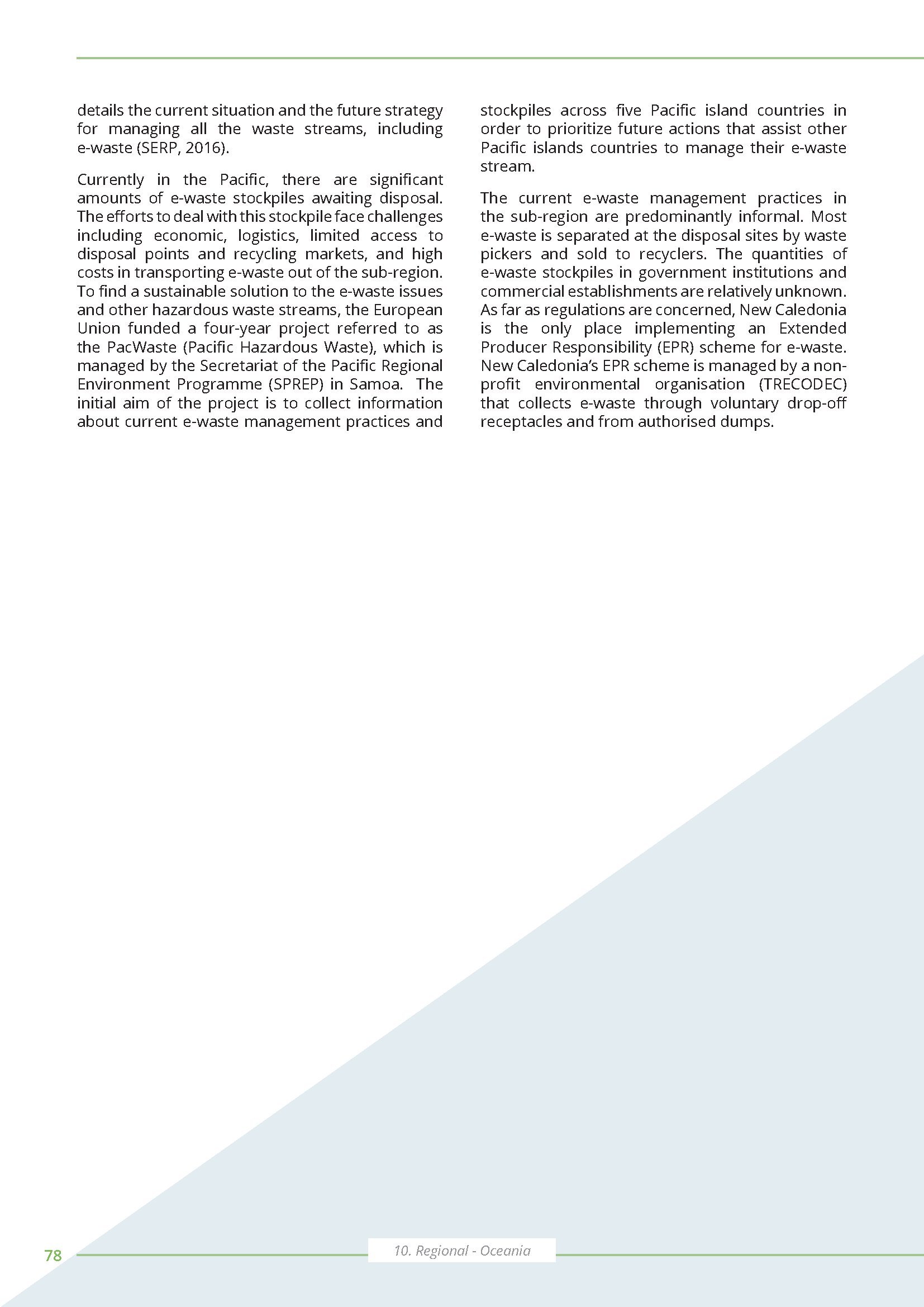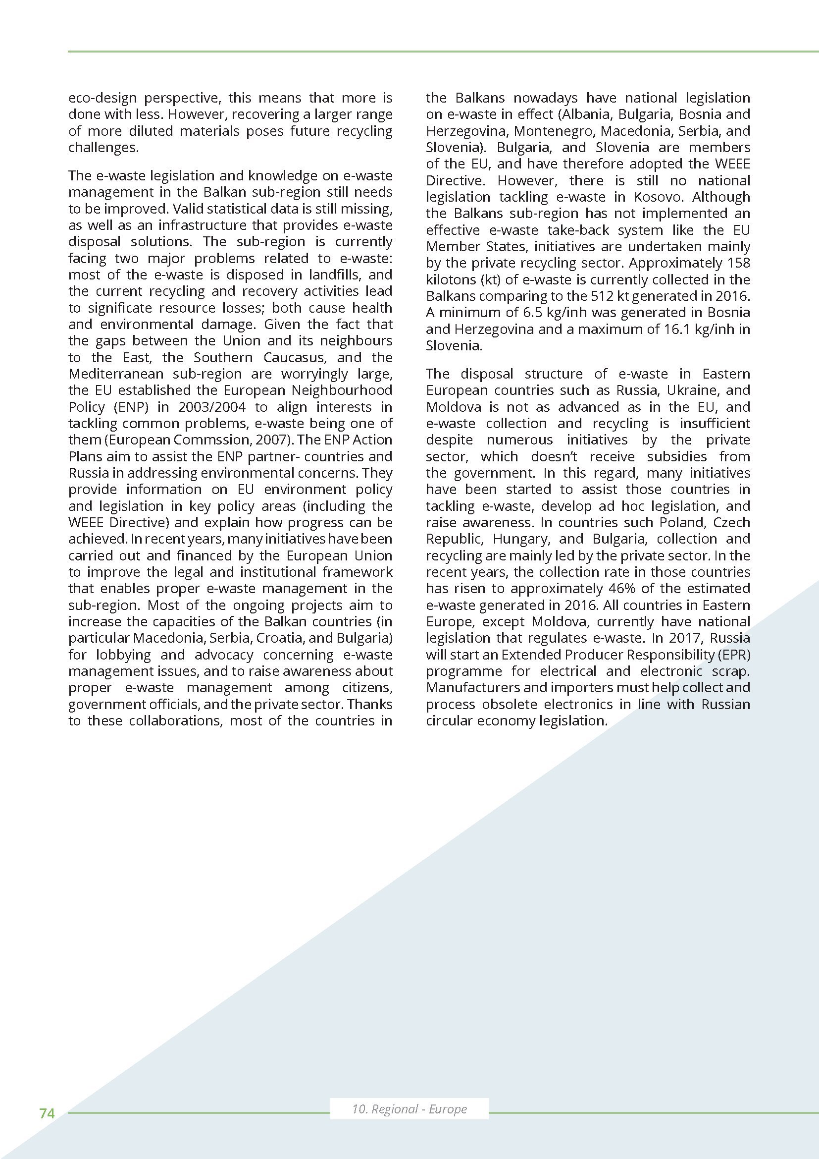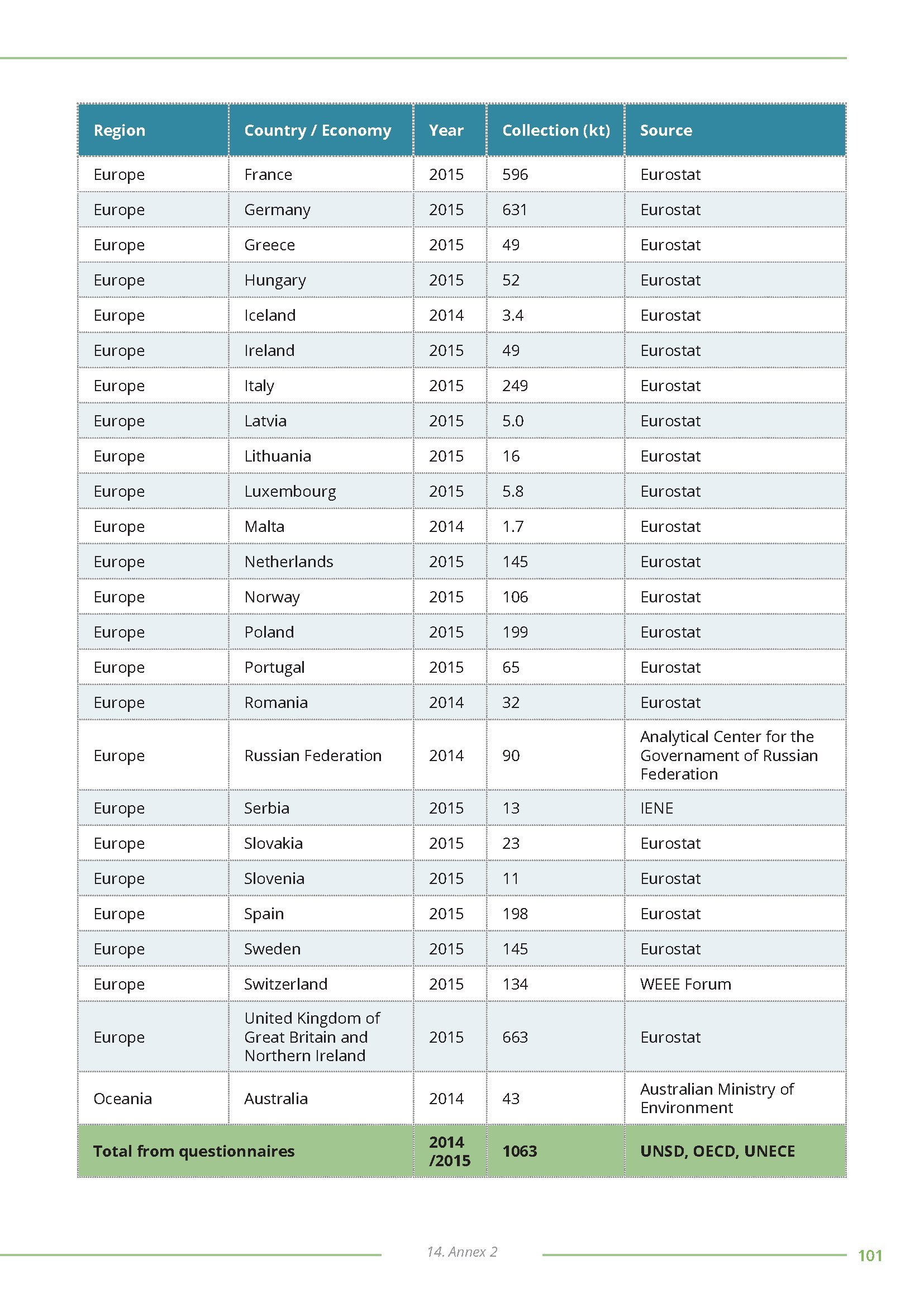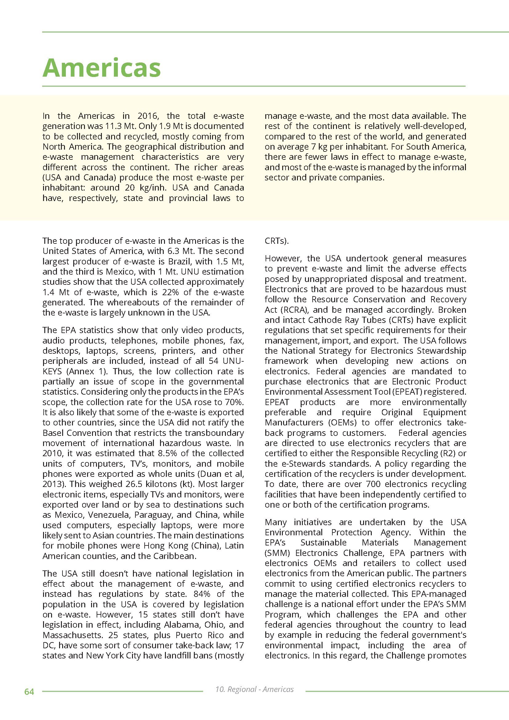 亚洲是电子垃圾生成最多的地方。2016年,亚洲产生1820万吨电子垃圾,其次是欧洲(1230万吨)、美洲(1130万吨)、非洲(220万吨)和大洋洲(70万吨)。但是,从人均电子垃圾产量方面来看,大洋洲排在首位。而欧洲的电子垃圾收集率最高(35%)。
