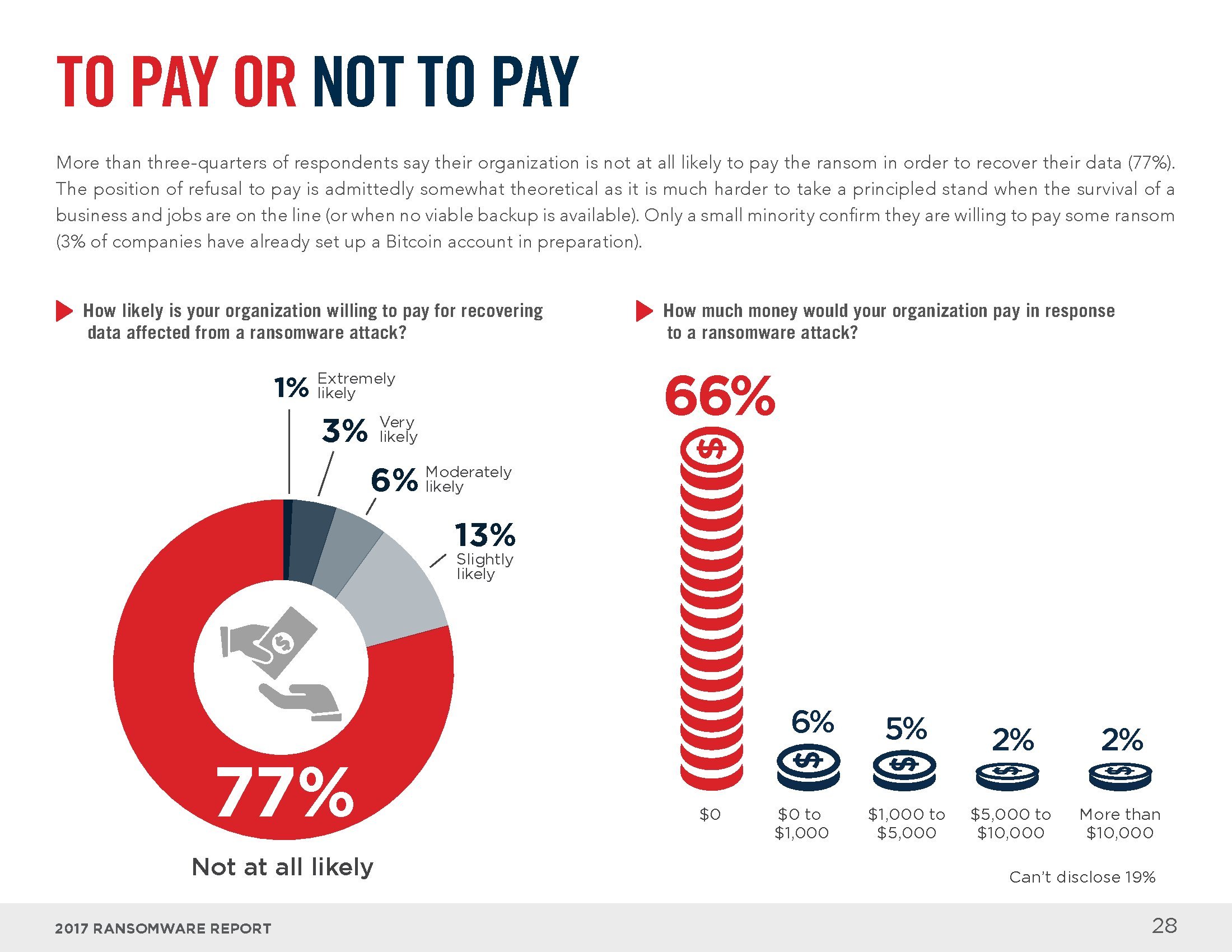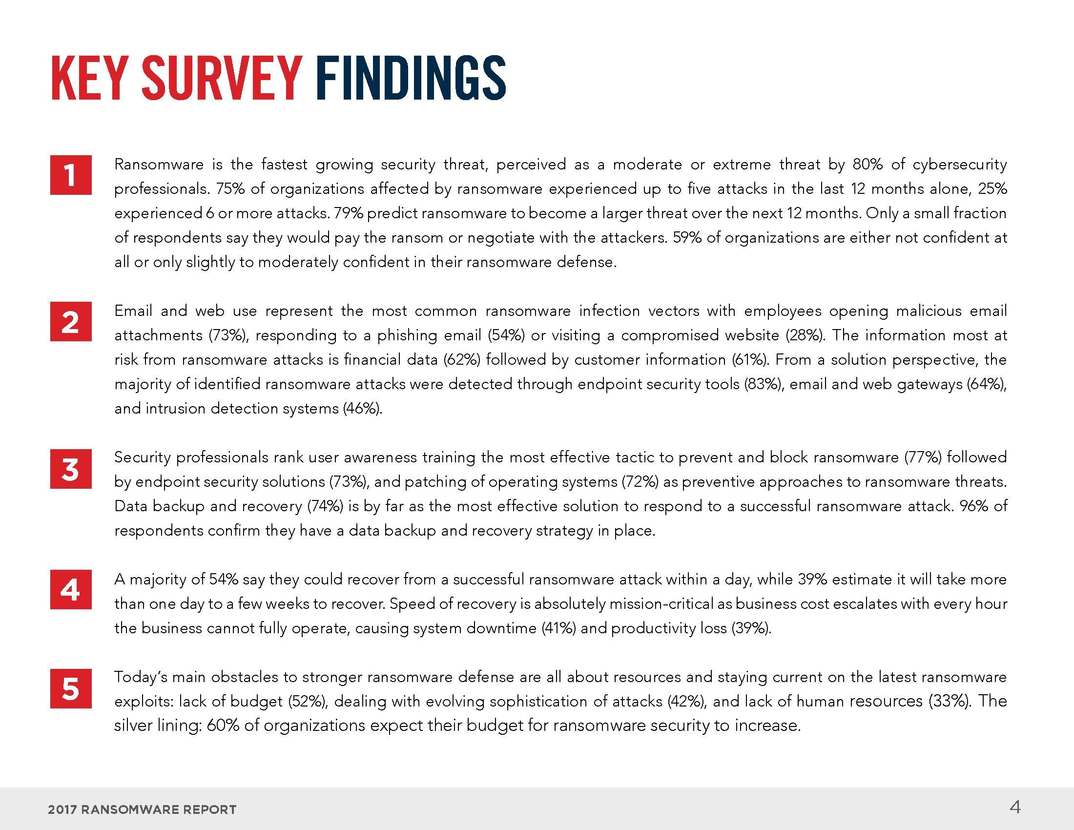 勒索软件是增长最快的安全威胁,80%的网络安全专业人士将其评价为中度或极端的威胁。在过去12个月里,受勒索软件影响的企业中有75%经历了最多五次攻击,25%遭受了6次或更多的攻击。只有一小部分企业会支付赎金或与袭击者进行谈判。