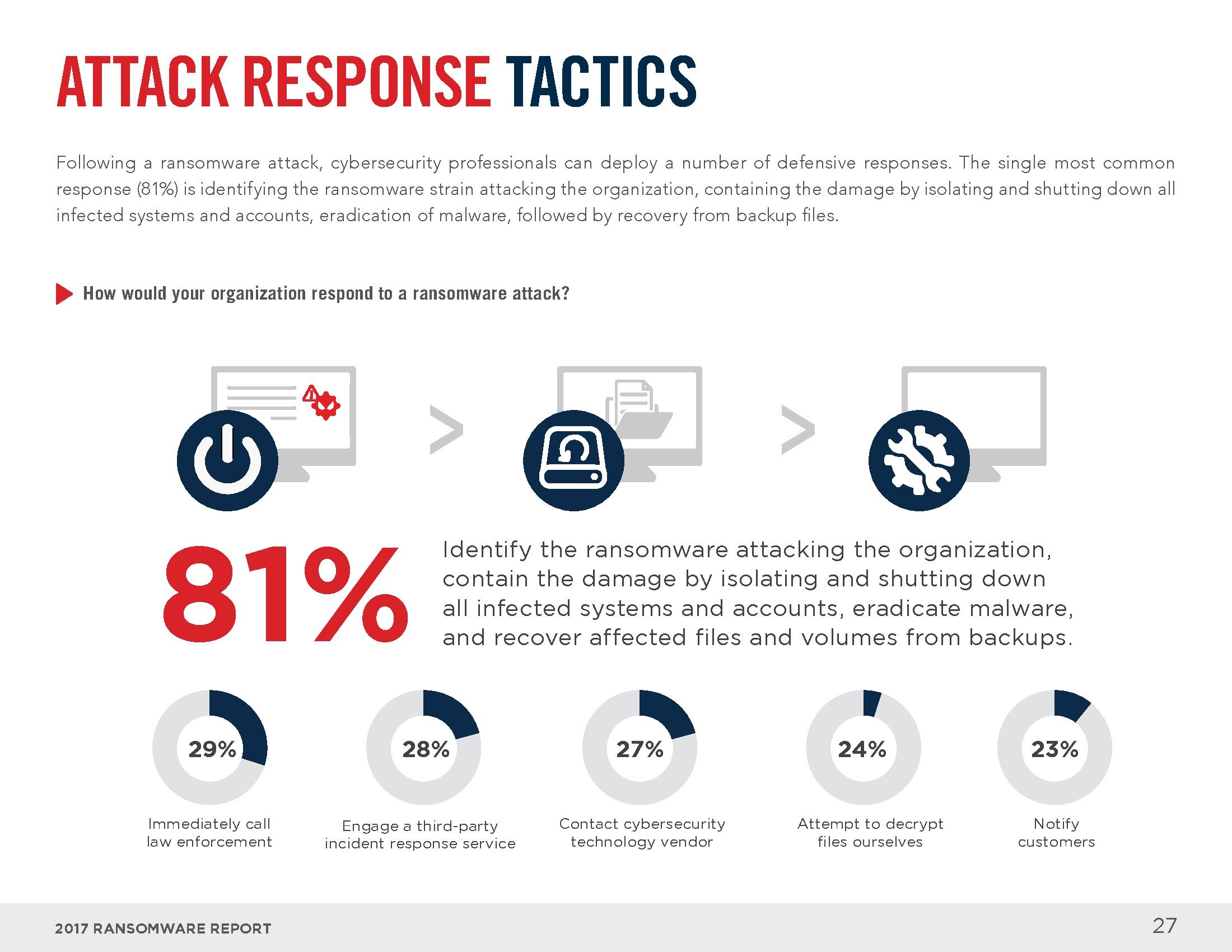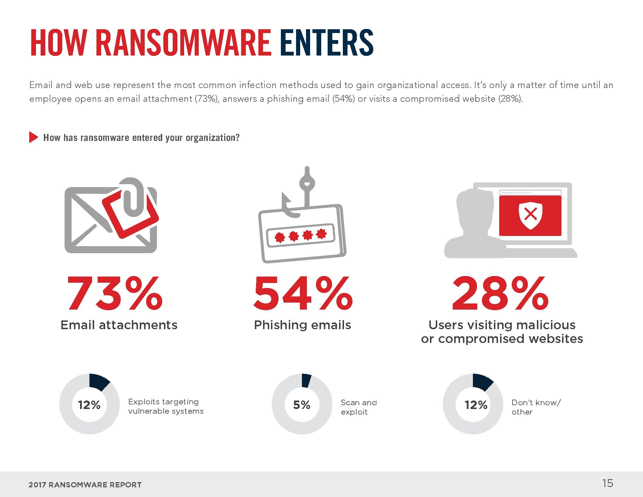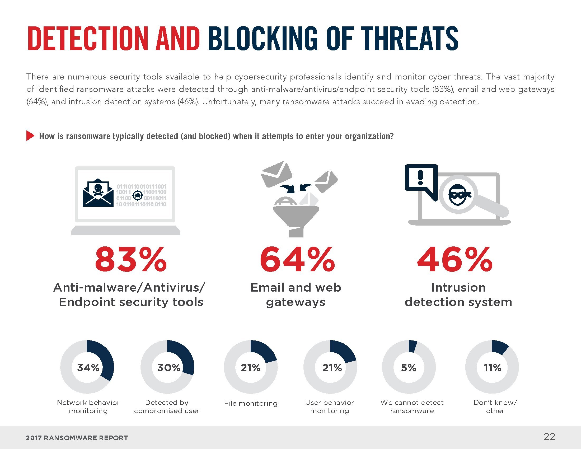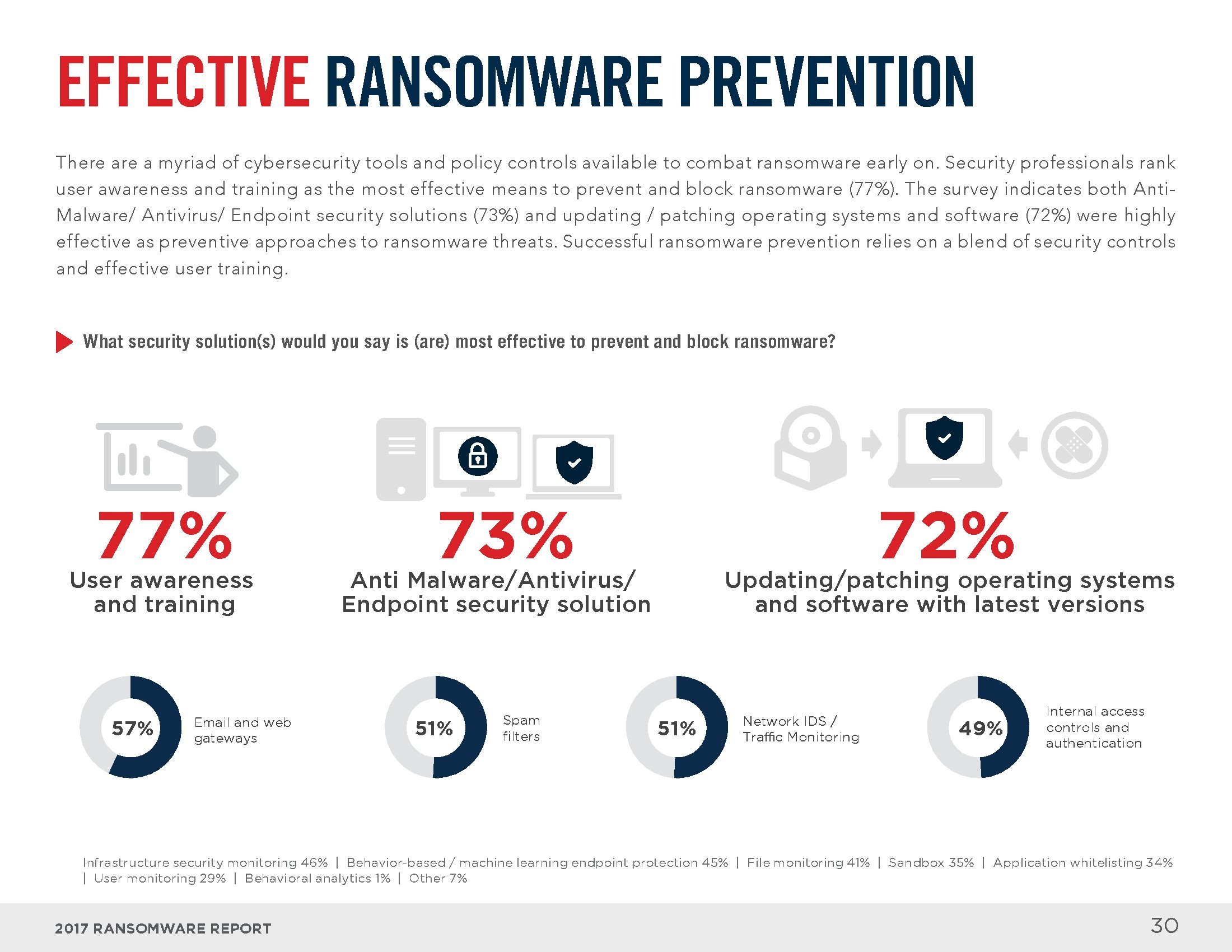 电子邮件和互联网是感染勒索软件的主要渠道。员工打开恶意邮件中的附件(73%)、回复钓鱼邮件(54%)或访问受感染的网站(28%)是感染勒索软件的最常见方式。从解决方案的角度来看,大部分人认为终端安全工具(83%)、电子邮件和网络门户(64%),以及入侵检测系统(46%)可以识别大部分勒索软件。
