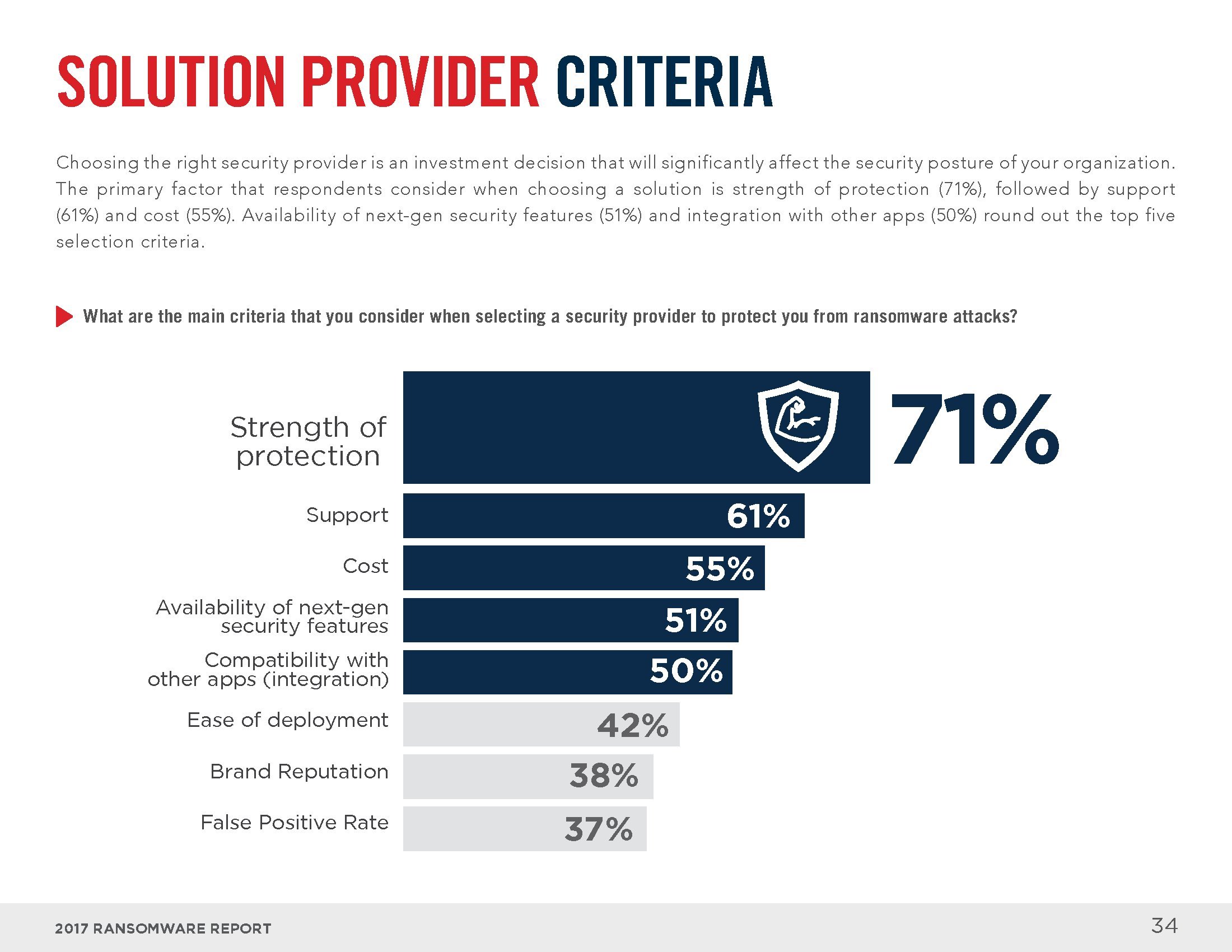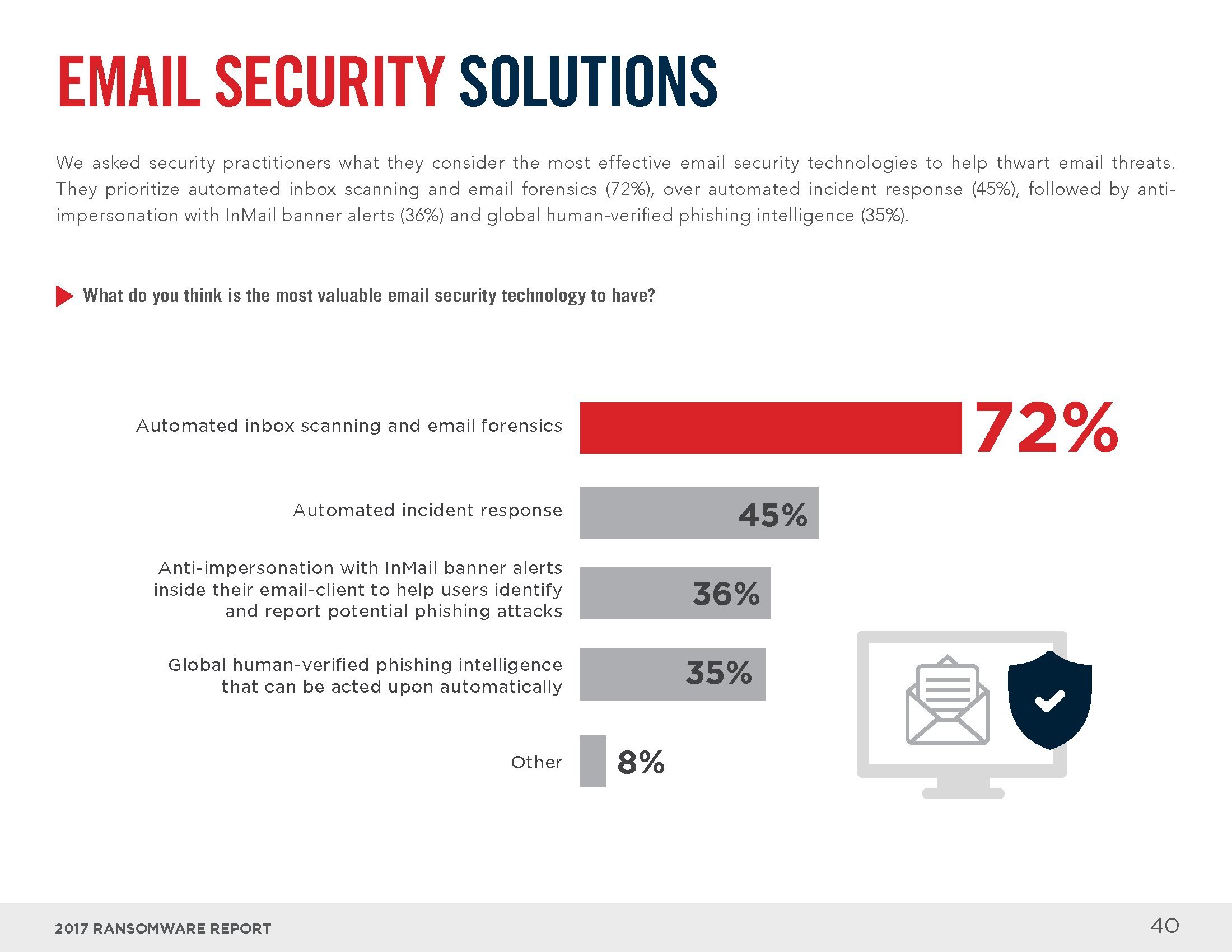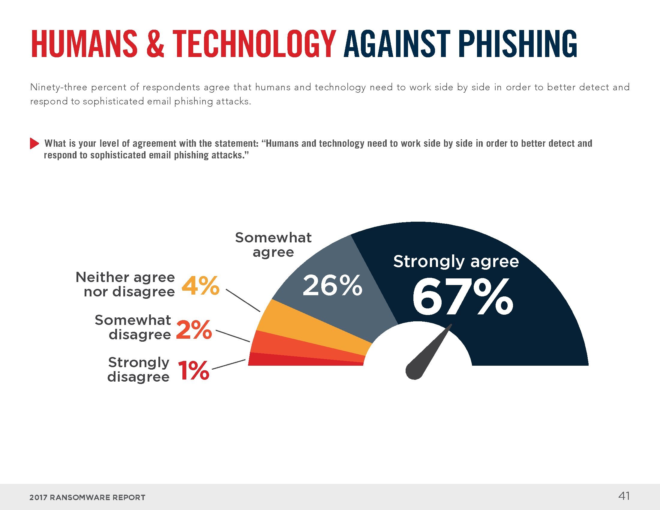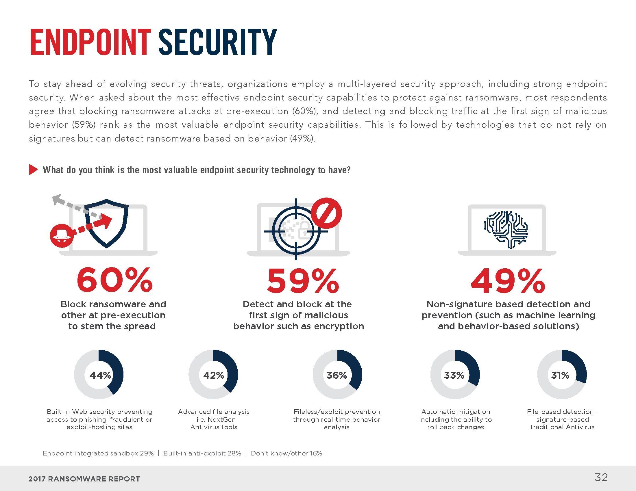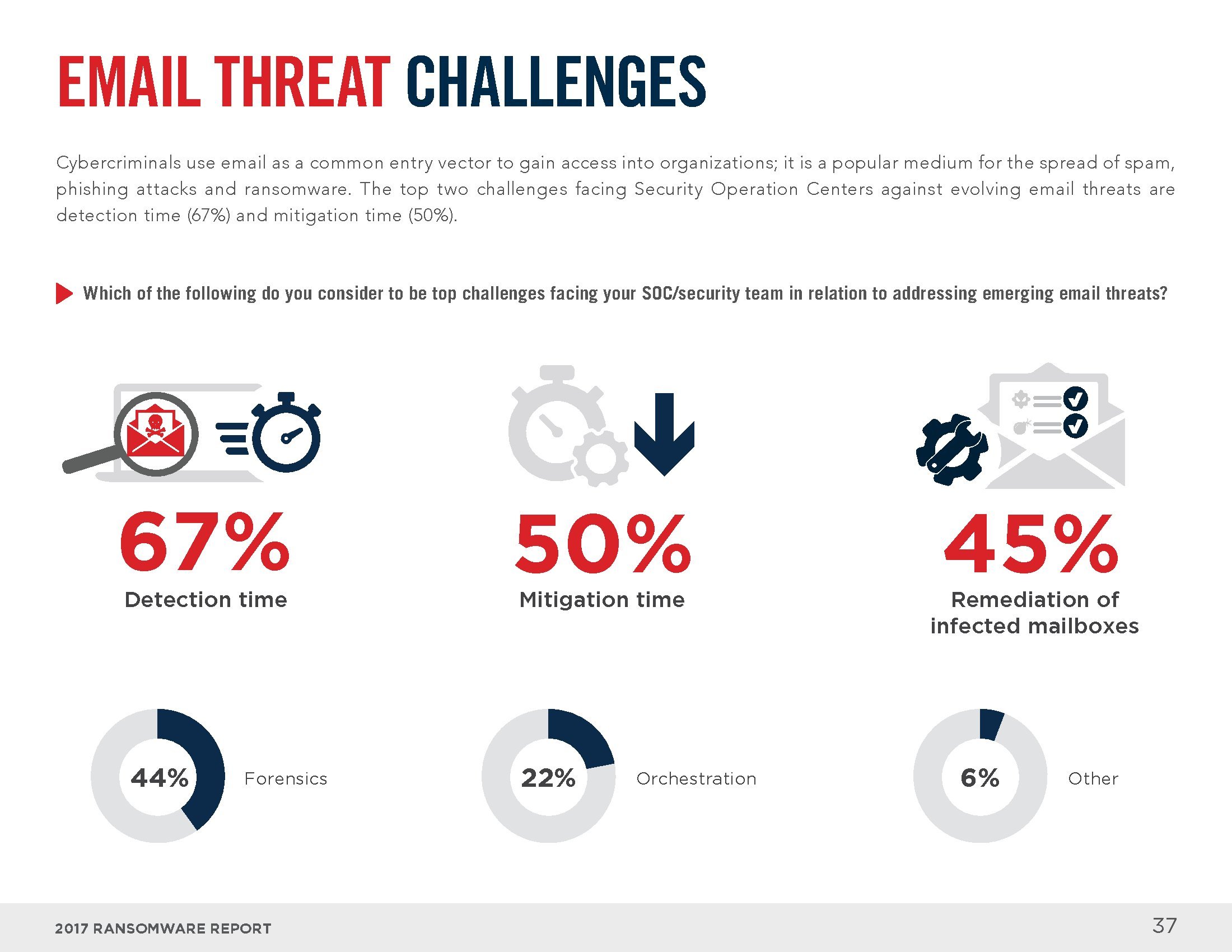 电子邮件和互联网是感染勒索软件的主要渠道。员工打开恶意邮件中的附件(73%)、回复钓鱼邮件(54%)或访问受感染的网站(28%)是感染勒索软件的最常见方式。从解决方案的角度来看,大部分人认为终端安全工具(83%)、电子邮件和网络门户(64%),以及入侵检测系统(46%)可以识别大部分勒索软件。