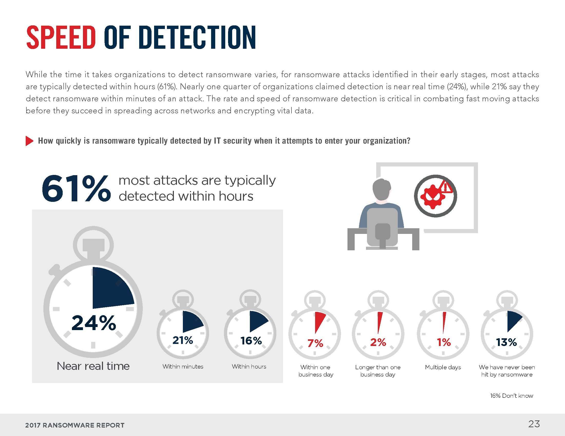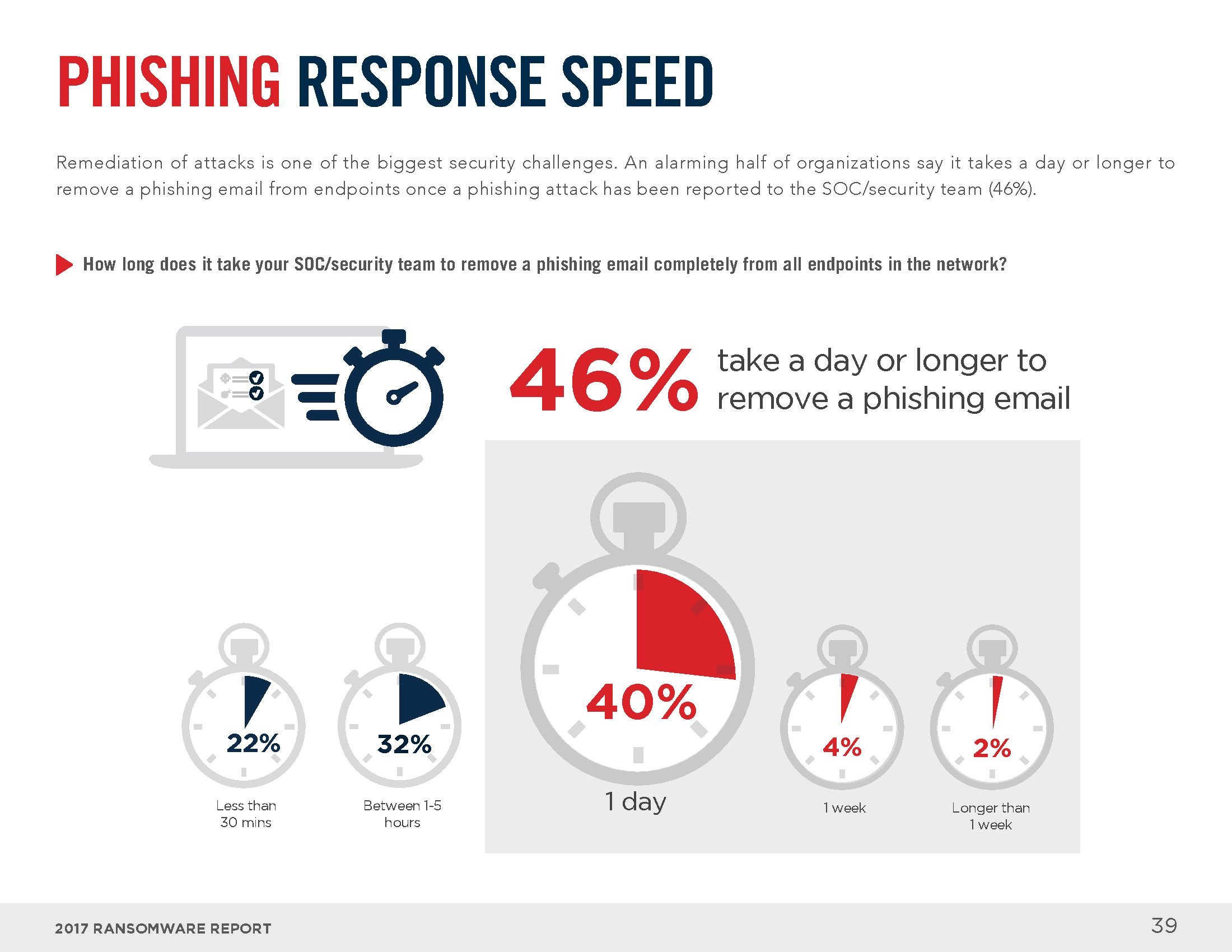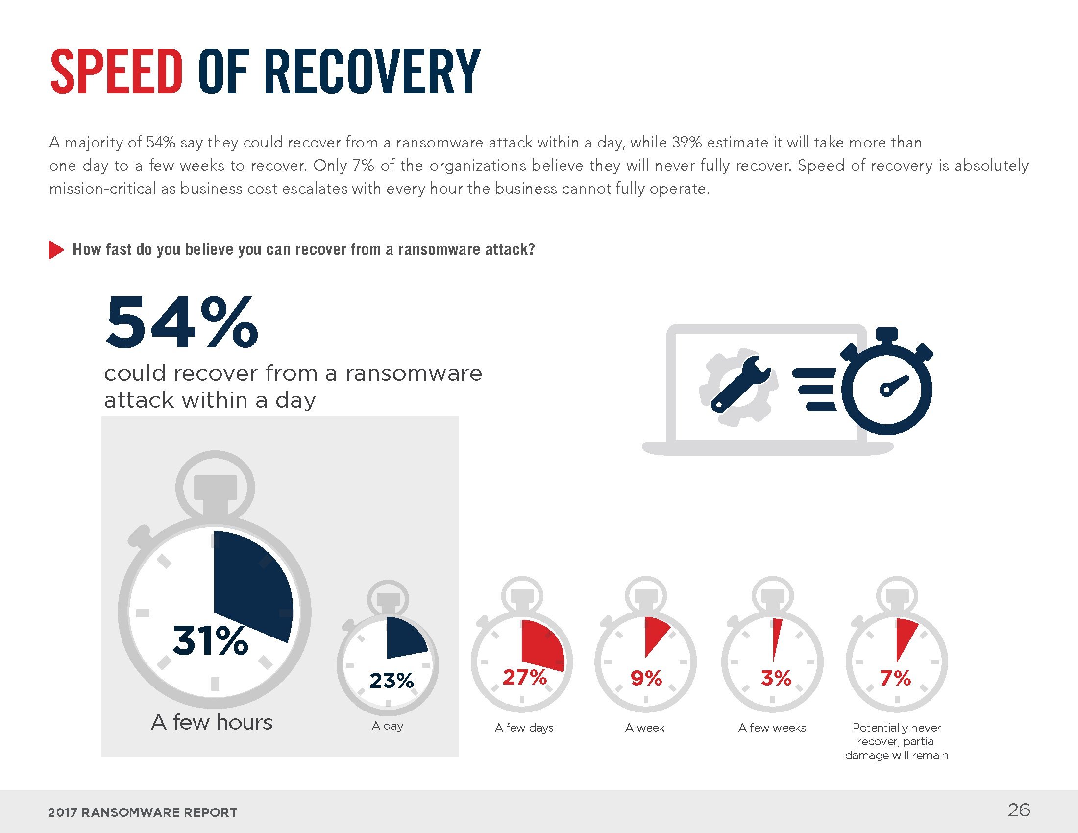 54%的受访者可以在一天之内从勒索软件攻击中恢复,39%的受访者需要一天以上的时间。