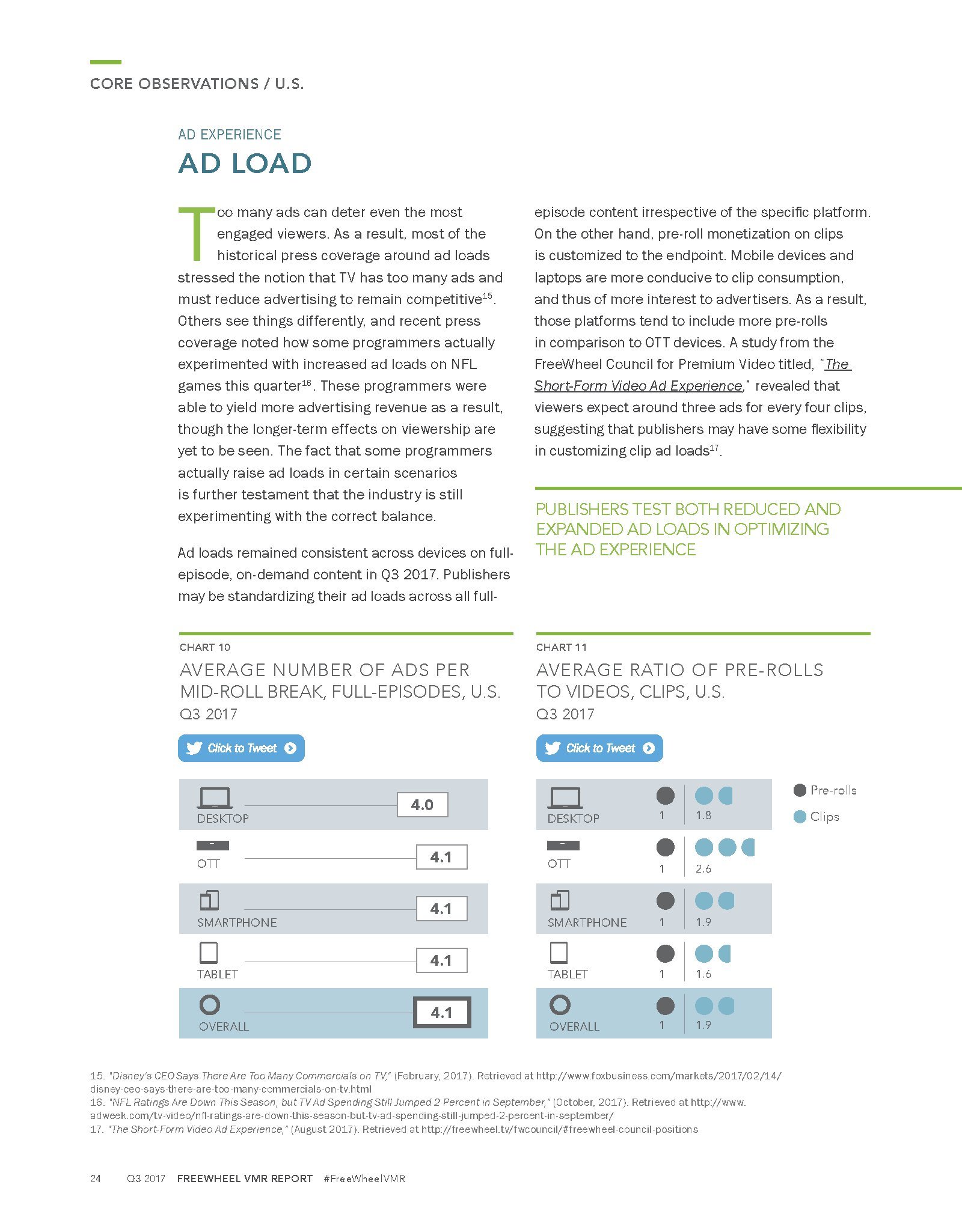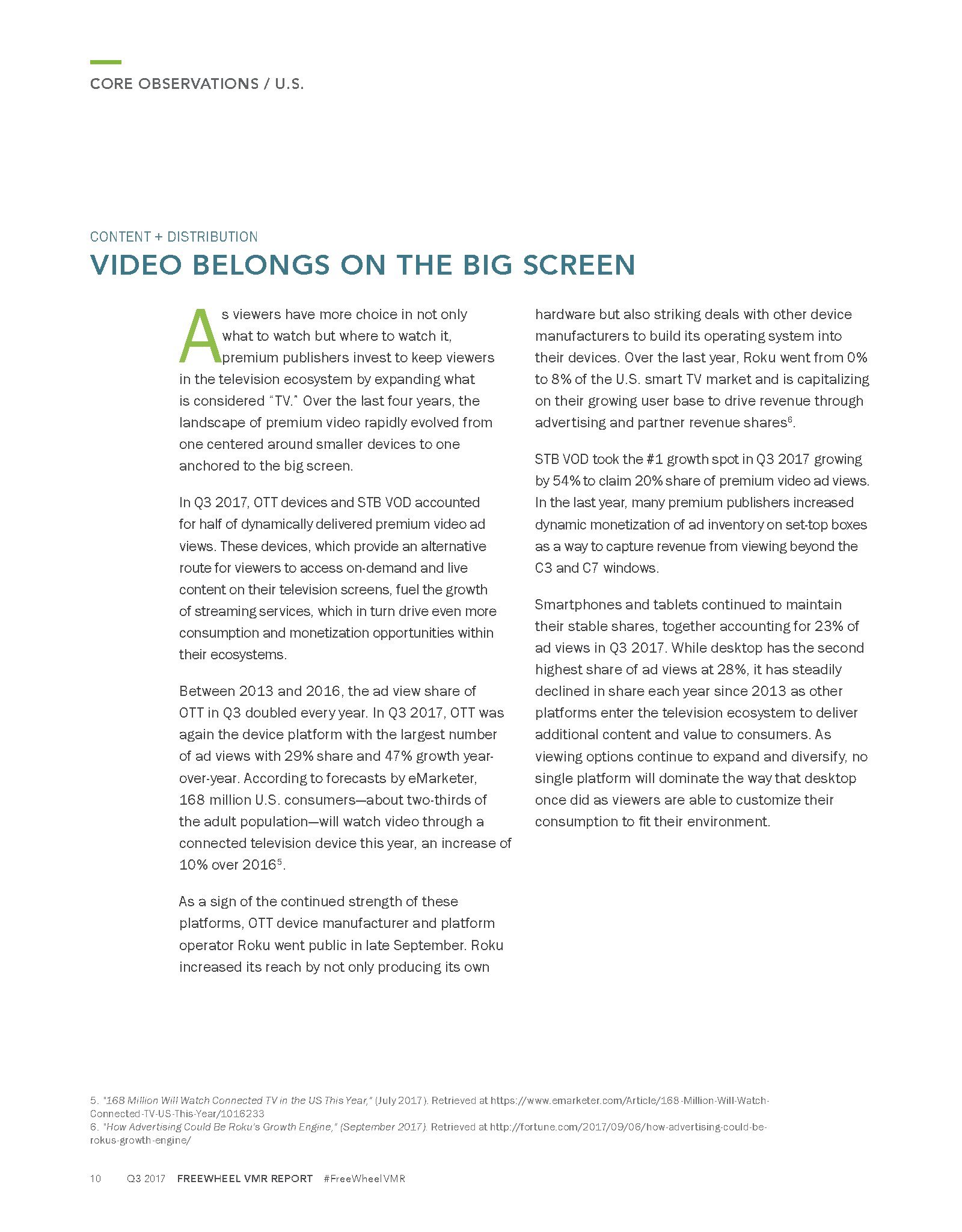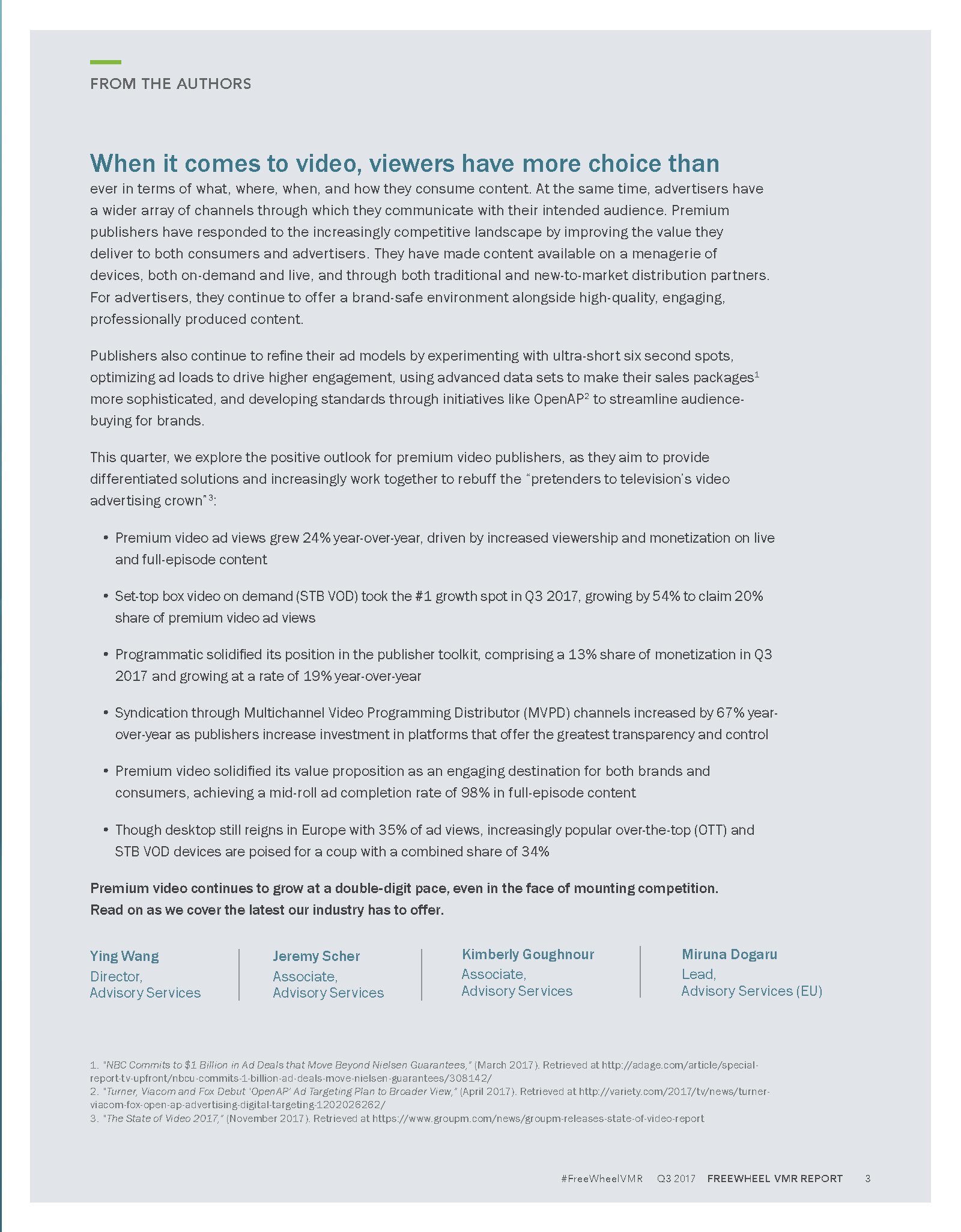 FreeWheel发布了“2017年第三季度网络视频广告报告”。谈到视频,观众有更多选择,在任何时间、任何地点、用各种渠道收看视频。广告主也有更多的渠道接触目标受众。但是,发行商也需要不断地创新,以应对日益激励的竞争格局。例如,发行商通过实验超短的6秒钟广告,改进广告模式、优化广告负载,以提高参与度等。FreeWheel在第三季度的报告中分析了优质视频广告发行商,因为他们致力于提供差异化的解决方案。