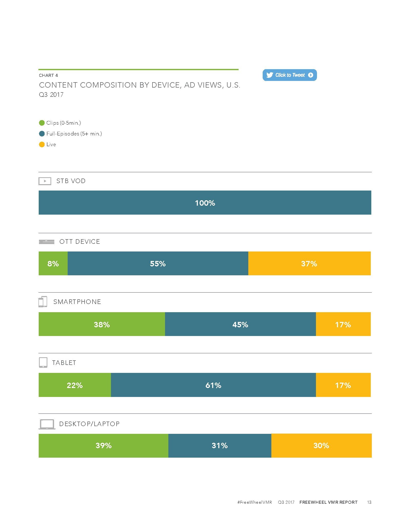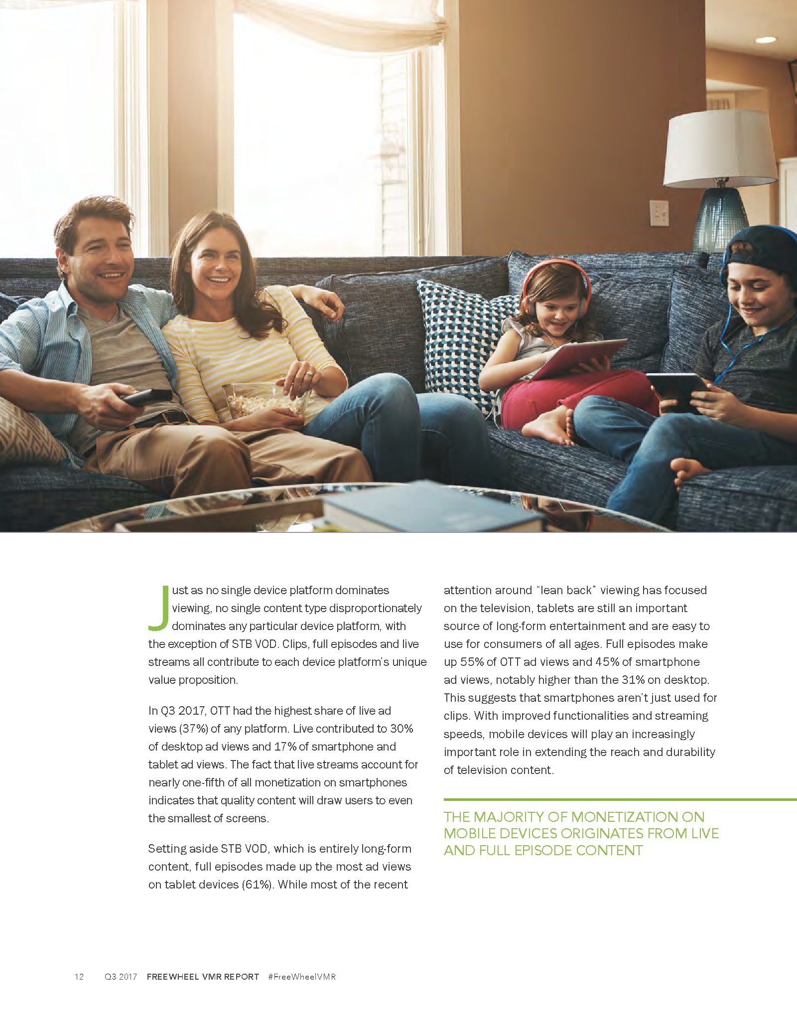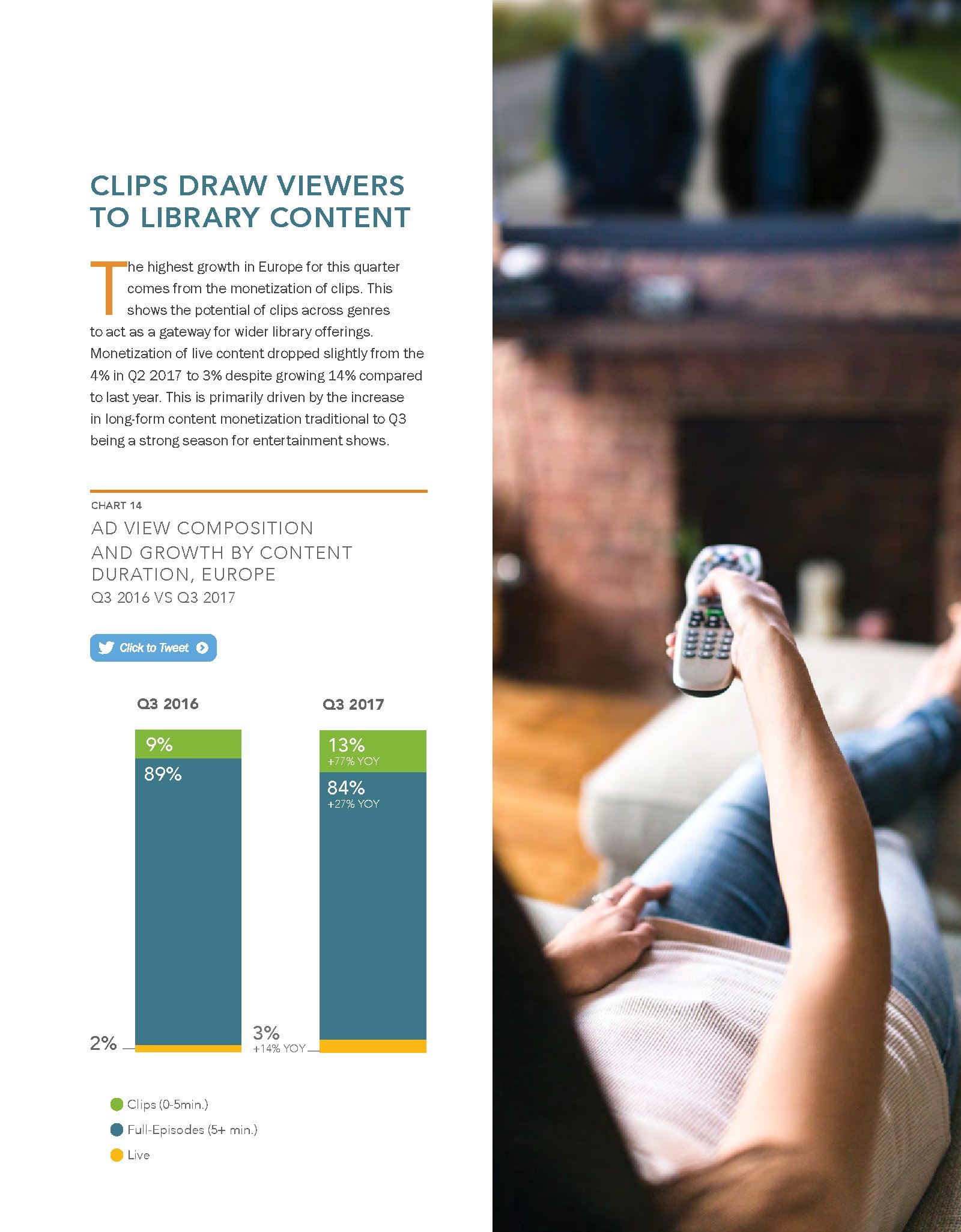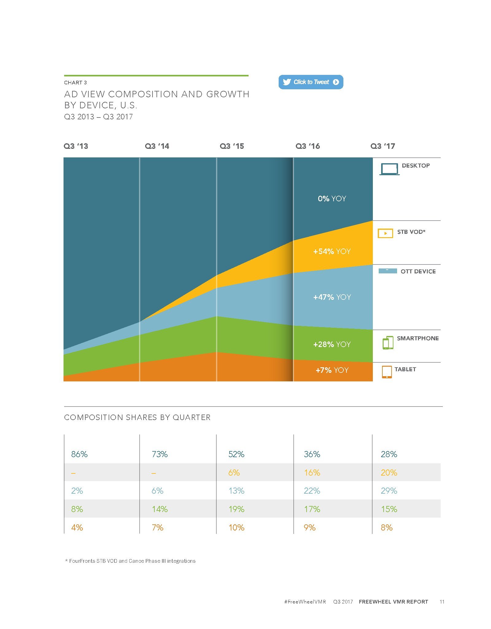 2017年第三季度,机顶盒视频点播(STB VOD)是增长最快的,增长了54%,占优质视频广告收视量的20%。