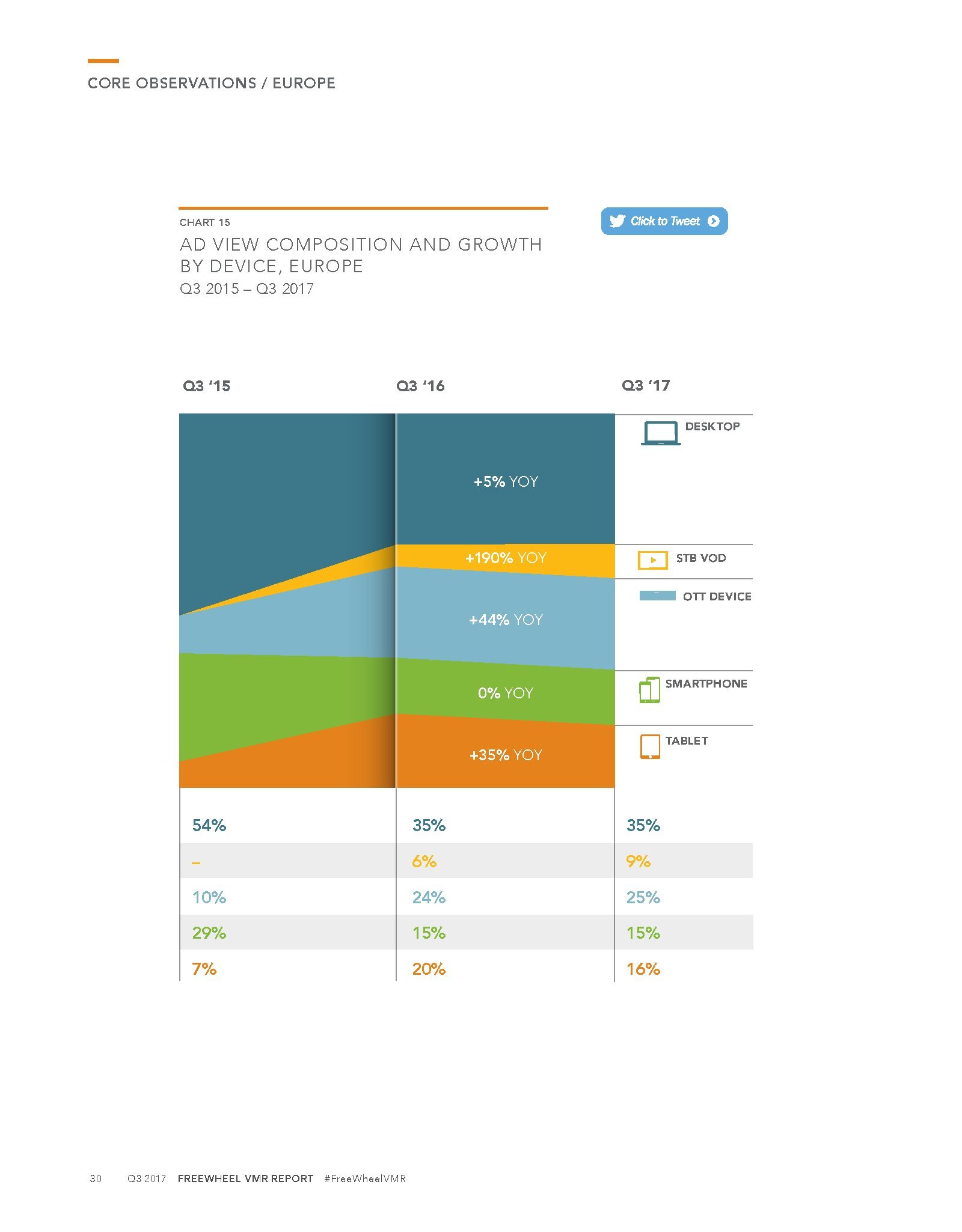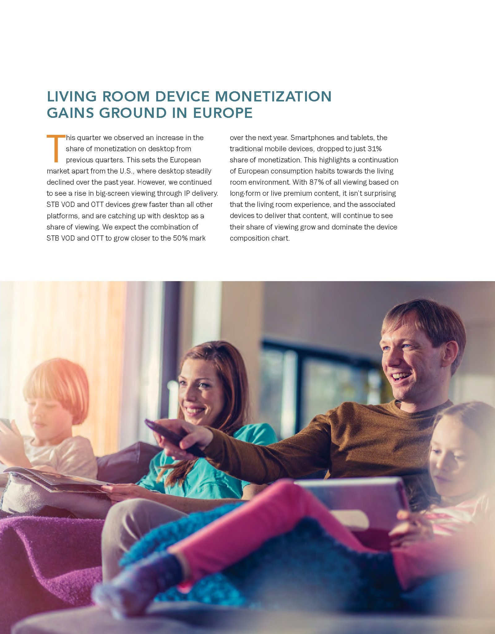 虽然PC为欧洲视频广告贡献了35%的收视量,但是,OTT和机顶盒设备视频点播越来越受欢迎,合起来占视频广告收视量的34%。