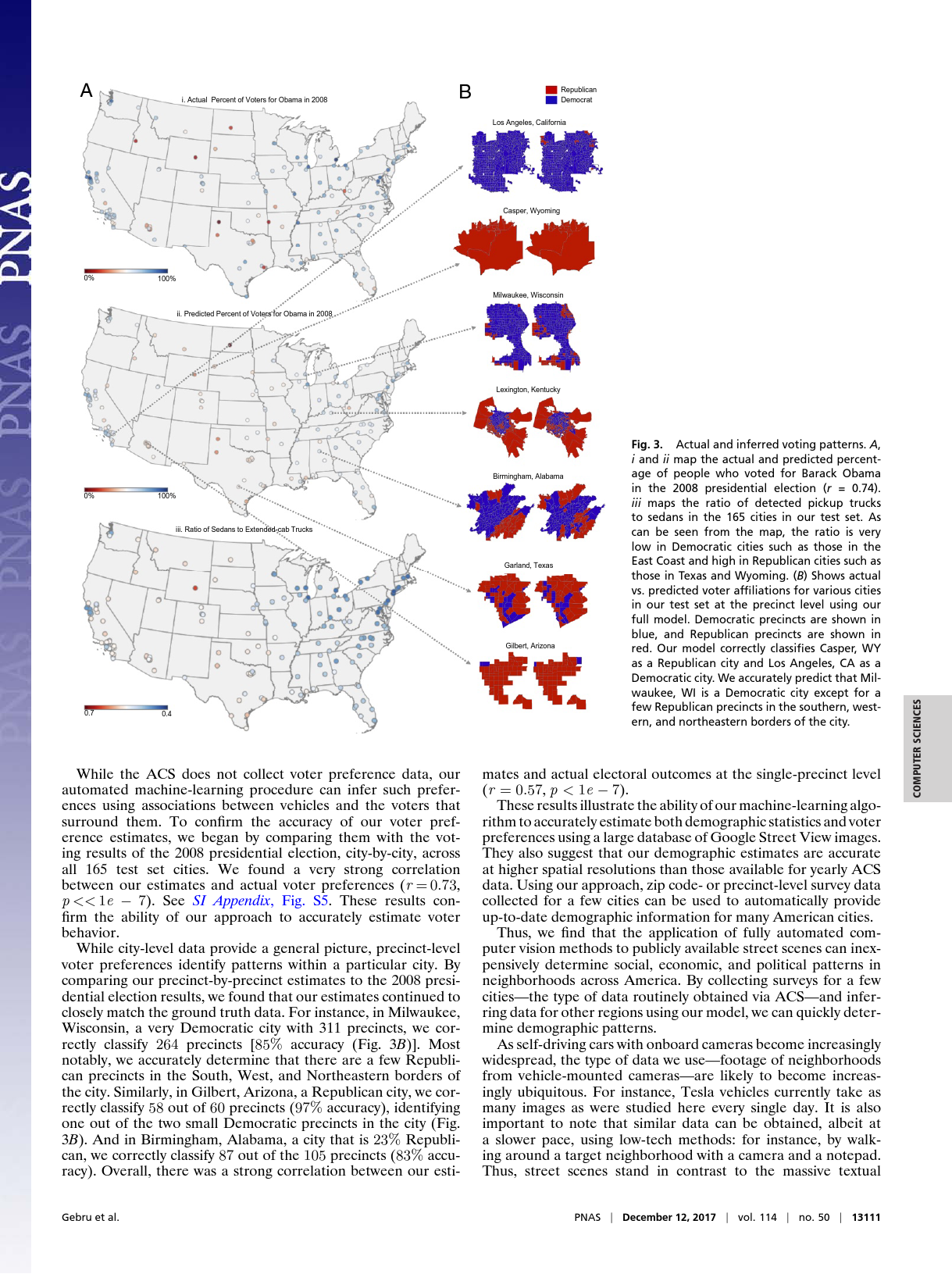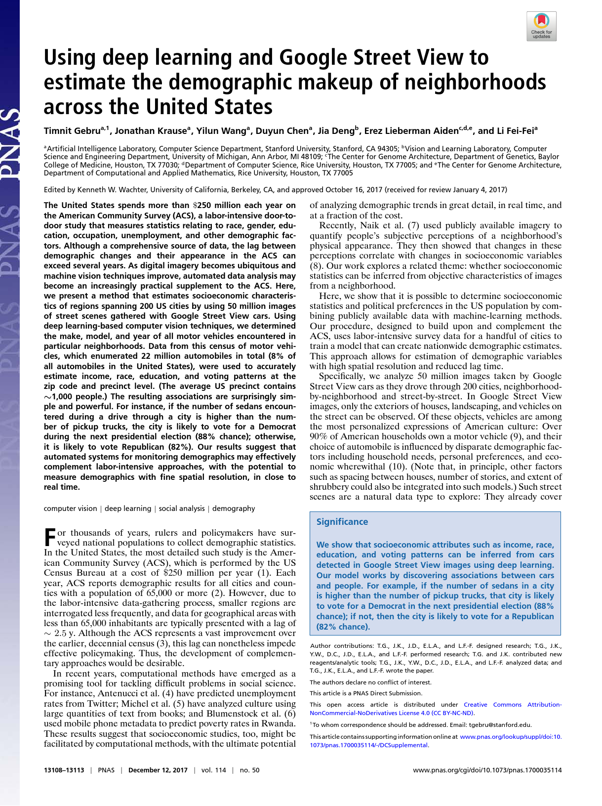 比如在最近的11月份,他们就在《美国国家科学院学报》上,发表了一篇题为《借助深度学习和谷歌街景来预估全美社区人口组成》的文章。