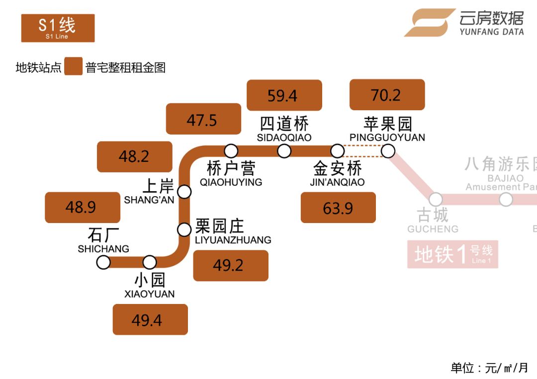租金最贵地铁站:苹果园(70.2元/㎡/月)