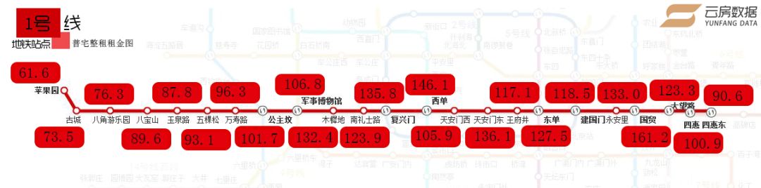 租金最低地铁站:苹果园(61.6元/㎡/月)