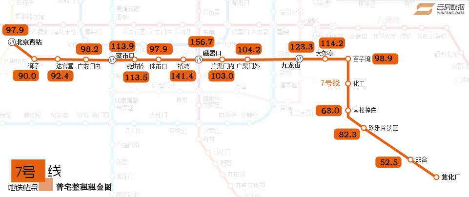 租金最贵地铁站:七里庄(82.0元/㎡/月)
