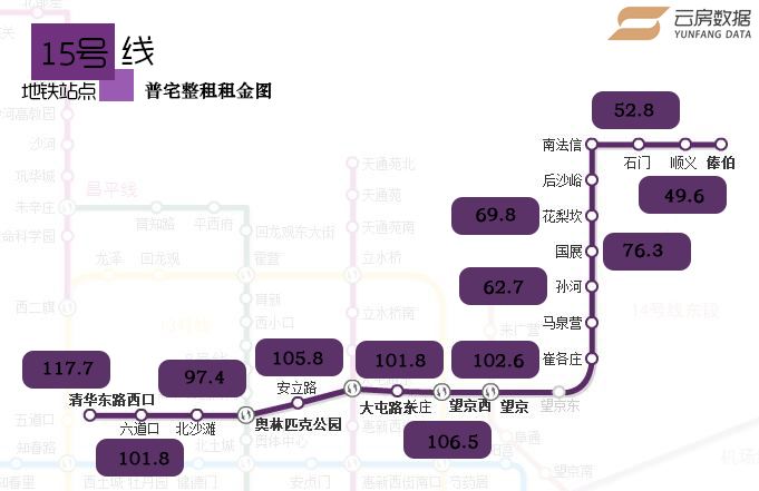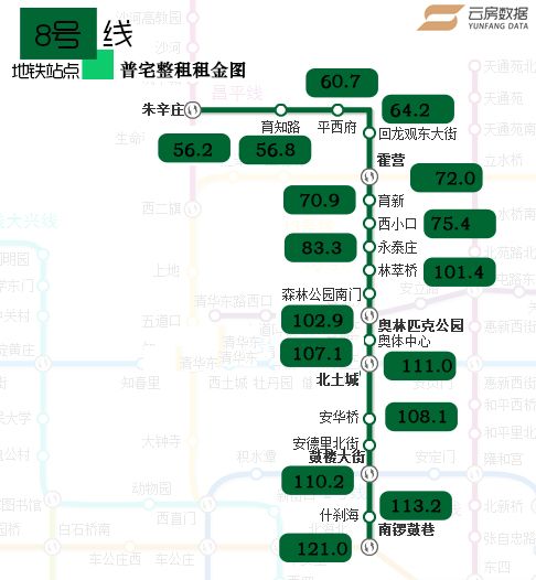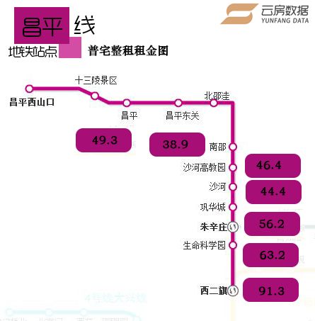 租金最低地铁站:朱辛庄(56.2元/㎡/月)