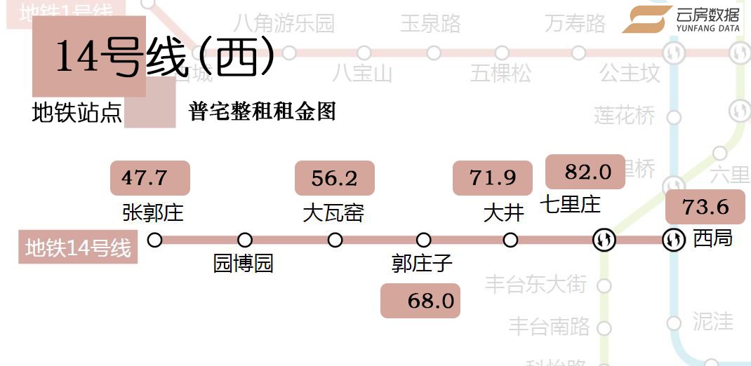 租金最低地铁站:张郭庄(47.7元/㎡/月)