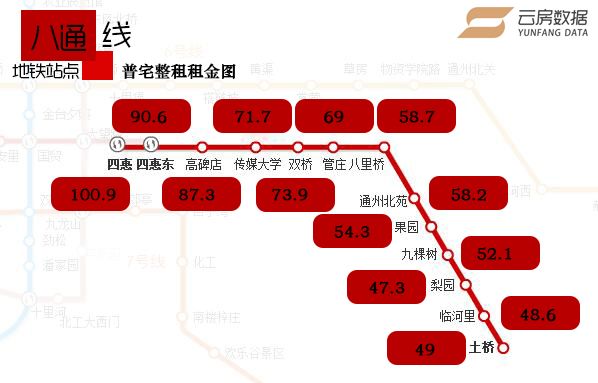 租金最贵地铁站:四惠(100.9元/㎡/月)