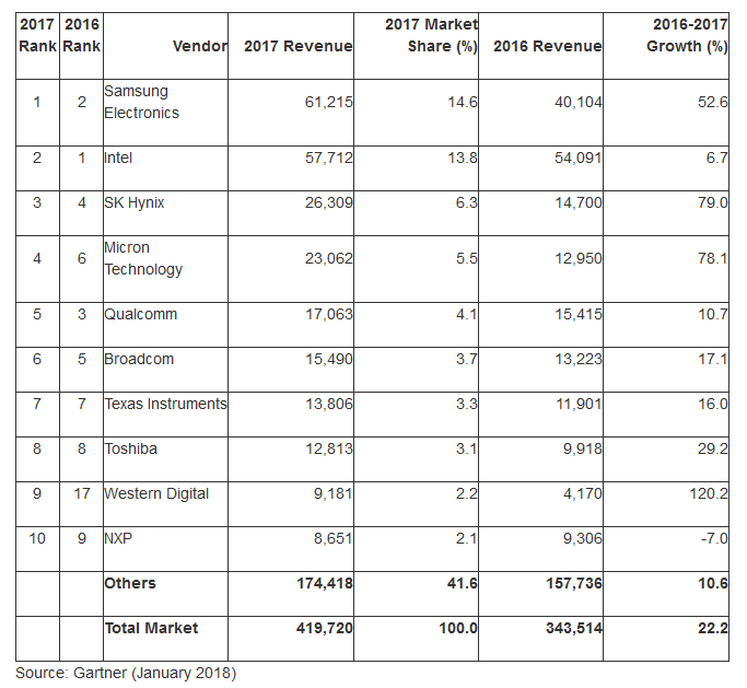 Gartner研究副总裁Andrew Norwood表示:“最大的内存供应商三星电子占有最大的市场份额,取代英特尔排名第一,这是自1992年以来英特尔在半导体行业领导地位首次被取代。2017年,内存为半导体收入增长贡献了2/3以上,成为最大的分支。”