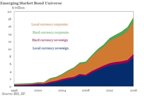 IFF还观察到,自2016年以来,新兴市场债券发行规模已经从2.2万亿美元增加到了18.4万亿美元,但是只有25%的债券可以通过基准债券指数来追踪交易。