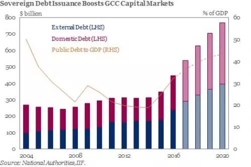 最后,这可能是最令人担忧的一张图,对于那些海湾地区石油出口国如何为自己的预算提供资金,并避免国家经济陷入衰退以及国家秩序陷入混乱,答案就是大幅增加新债发行。