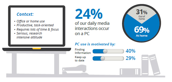 PC让我们的工作效率更高,信息获取更方便:我们24%的媒体时间用在PC上,家庭和办公场所是使用PC的主要场合,使用PC主要是获取信息