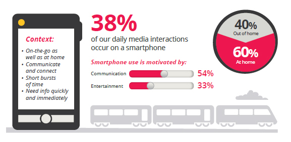 智能手机则让我们时刻连接:我每天与媒体的互动中,有38%花在智能手机上,沟通和娱乐是我们使用智能手机的主要目的