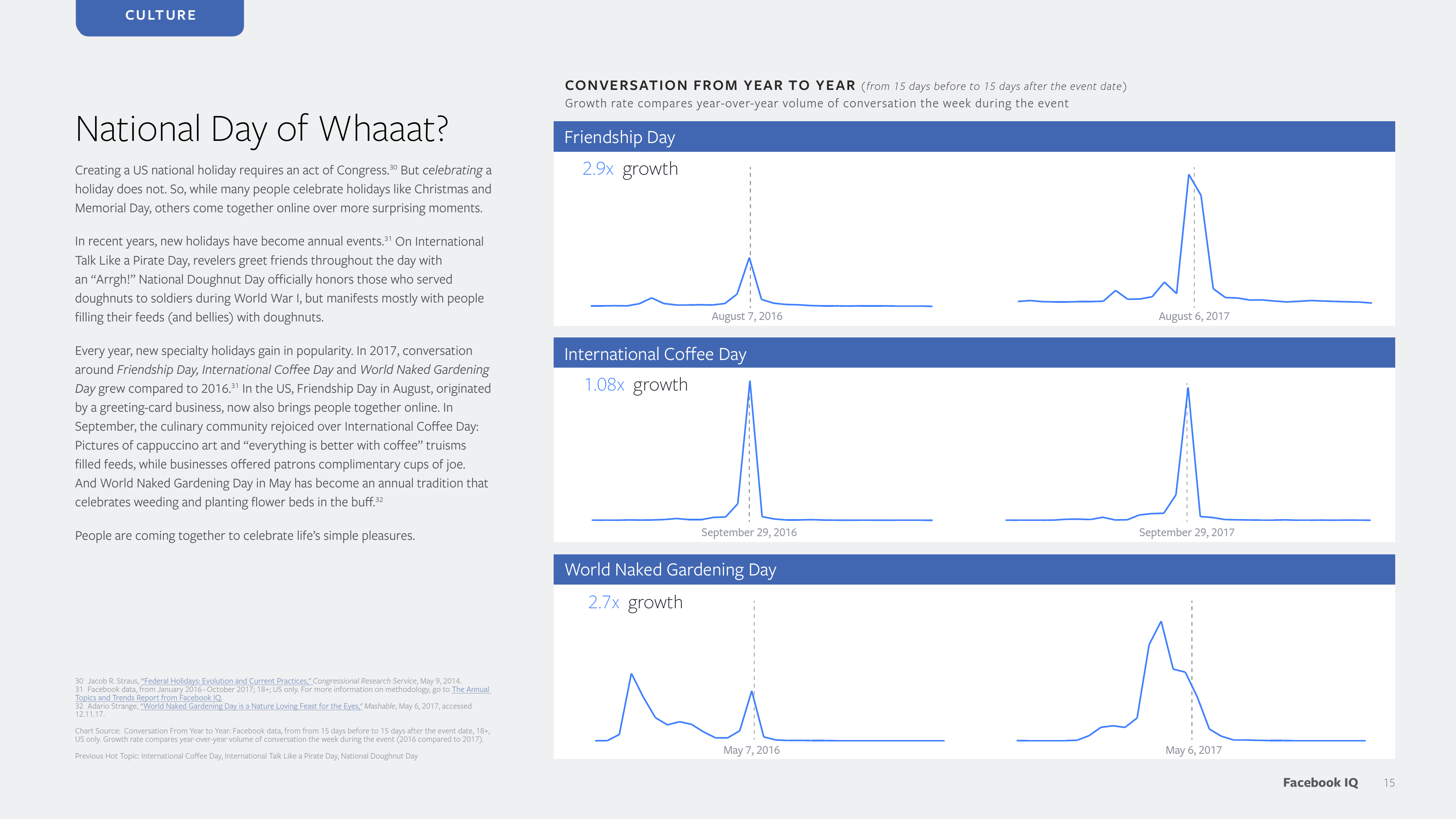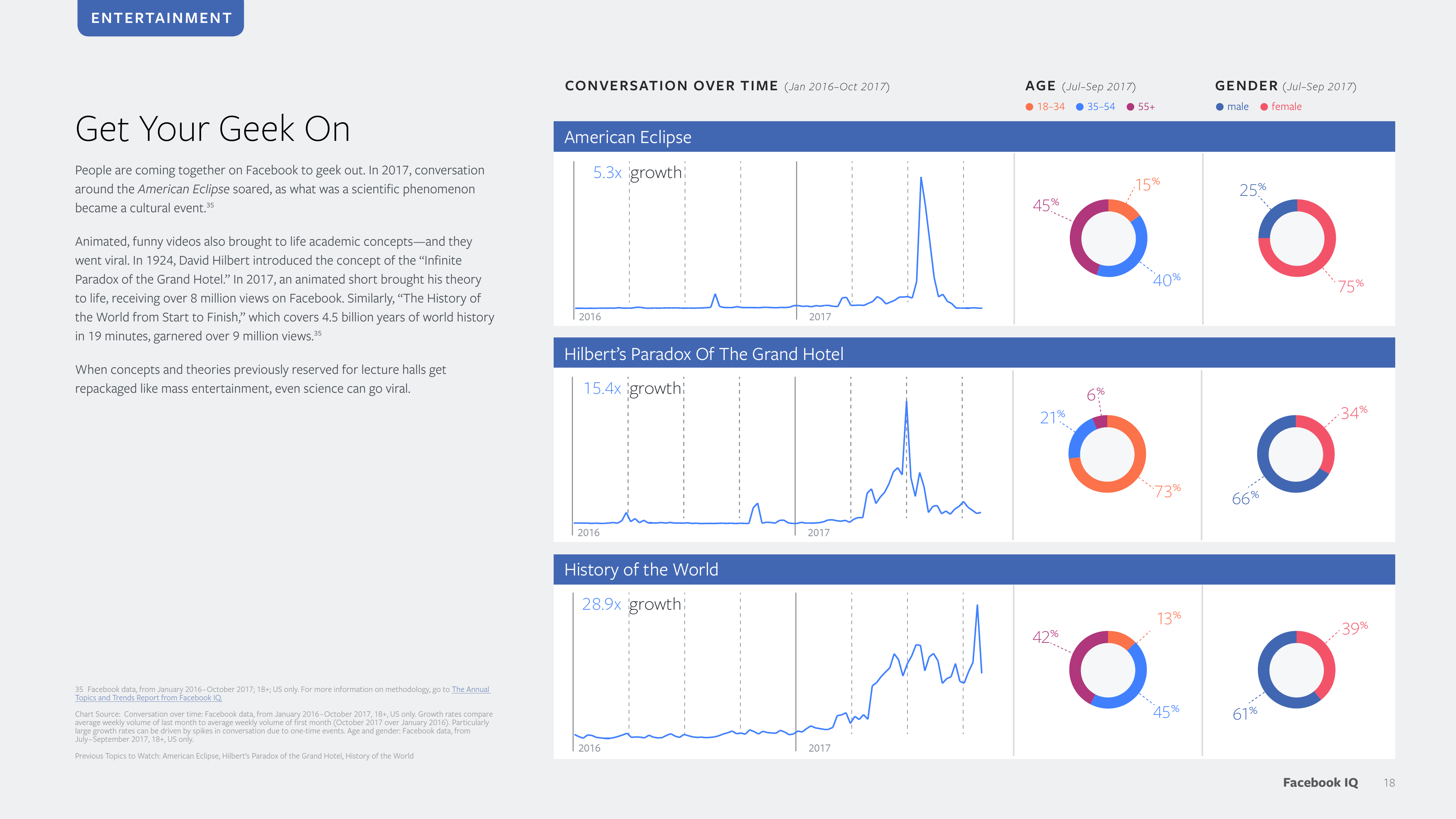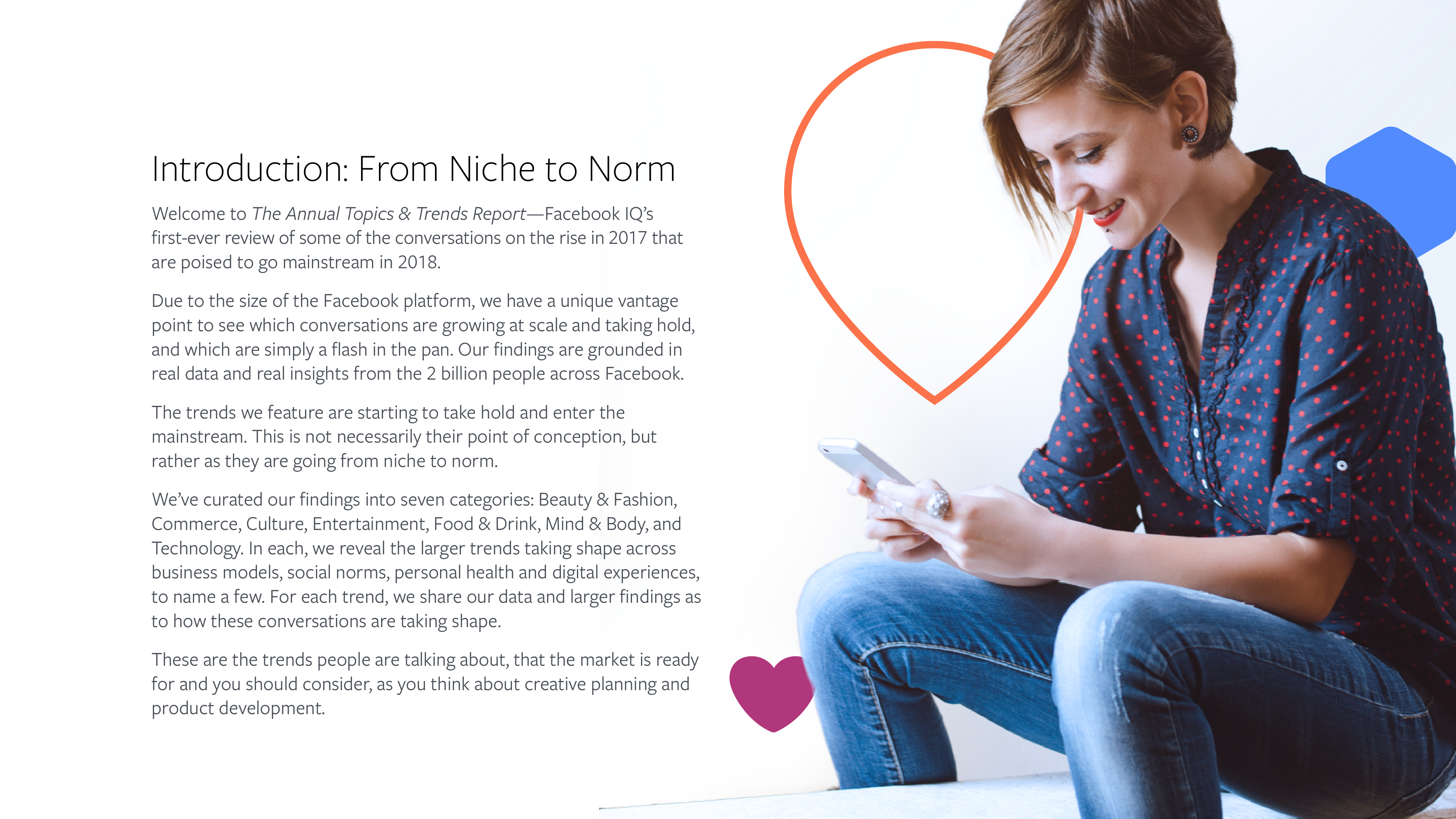 Facebook IQ 团队整理发布了其有史以来首份年度热门话题与趋势报告,帮助营销者规划明年的营销方案。《年度热门话题与趋势报告》不仅收罗了 2017 年成为热门的对话,而且还预测了会在 2018 年主导潮流的话题。