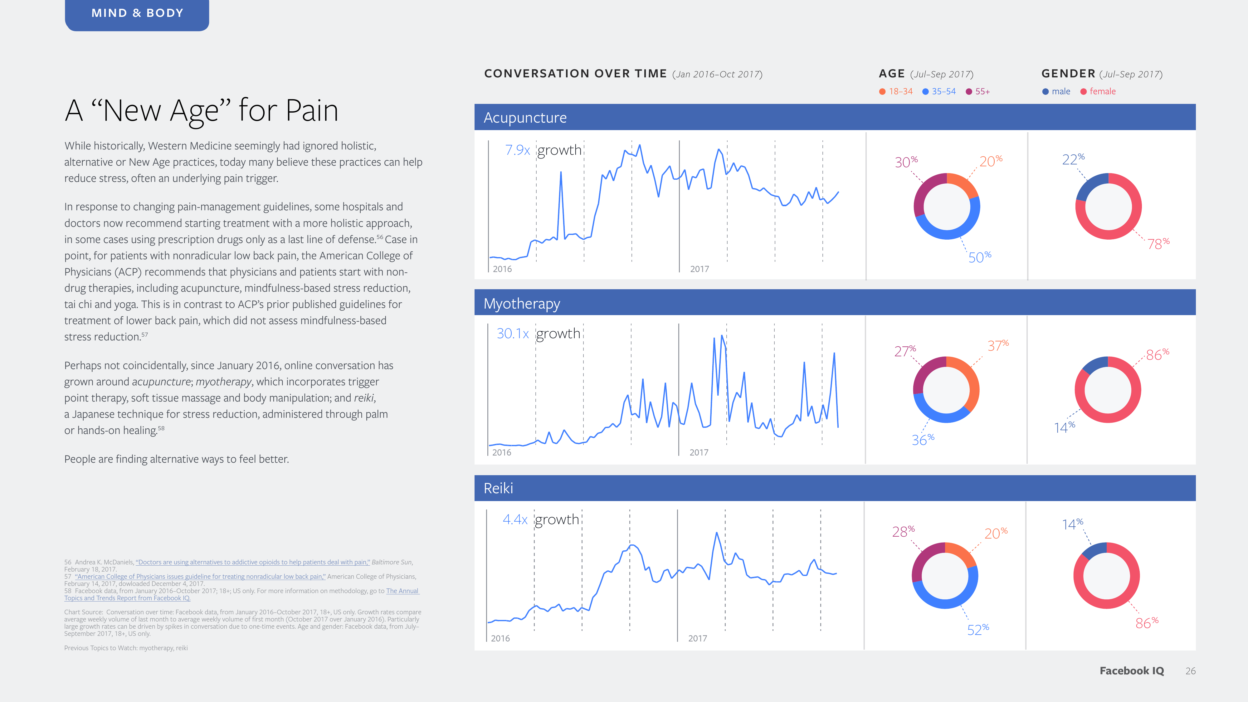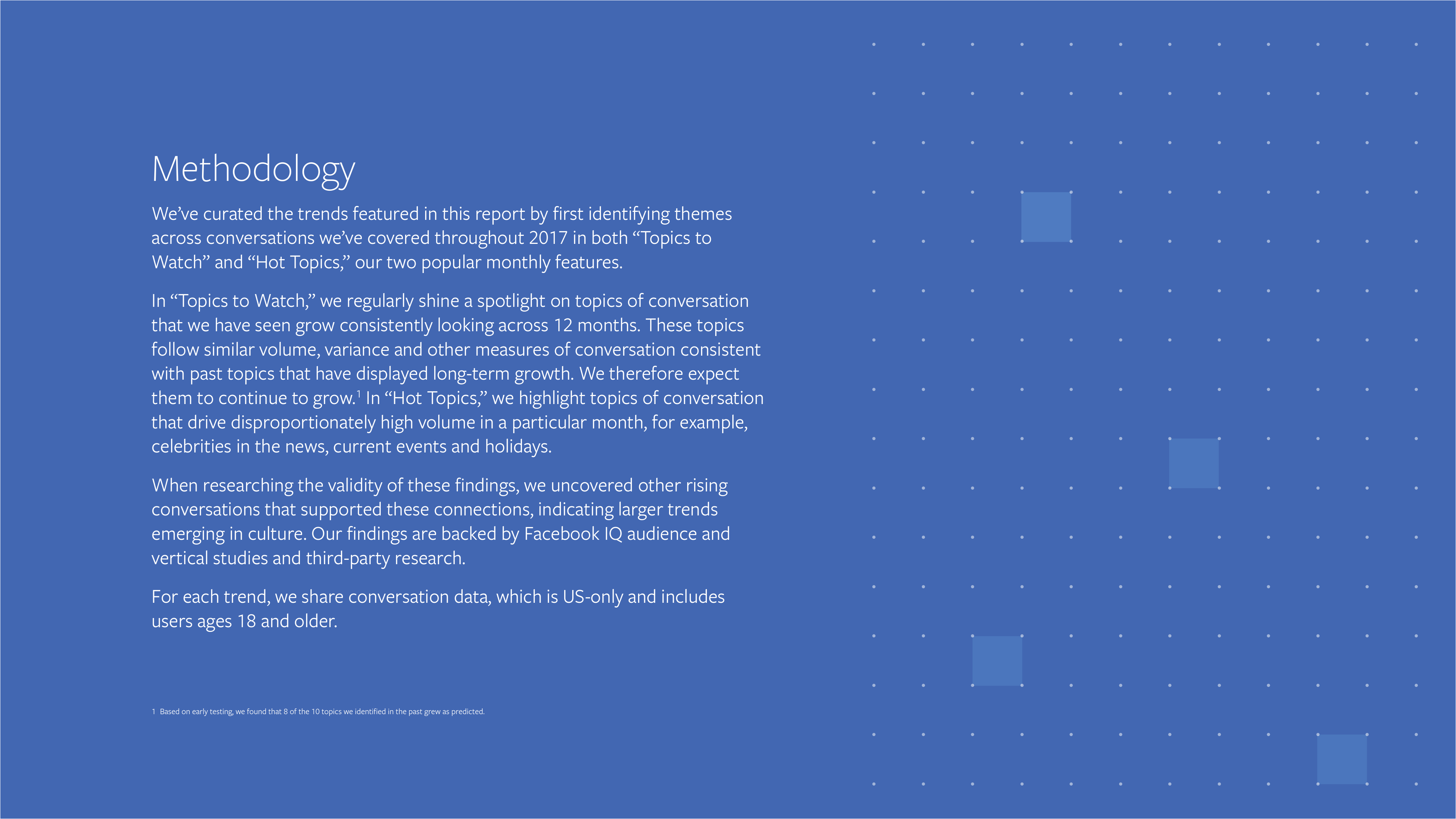 这份报告介绍了在以下 7 个门类中的调研发现:美容与时尚、商业、文化、娱乐、饮食、身心健康和科技。我们分析了每一个门类中哪些对话能跨越商业模式、社会规范、个人健康和数字体验等,成为热门趋势。针对每一项趋势,我们都分享了一些对话数据。这些数据的来源仅限美国年满 18 岁的用户。
