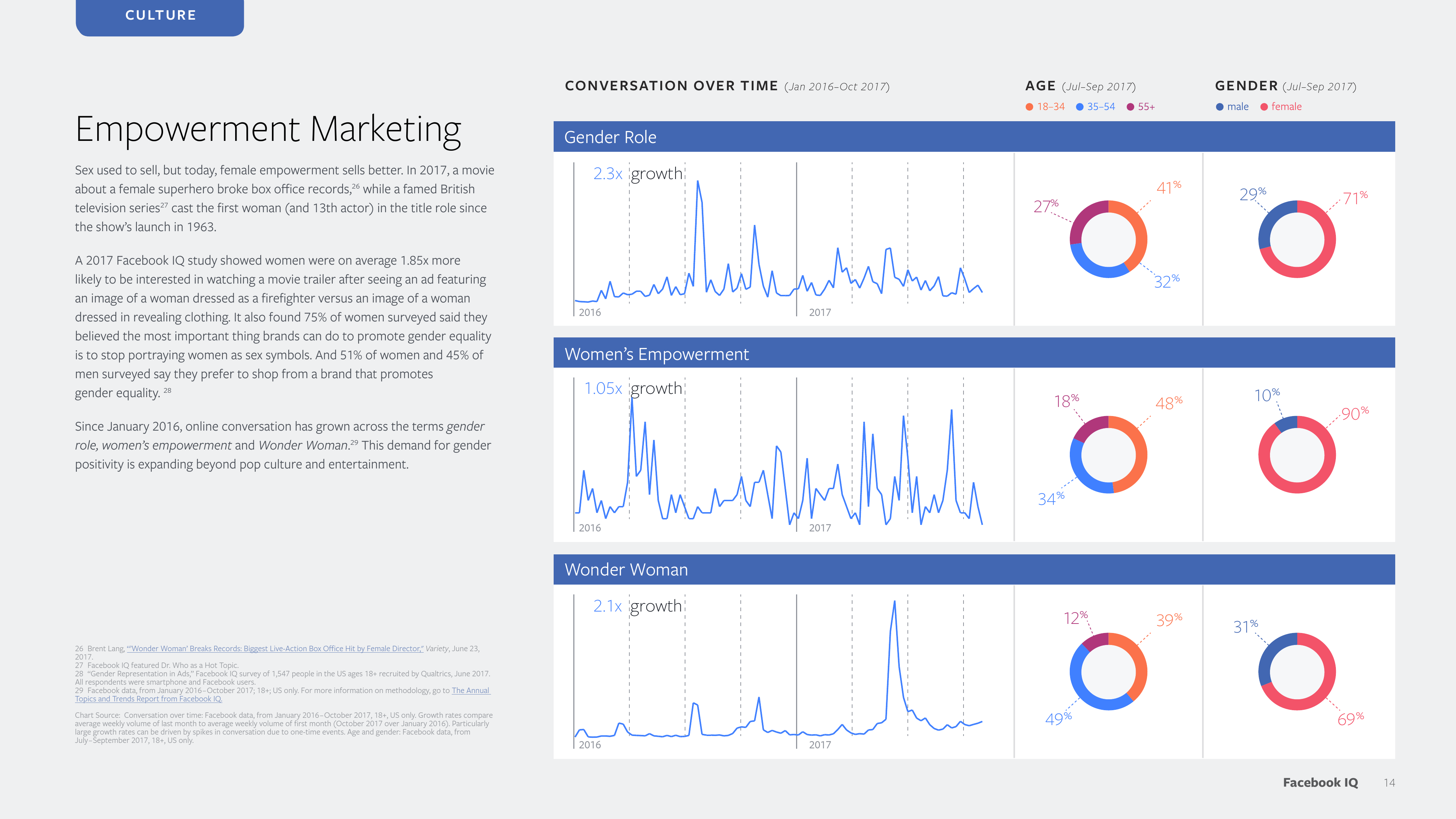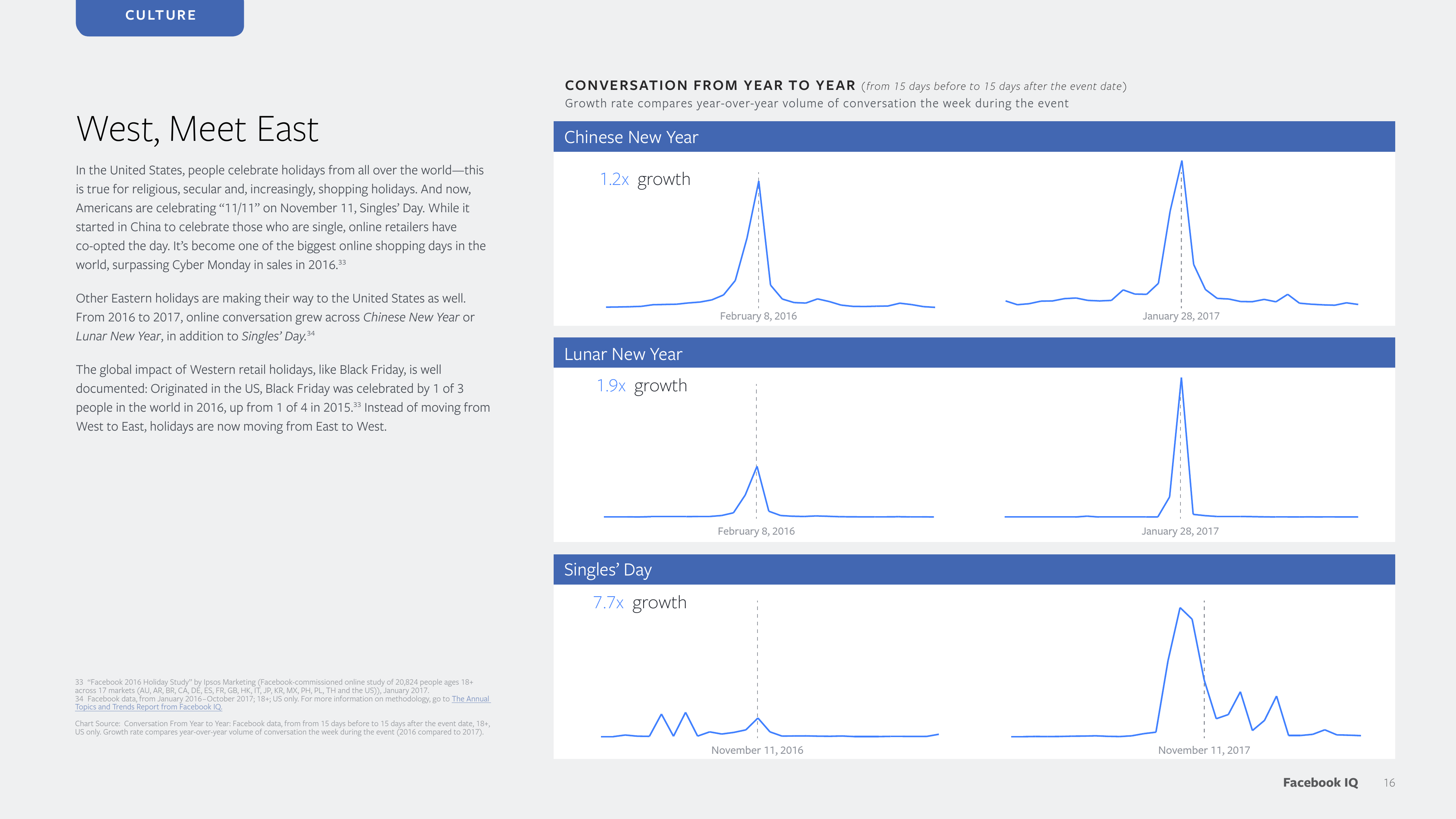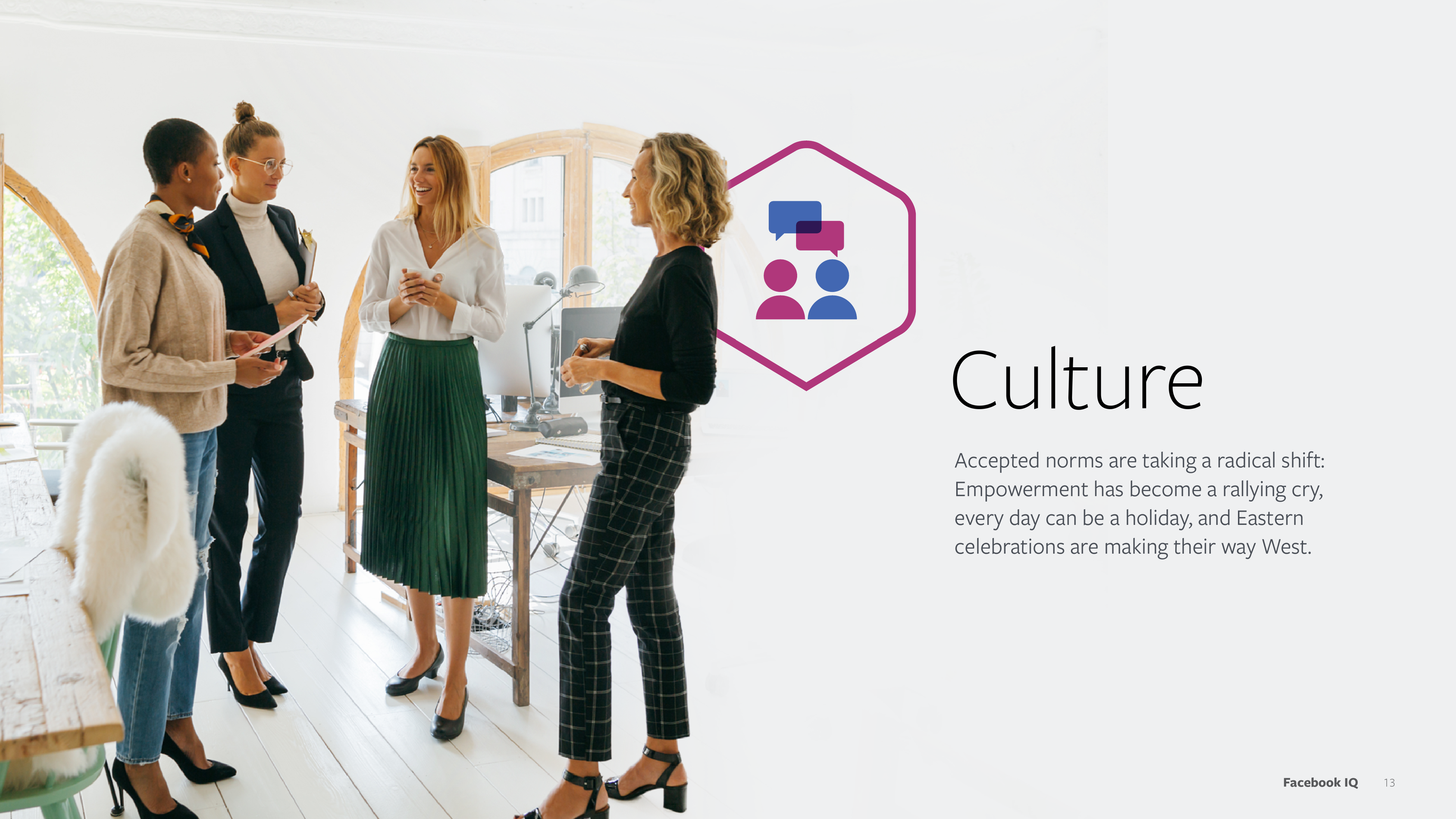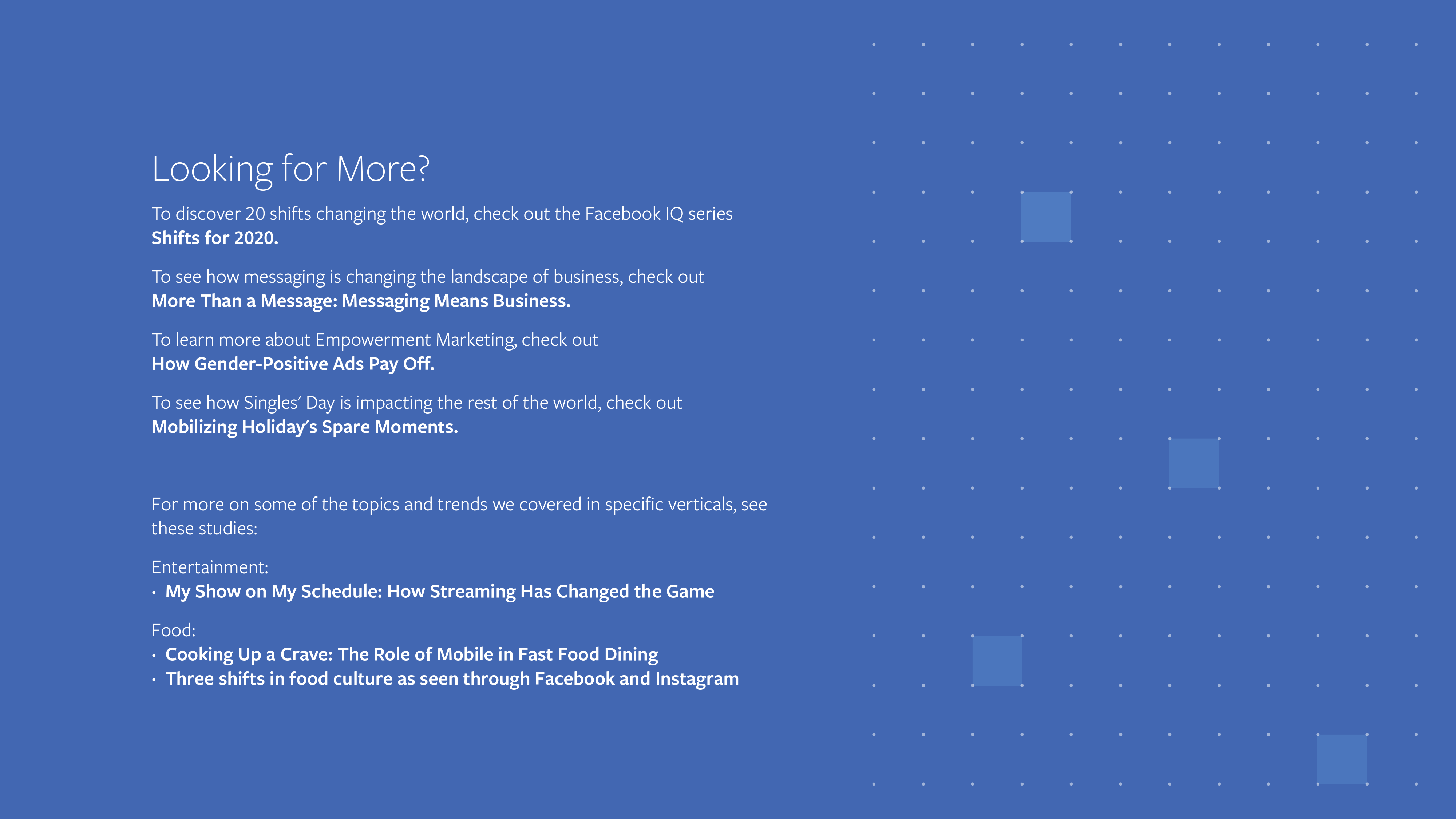 在分析这些调研结果有效性的过程中,我们还发现了正在兴起的其他对话。这些对话支撑起当下热门的话题,预示着更汹涌的文化趋势即将来袭。Facebook IQ 受众、行业调研和第三方研究为我们的调研结果提供了依据。