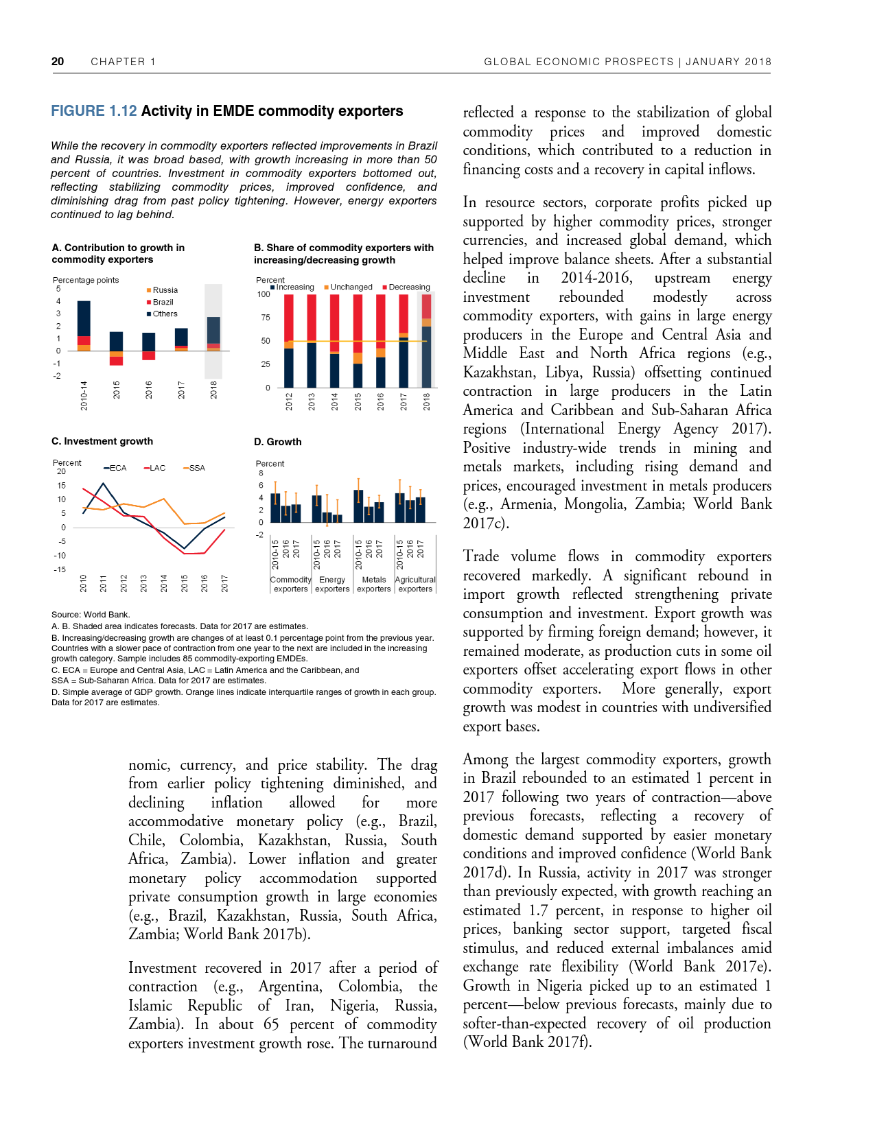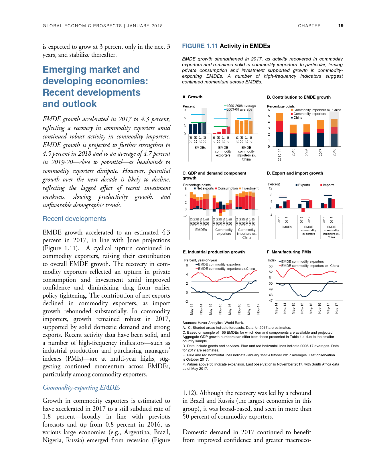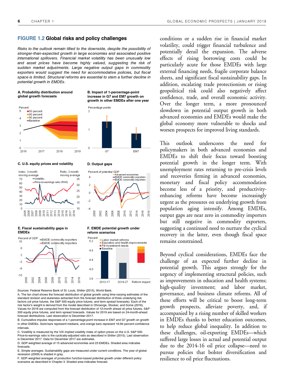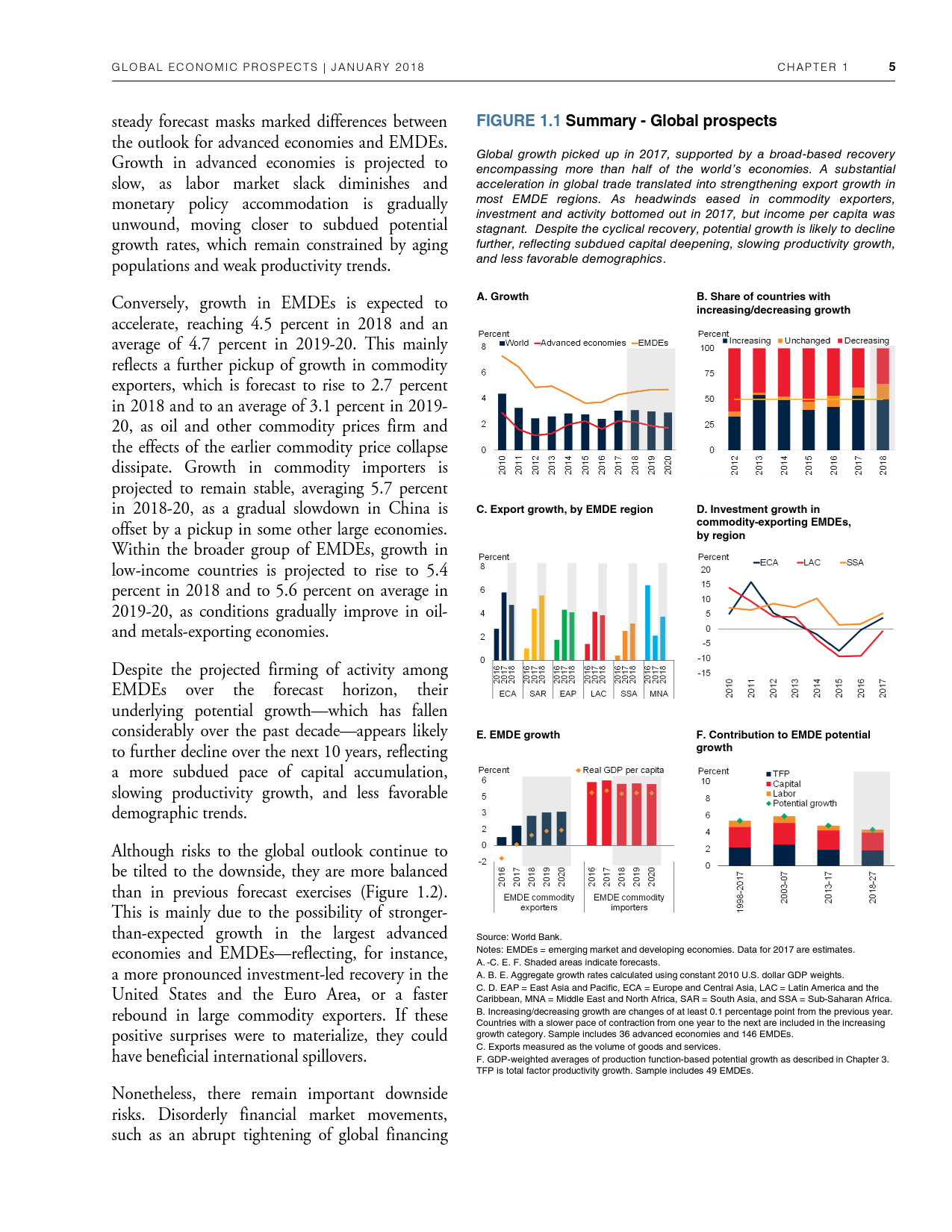 除了探讨全球和地区层面的发展趋势外,《2018年全球经济展望》1月期还研究了六大地区的潜在增长率前景、2014-2016年油价暴跌的教训以及新兴市场和发展中经济体技能和教育水平上升与不平等程度下降之间的联系。
