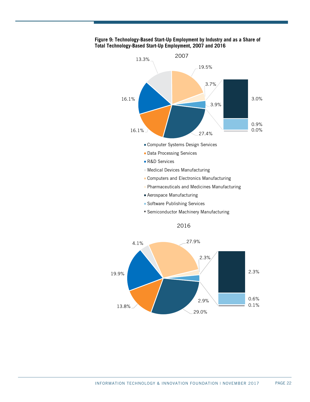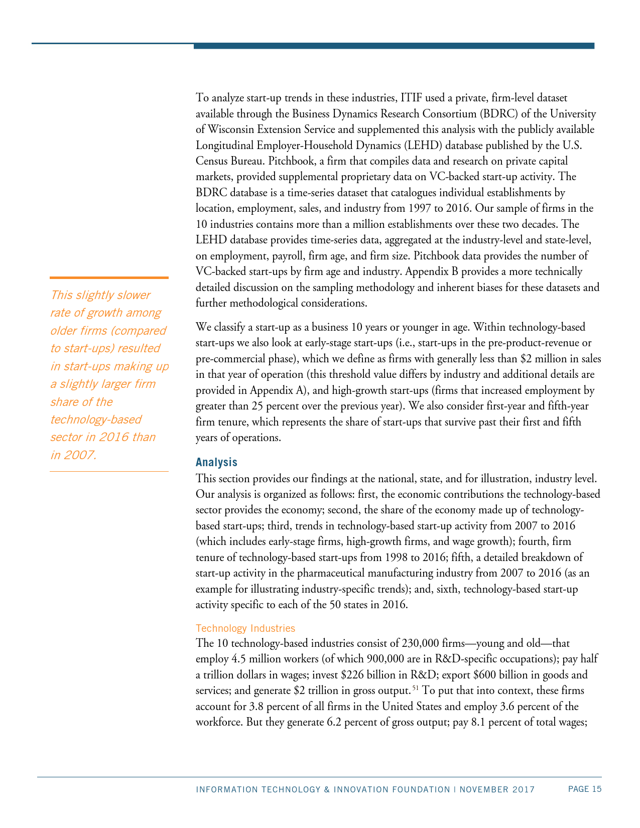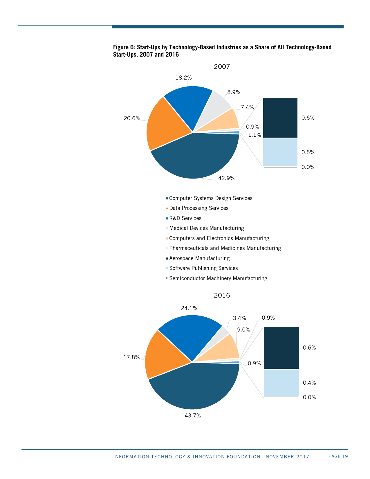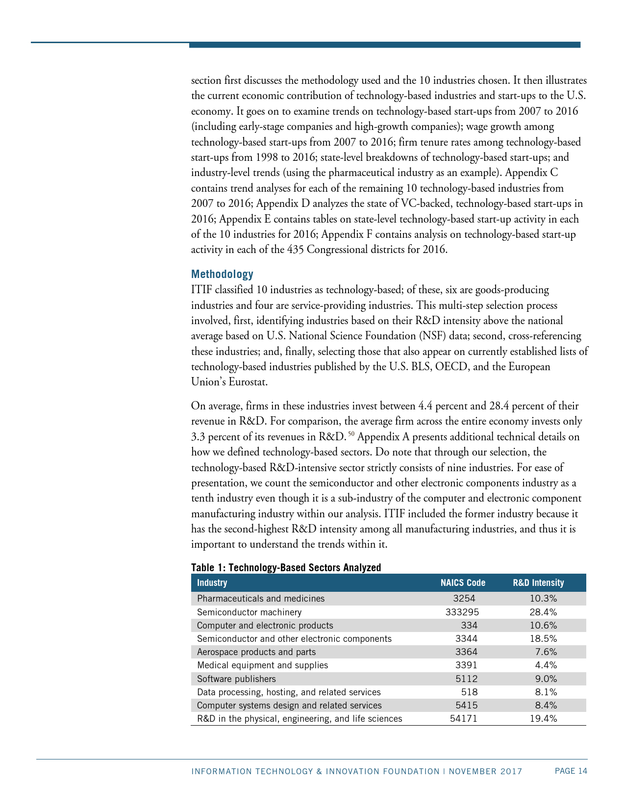对于美国经济的未来来说,技术型初创企业的现状是当前的一个关键问题。ITIF试图通过审查2007年至2016年科技行业公司的数据来评估这一现状。ITIF首先选择出了10个行业作为评估指标,其中六个为商品制造业,四个为服务业。该筛选过程首先基于美国国家科学基金会(NSF)的数据,确定基于其研发强度高于全国平均水平的行业;第二交叉引用这些行业,最终参考美国BLS、OECD和欧盟统计局发布的科技型产业名单。为了分析这些行业的创业趋势,ITIF使用了威斯康星大学商业动态研究协会(BDRC)提供的私有数据集,并通过美国人口普查局发布的公开的数据库补充了这一分析。