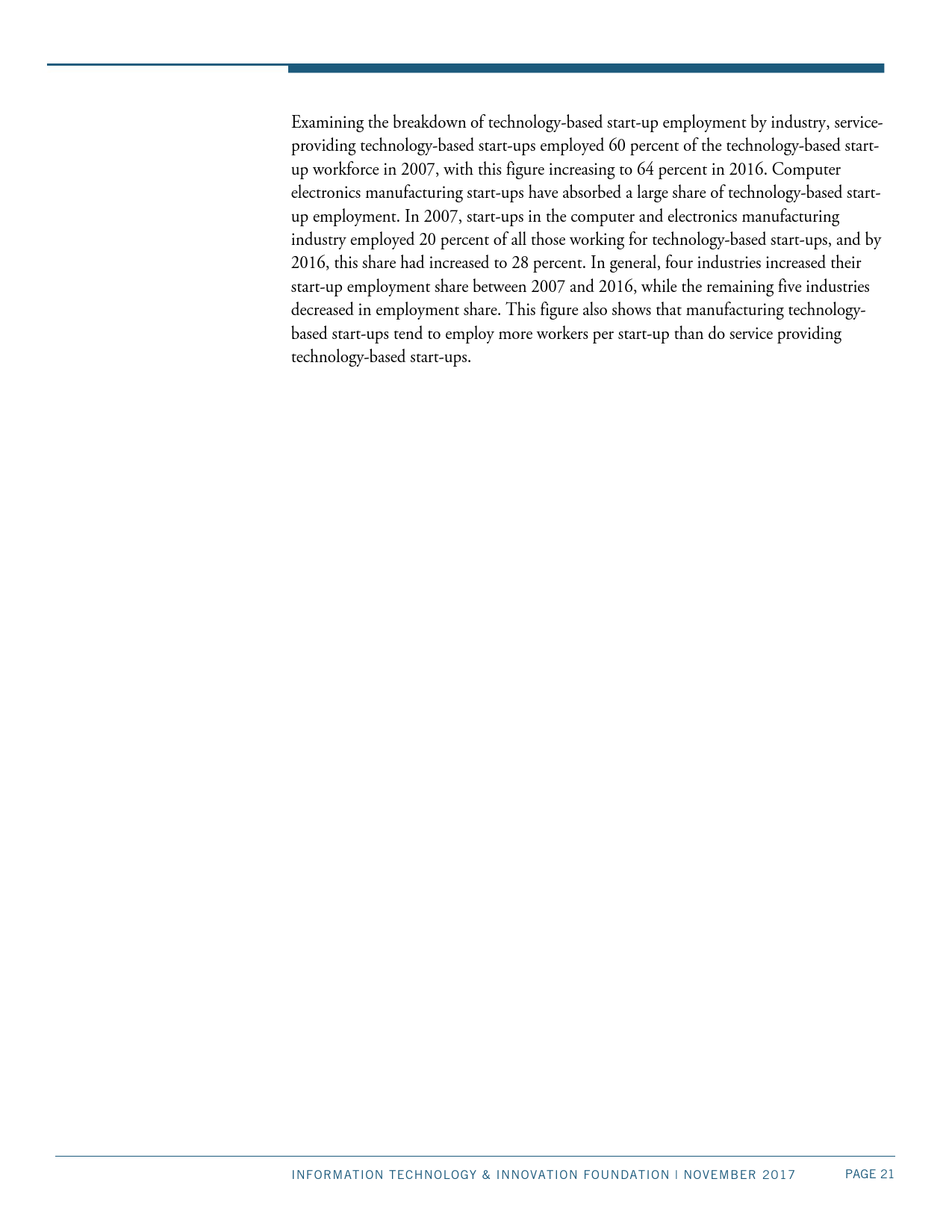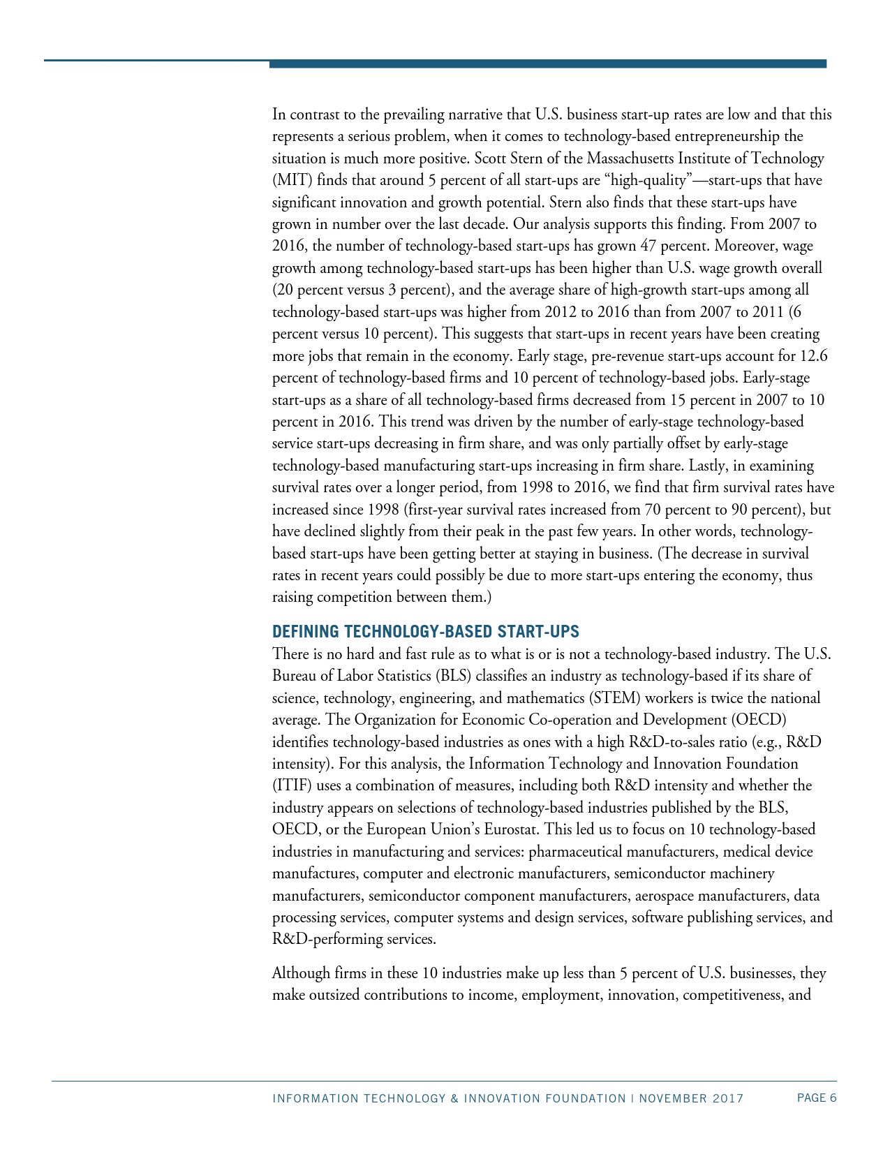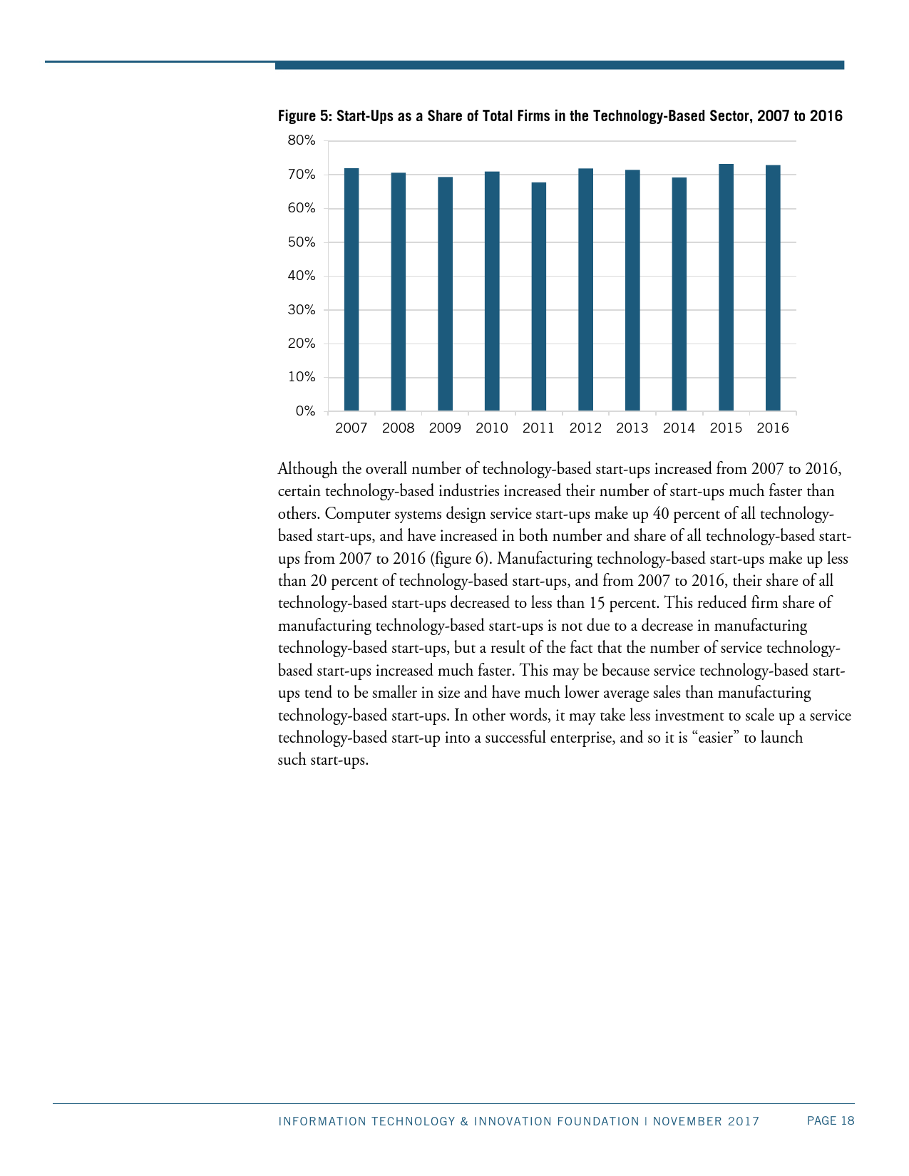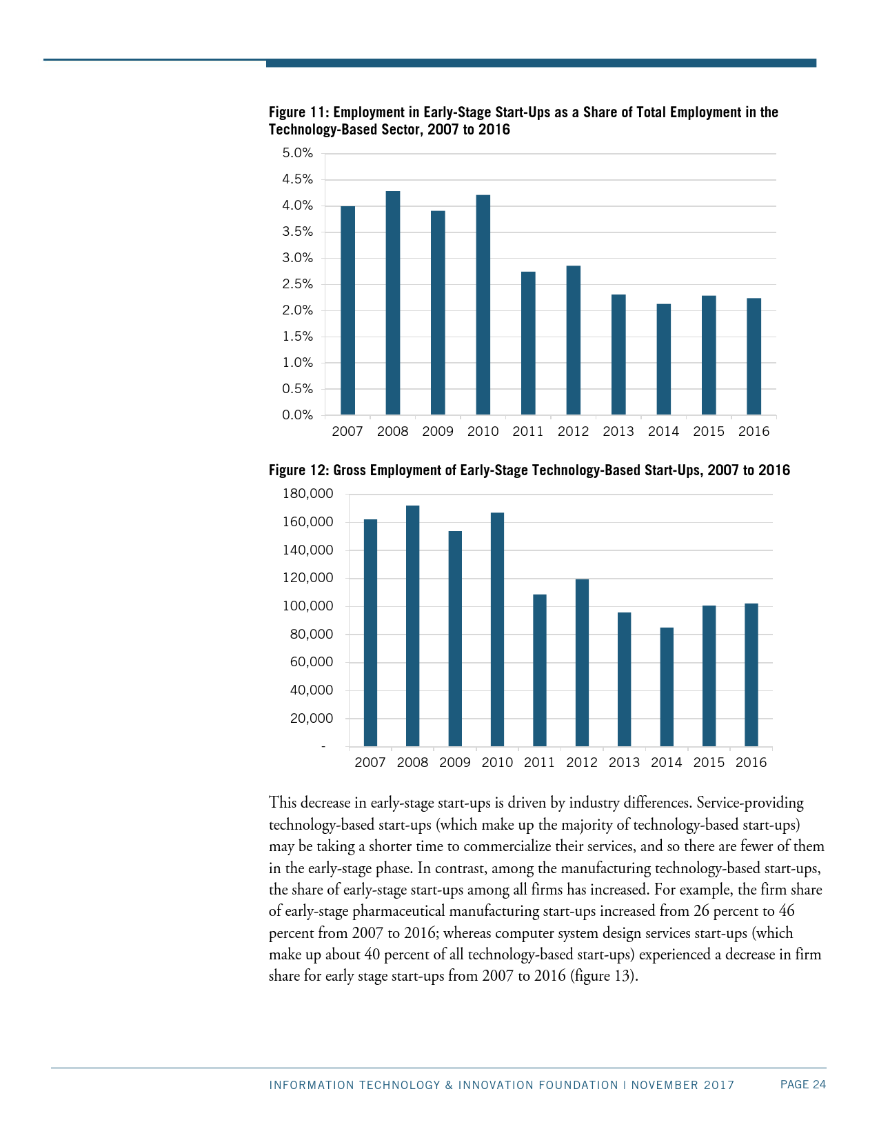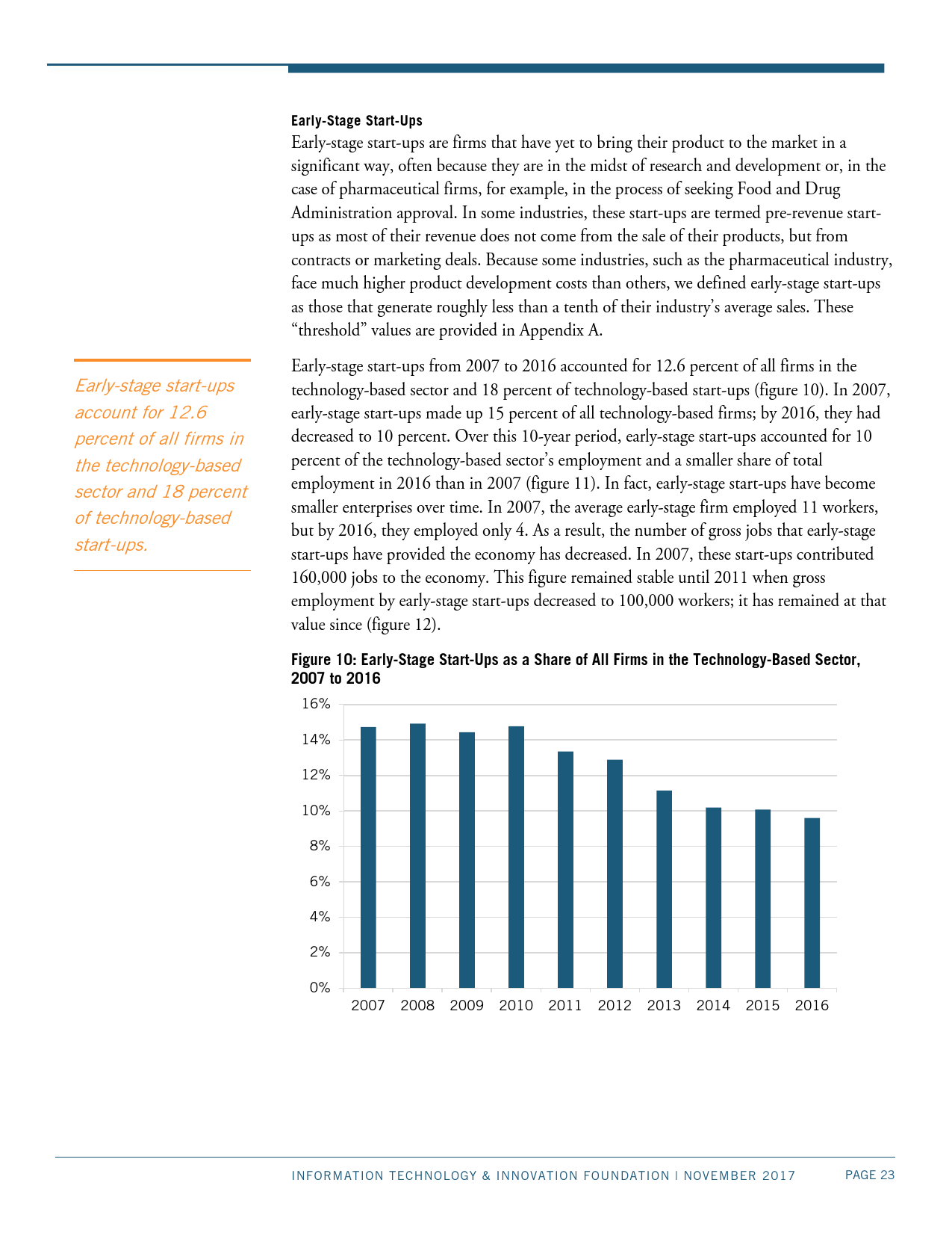 对于美国经济的未来来说,技术型初创企业的现状是当前的一个关键问题。ITIF试图通过审查2007年至2016年科技行业公司的数据来评估这一现状。ITIF首先选择出了10个行业作为评估指标,其中六个为商品制造业,四个为服务业。该筛选过程首先基于美国国家科学基金会(NSF)的数据,确定基于其研发强度高于全国平均水平的行业;第二交叉引用这些行业,最终参考美国BLS、OECD和欧盟统计局发布的科技型产业名单。为了分析这些行业的创业趋势,ITIF使用了威斯康星大学商业动态研究协会(BDRC)提供的私有数据集,并通过美国人口普查局发布的公开的数据库补充了这一分析。