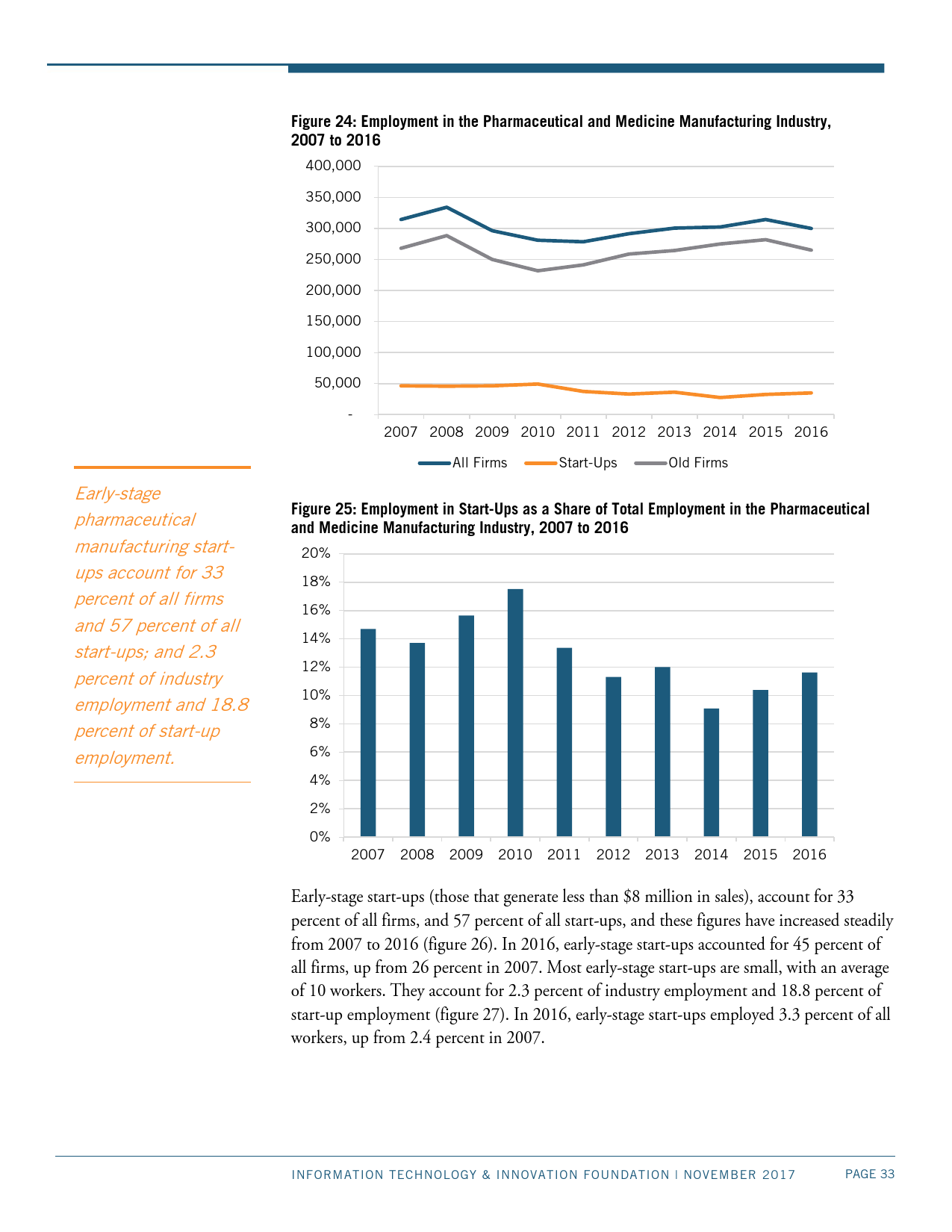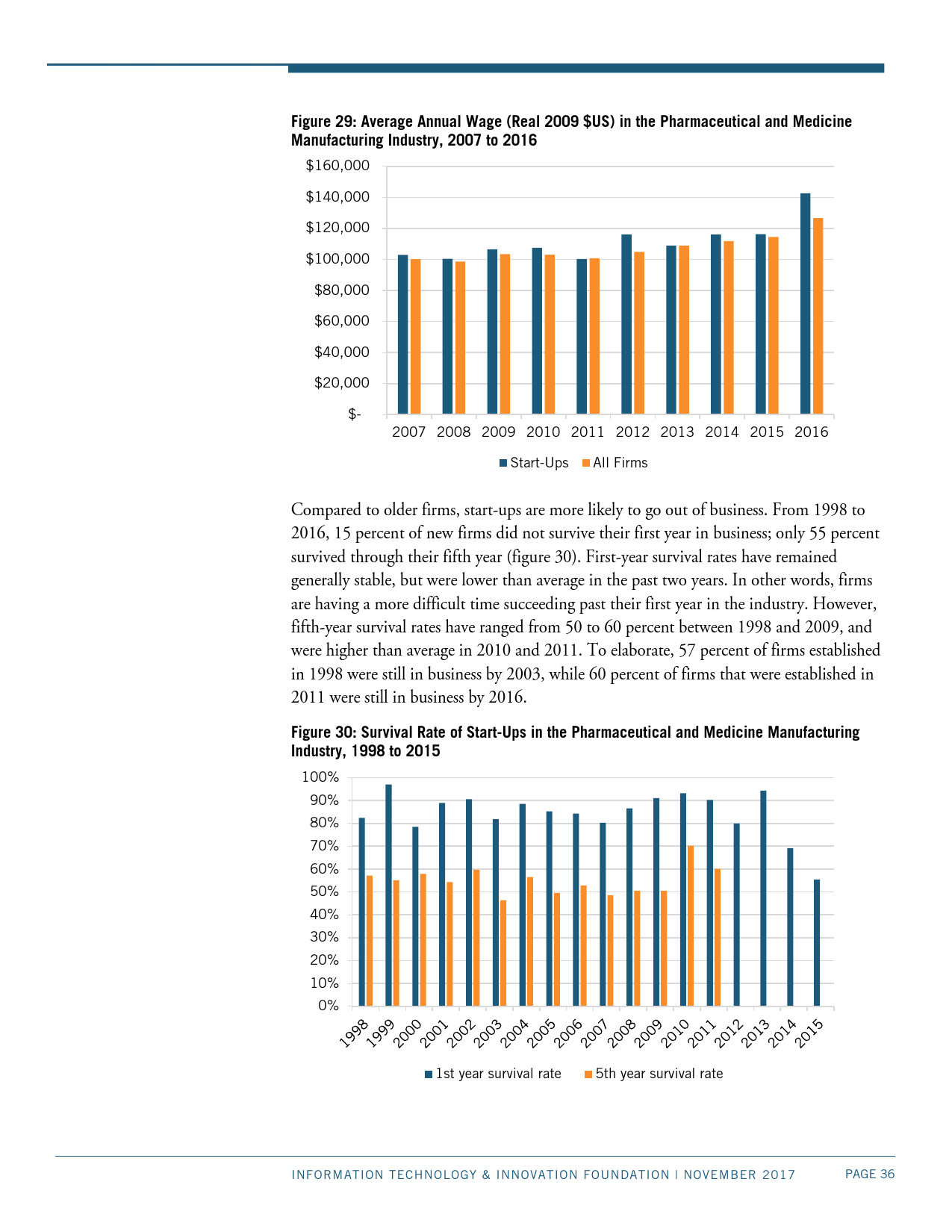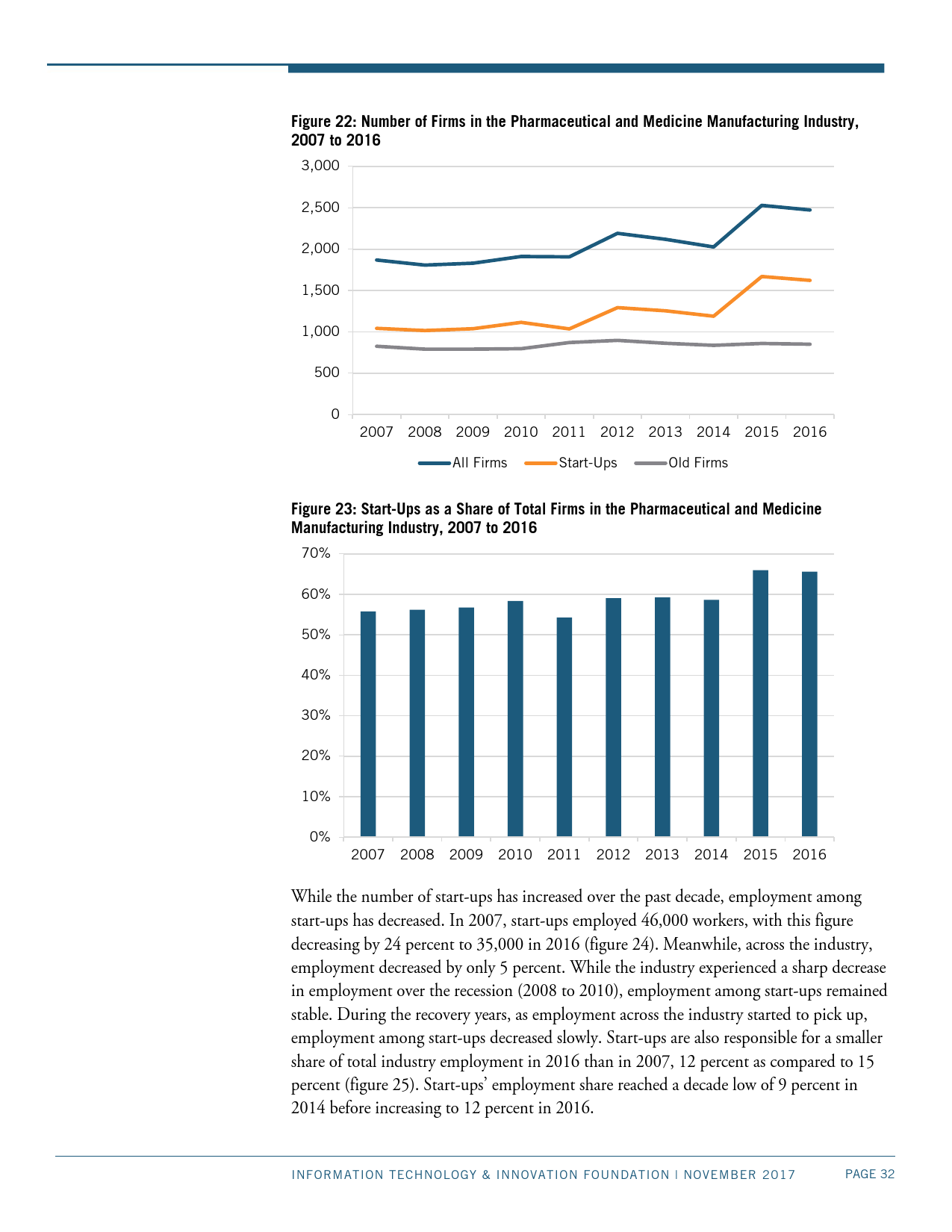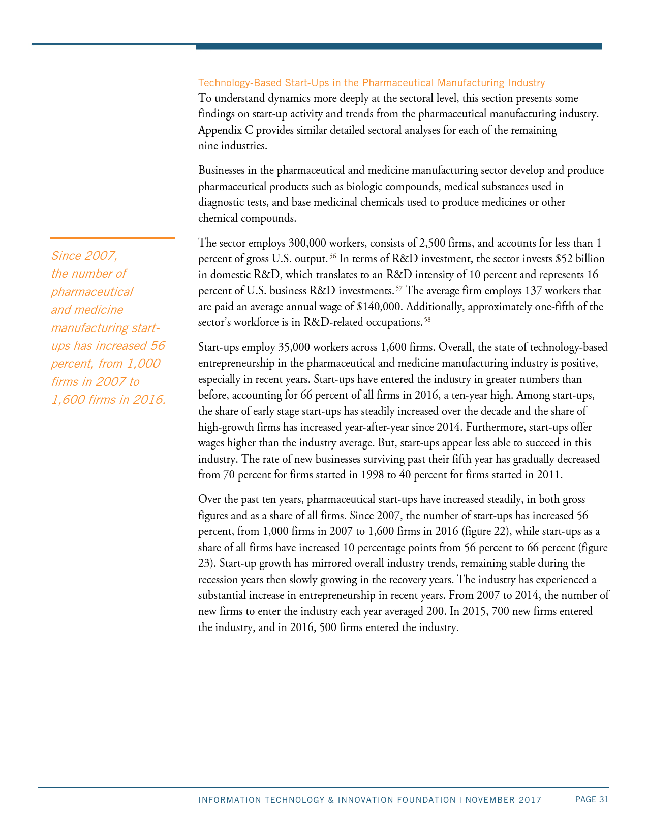 对于美国经济的未来来说,技术型初创企业的现状是当前的一个关键问题。ITIF试图通过审查2007年至2016年科技行业公司的数据来评估这一现状。ITIF首先选择出了10个行业作为评估指标,其中六个为商品制造业,四个为服务业。该筛选过程首先基于美国国家科学基金会(NSF)的数据,确定基于其研发强度高于全国平均水平的行业;第二交叉引用这些行业,最终参考美国BLS、OECD和欧盟统计局发布的科技型产业名单。为了分析这些行业的创业趋势,ITIF使用了威斯康星大学商业动态研究协会(BDRC)提供的私有数据集,并通过美国人口普查局发布的公开的数据库补充了这一分析。
