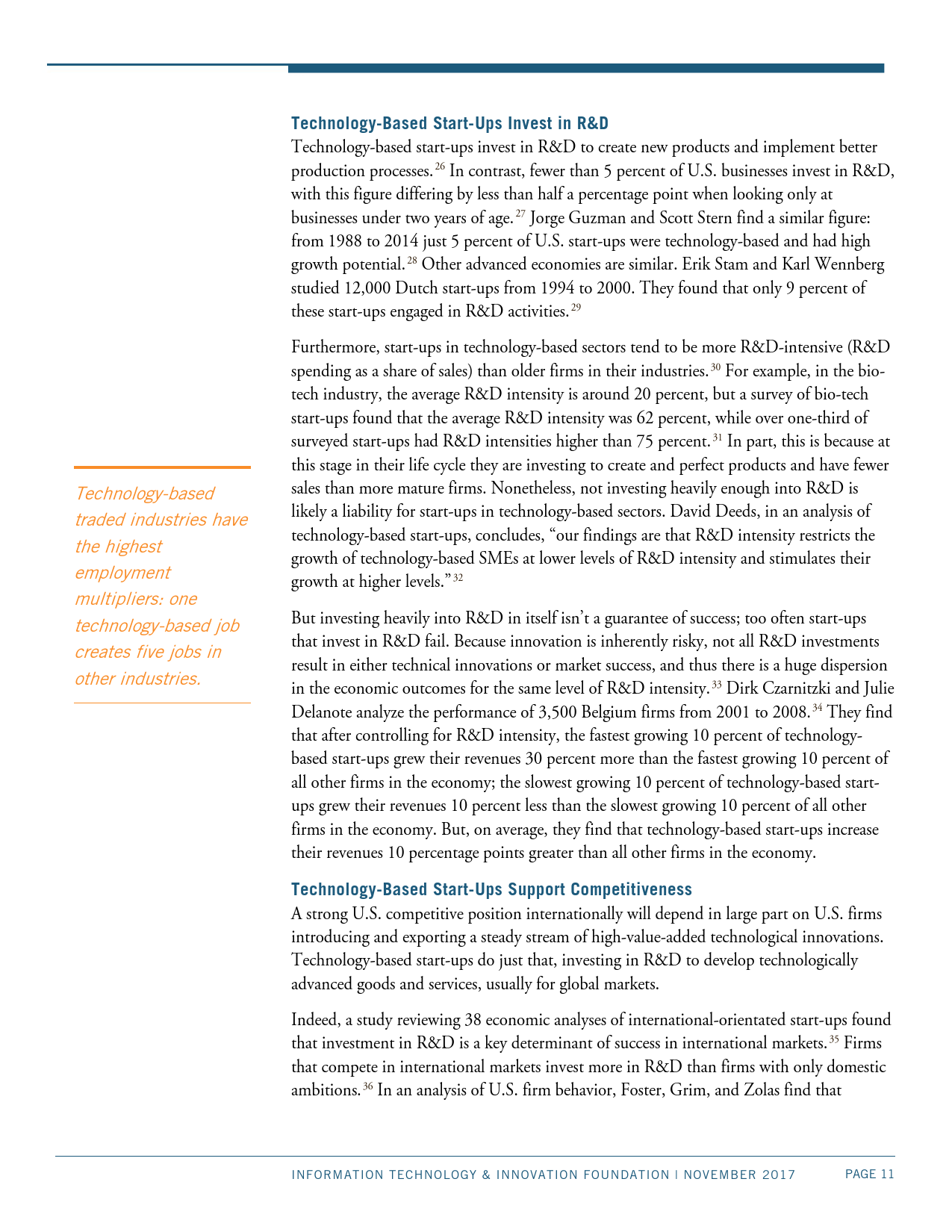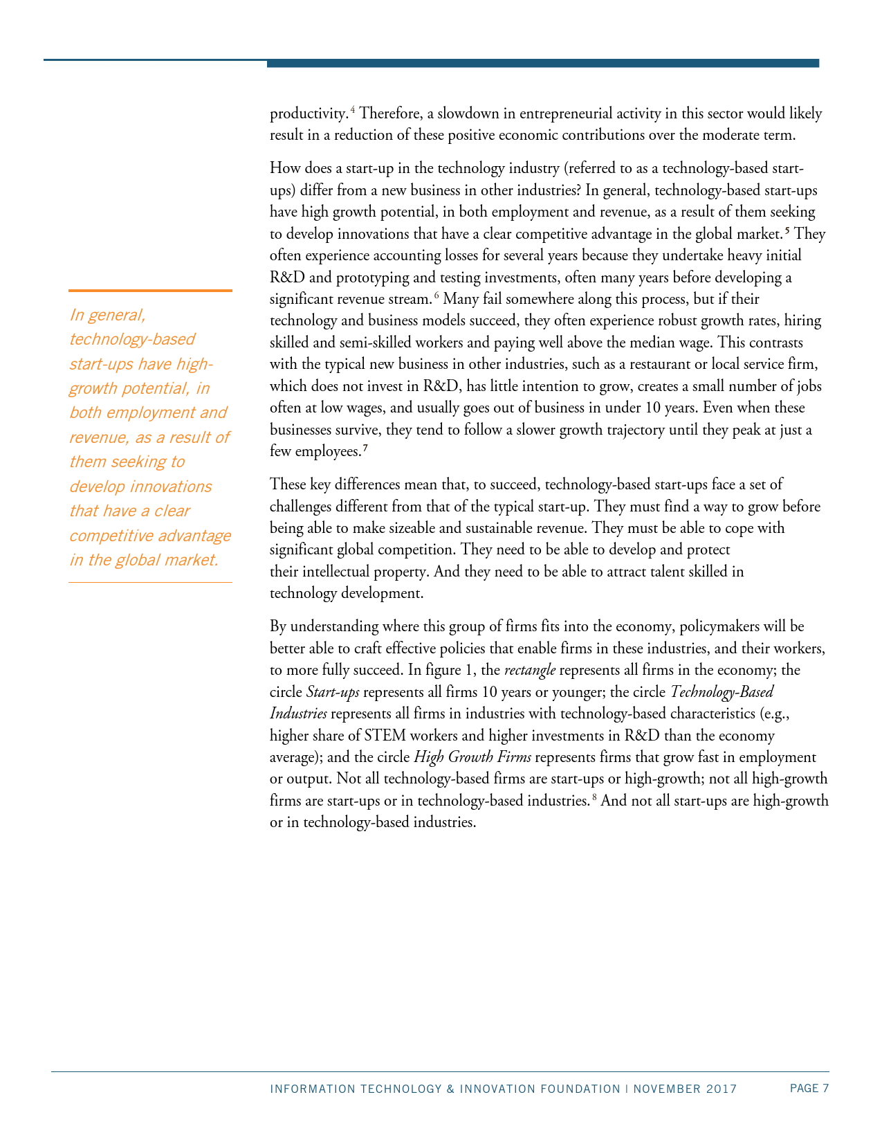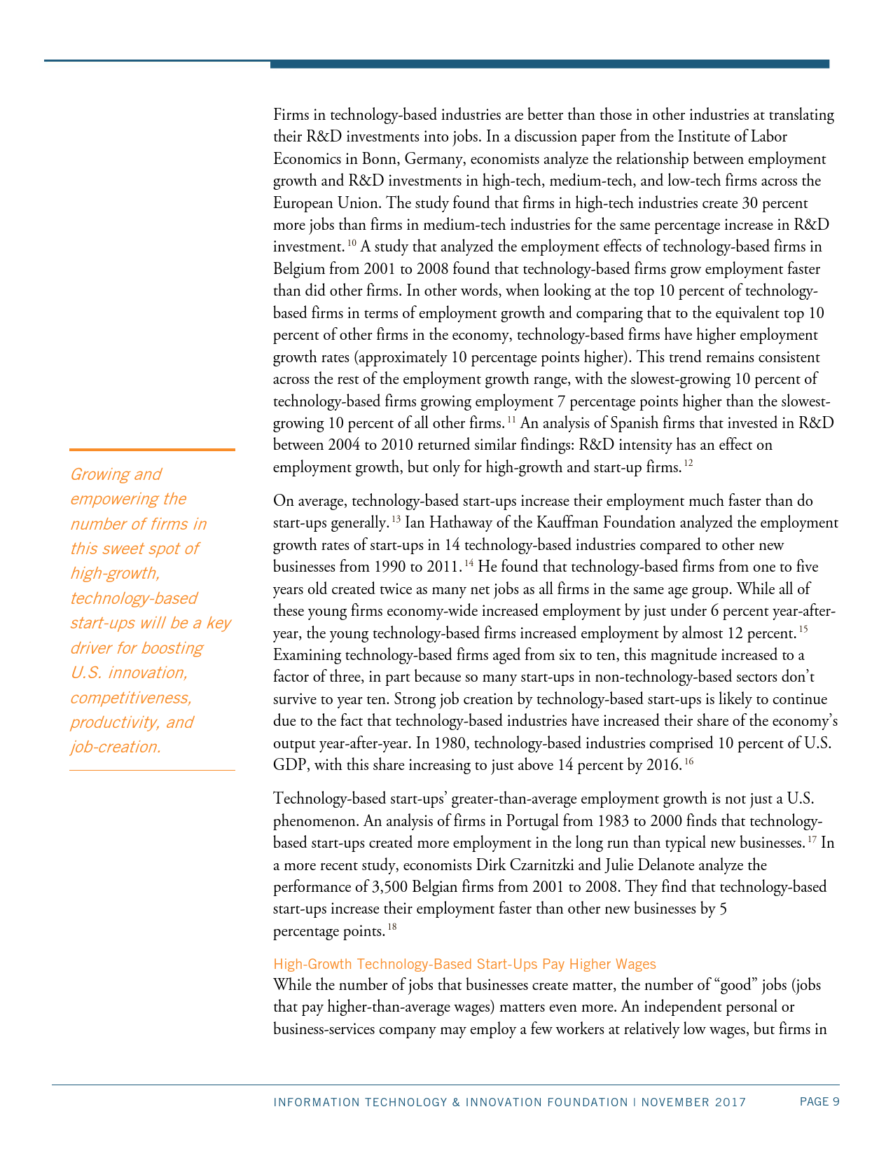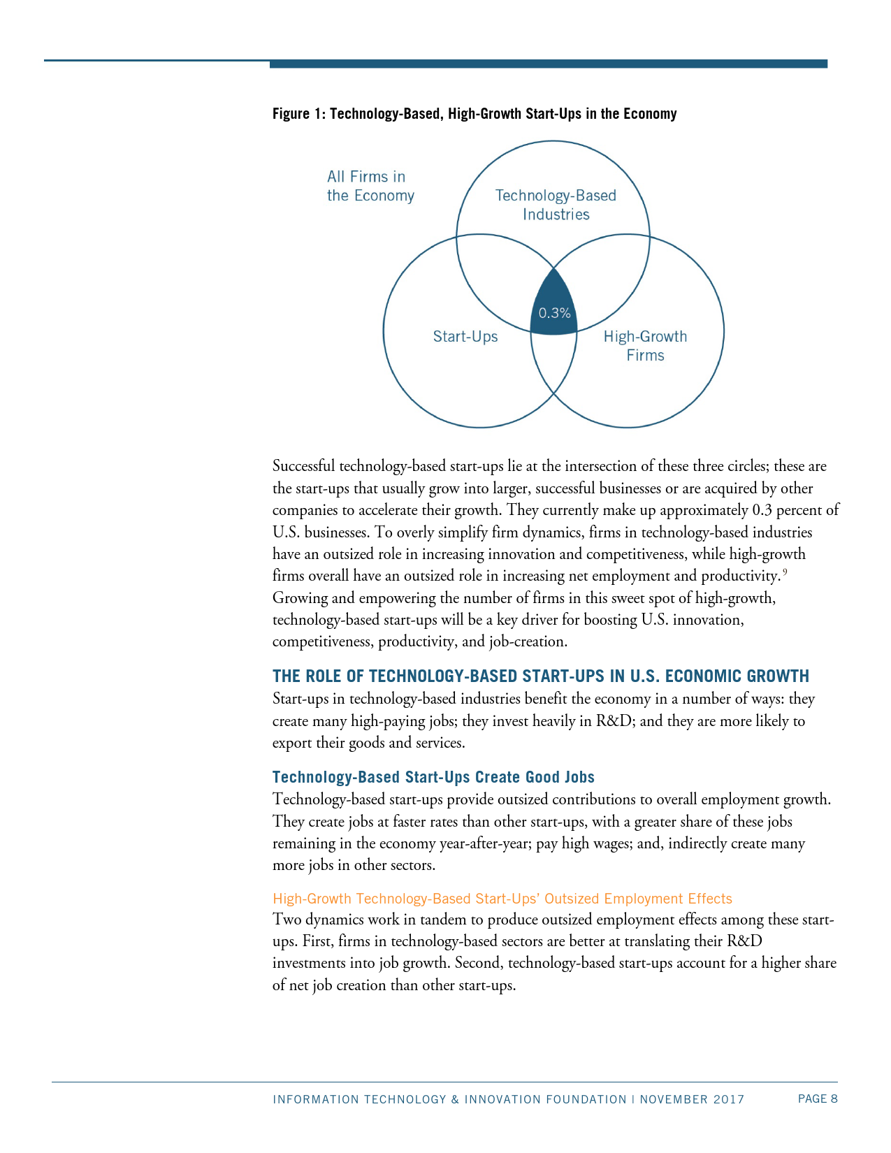 技术型初创企业以多种方式刺激经济增长:创造了许多高薪工作、在研发上投入巨资、而且技术型初创企业的商品和服务更有可能出口。以技术为基础的初创企业为整体就业增长提供了巨大的贡献。他们创造的就业机会比其他初创企业更多,这些岗位在经济发展中不容易被淘汰、支付高额工资而且可以间接地在其他领域创造了更多的就业机会。技术型初创企业乐于投资研发,以创造新产品,并实施更好的生产流程。初创企业比行业中的现有企业更加重视技术投资。美国在国际上的强大竞争地位,很大程度上依赖于美国公司源源不断的引进和出口高附加值的技术创新。技术型初创企业所做的正是通过大额研发投资,发展技术创新,并推出先进产品与服务。此外风险资本(VC)投资基金在资助和支持技术型初创企业方面具有重要作用。