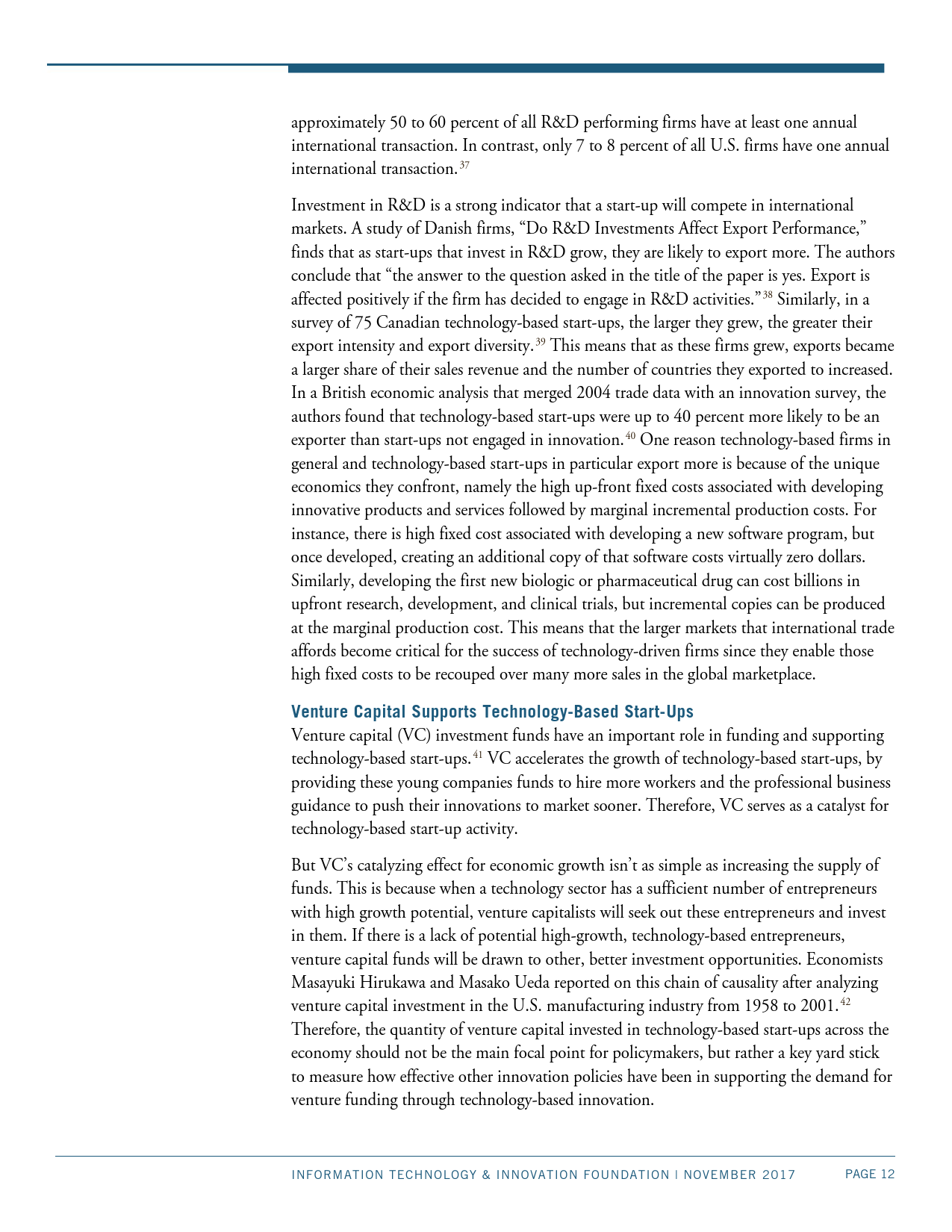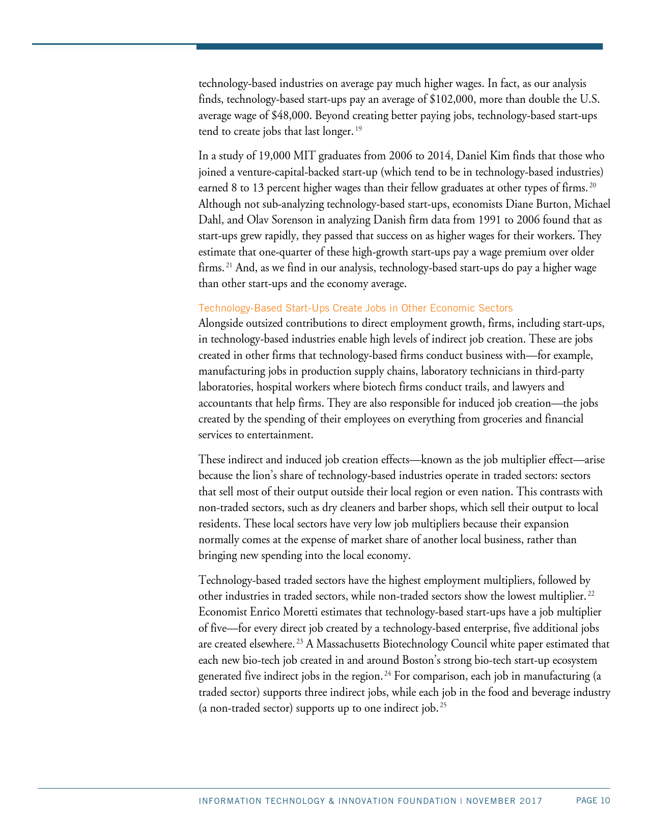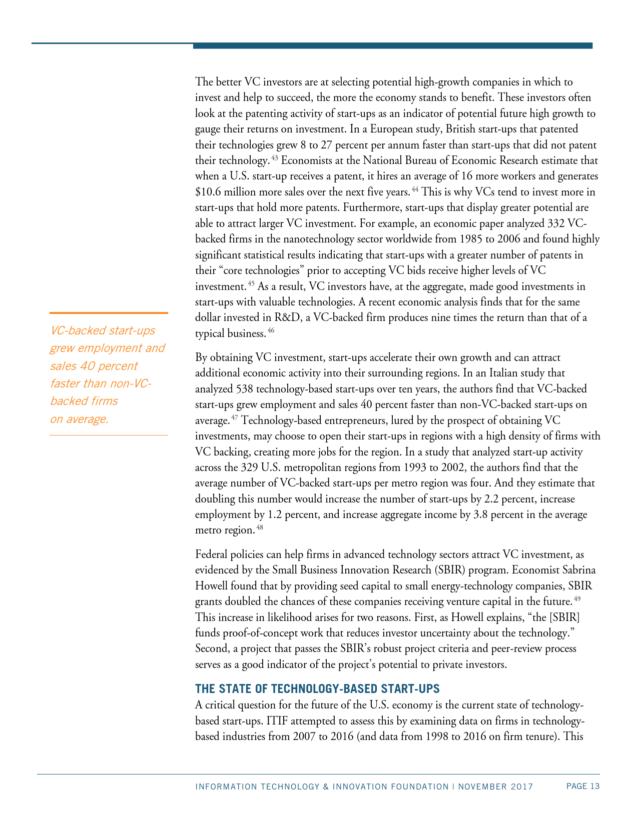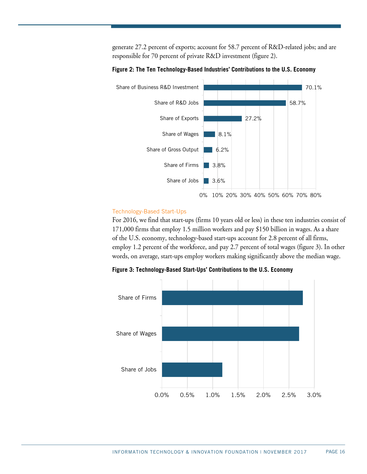 技术型初创企业以多种方式刺激经济增长:创造了许多高薪工作、在研发上投入巨资、而且技术型初创企业的商品和服务更有可能出口。以技术为基础的初创企业为整体就业增长提供了巨大的贡献。他们创造的就业机会比其他初创企业更多,这些岗位在经济发展中不容易被淘汰、支付高额工资而且可以间接地在其他领域创造了更多的就业机会。技术型初创企业乐于投资研发,以创造新产品,并实施更好的生产流程。初创企业比行业中的现有企业更加重视技术投资。美国在国际上的强大竞争地位,很大程度上依赖于美国公司源源不断的引进和出口高附加值的技术创新。技术型初创企业所做的正是通过大额研发投资,发展技术创新,并推出先进产品与服务。此外风险资本(VC)投资基金在资助和支持技术型初创企业方面具有重要作用。