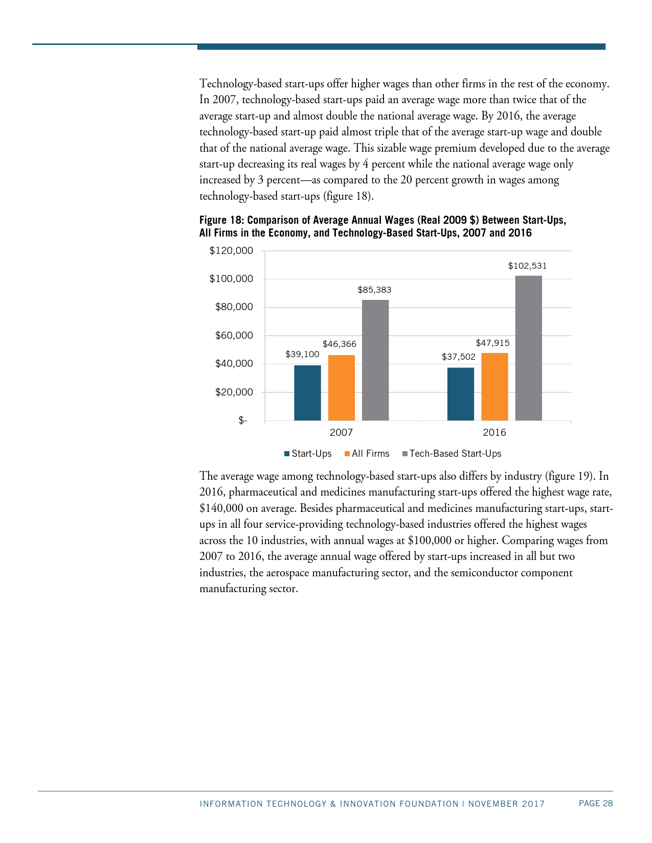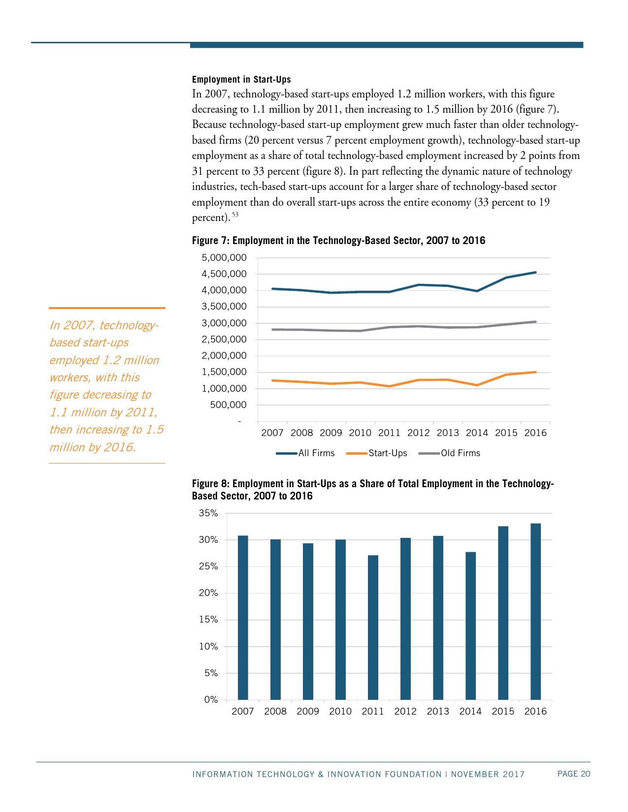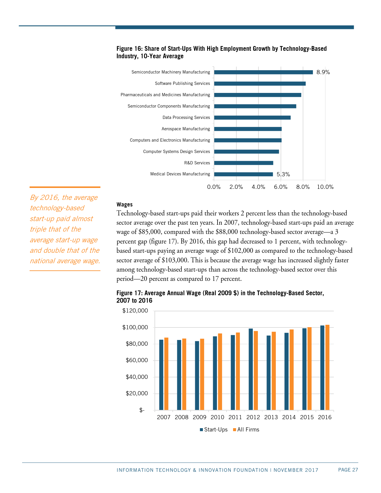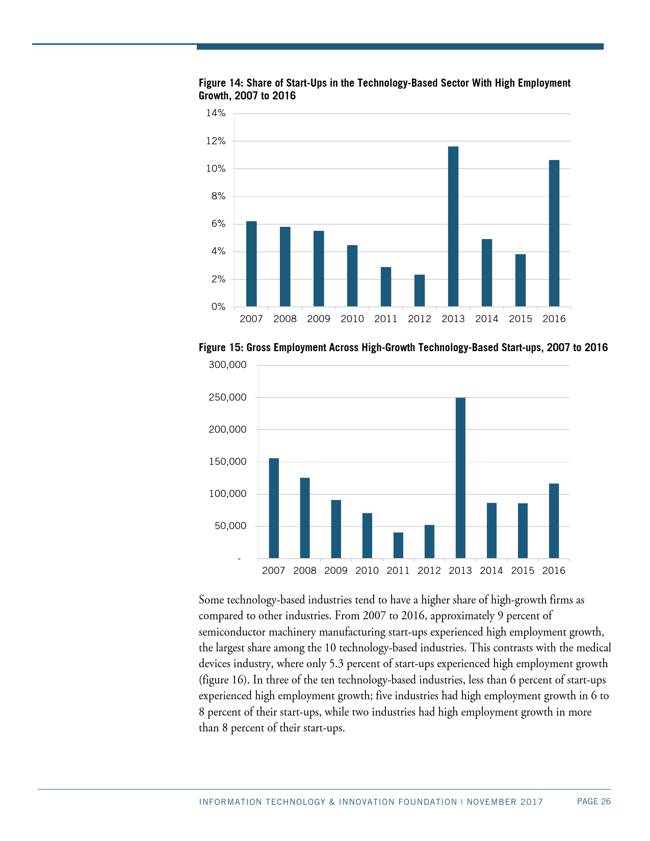 目前普遍认为美国创业率较低并成为严重问题,但就科技企业来说这一情况乐观很多。麻省理工学院的Scott Stern发现大约5%初创企业是高质量的,他们有显著的创新和增长潜力,同时发现这些初创企业在过去十年取得巨大增长。本报告的分析支持这一判断。从2007年到2016年,技术型初创企业的数量已经增长了47%。此外,技术型初创企业的工资增长高于美国总体工资增长(分别为20% 和3%),2012-2016年高增长科技型初创企业平均占比份额高于2007年至2011年(10% 和6%)。由此可以看出最近几年初创企业创造了更多的就业。