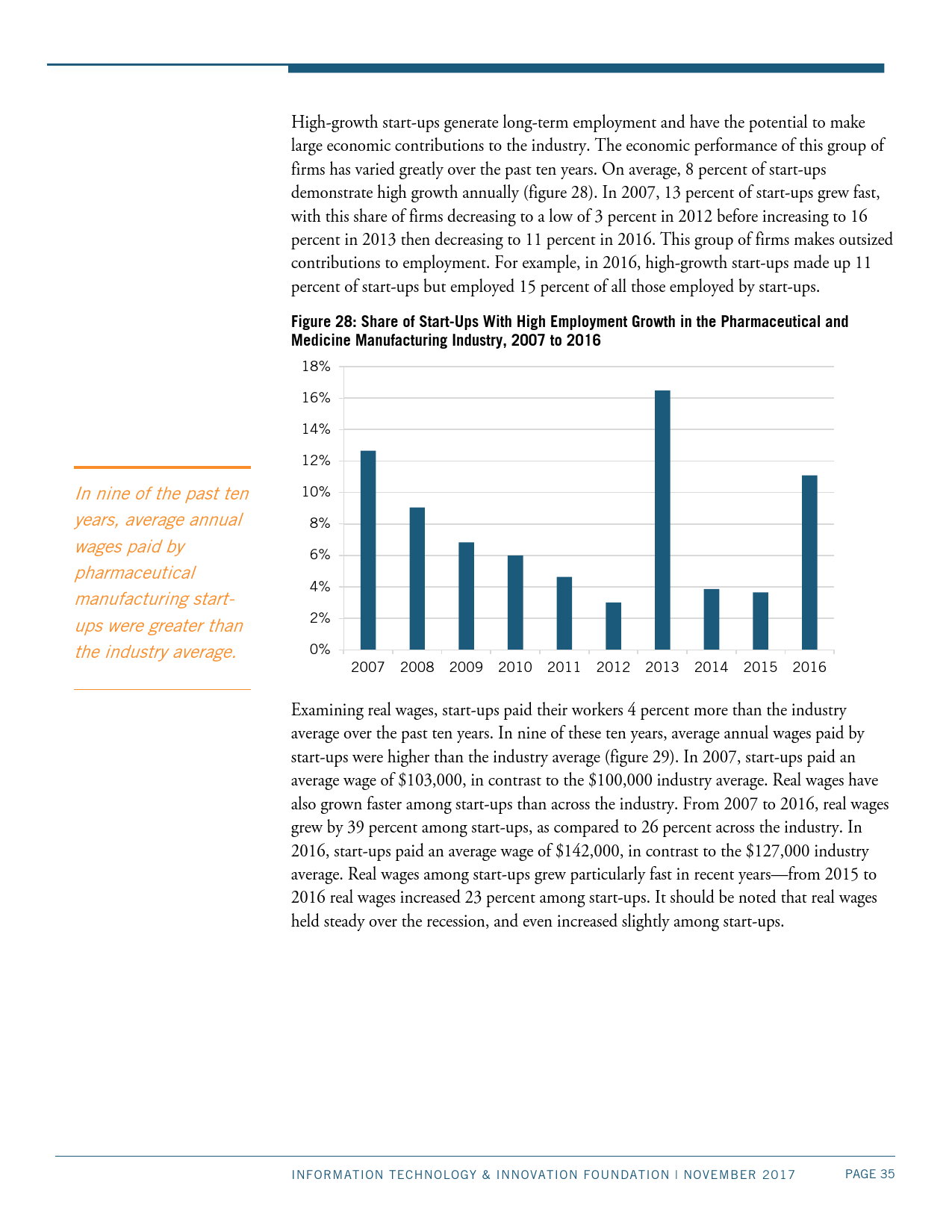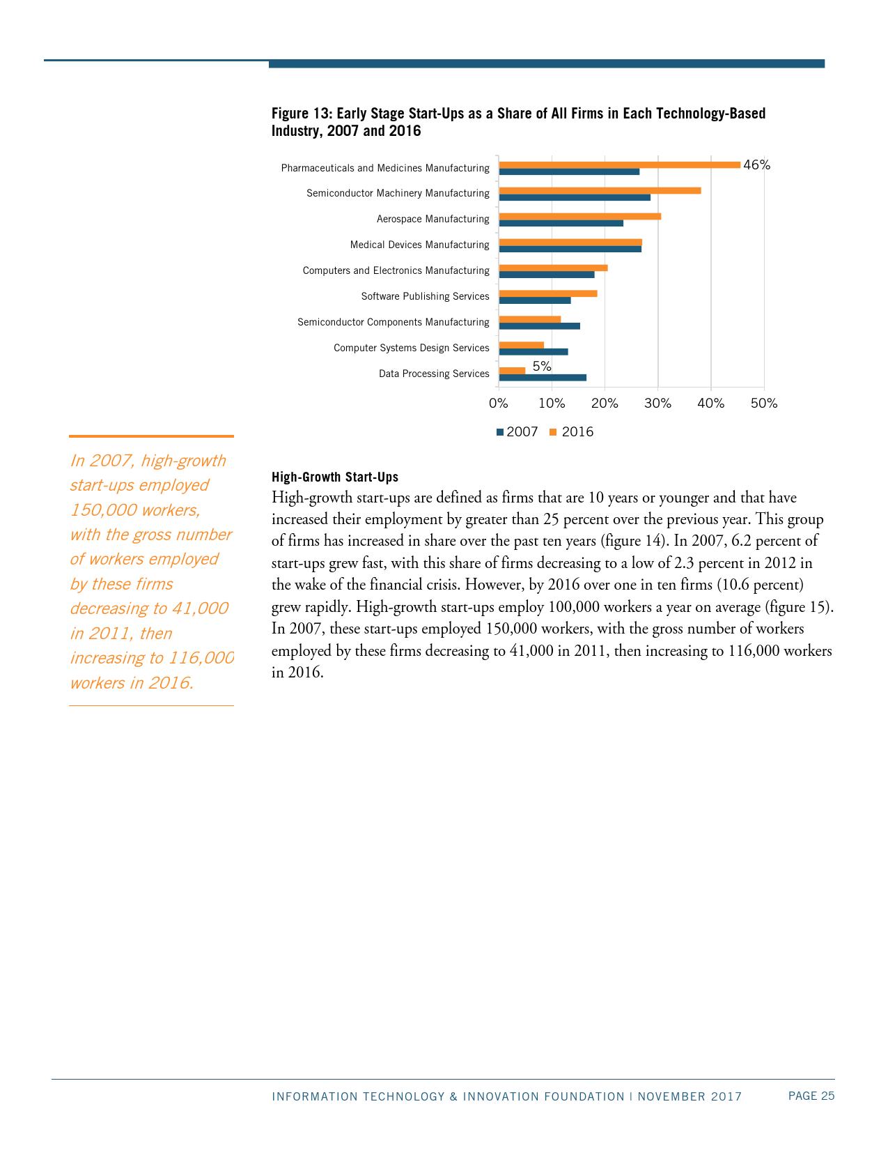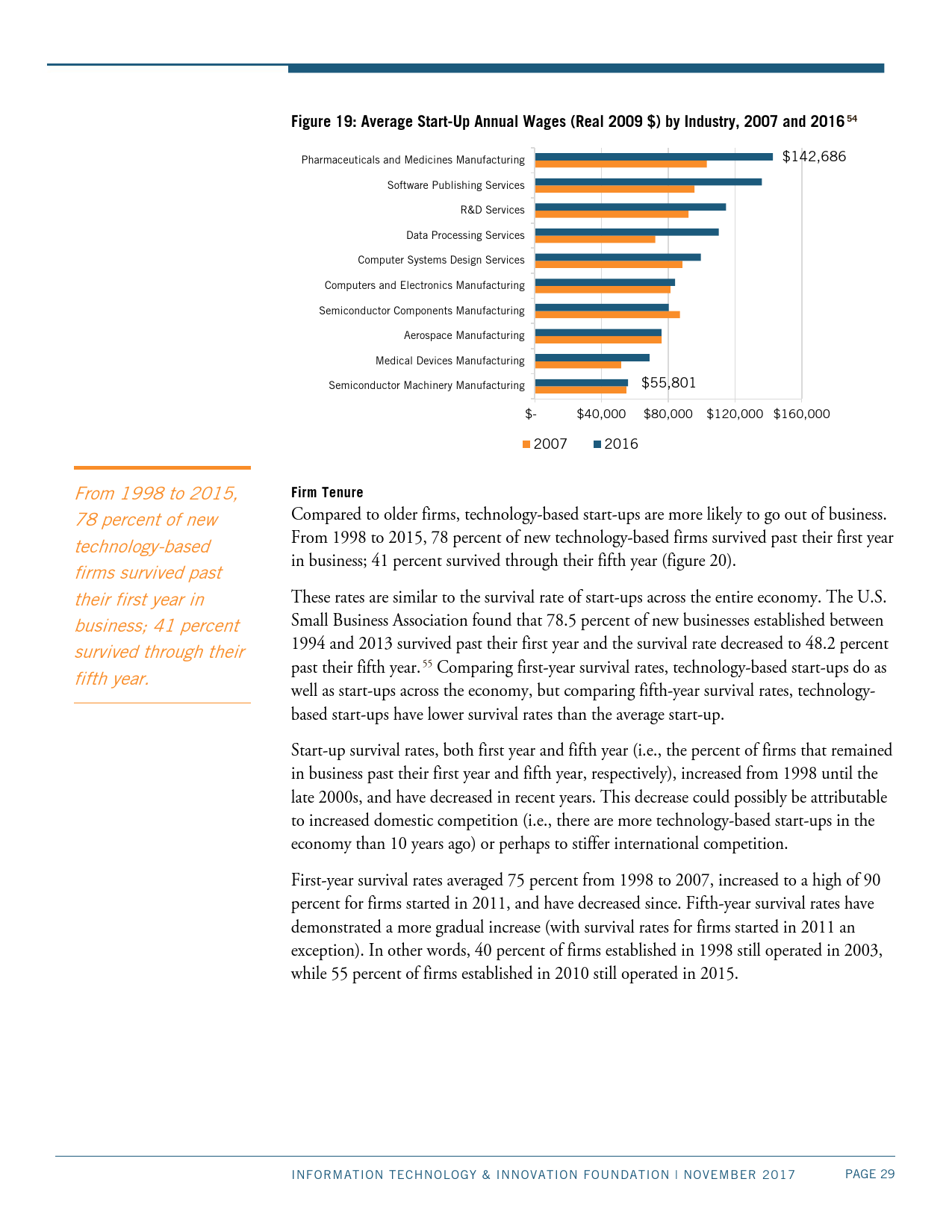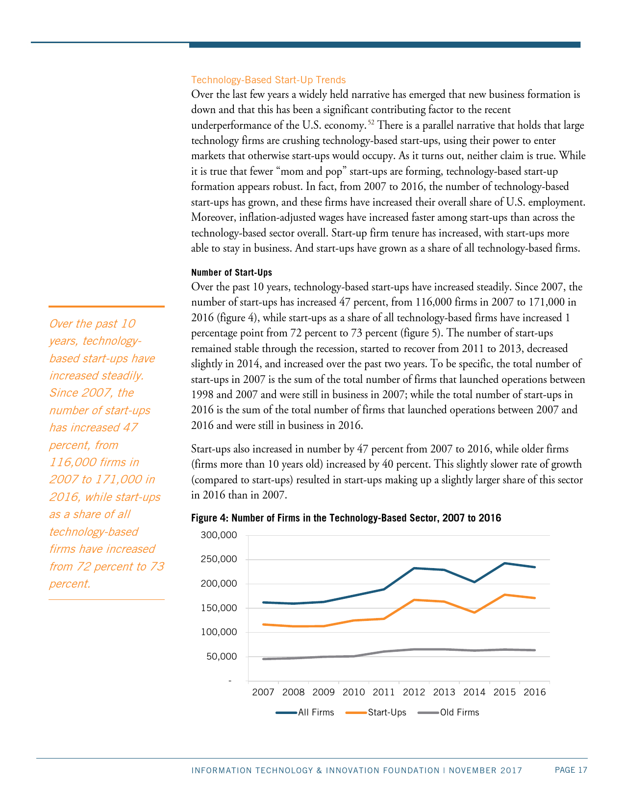 目前普遍认为美国创业率较低并成为严重问题,但就科技企业来说这一情况乐观很多。麻省理工学院的Scott Stern发现大约5%初创企业是高质量的,他们有显著的创新和增长潜力,同时发现这些初创企业在过去十年取得巨大增长。本报告的分析支持这一判断。从2007年到2016年,技术型初创企业的数量已经增长了47%。此外,技术型初创企业的工资增长高于美国总体工资增长(分别为20% 和3%),2012-2016年高增长科技型初创企业平均占比份额高于2007年至2011年(10% 和6%)。由此可以看出最近几年初创企业创造了更多的就业。