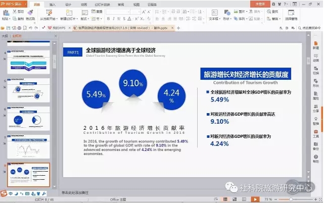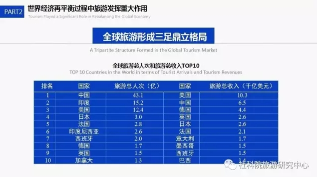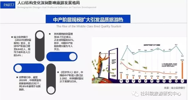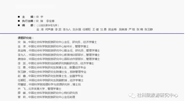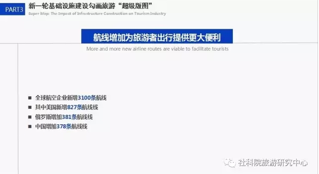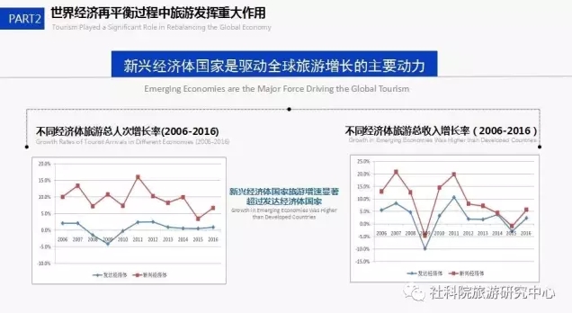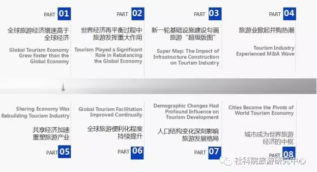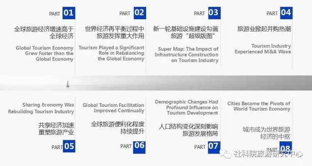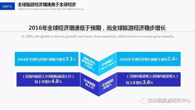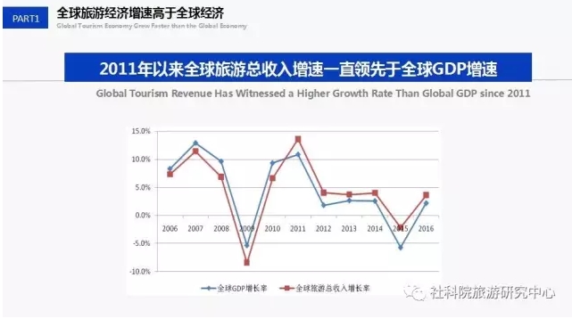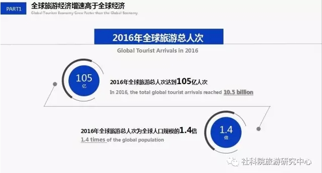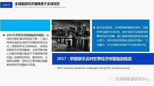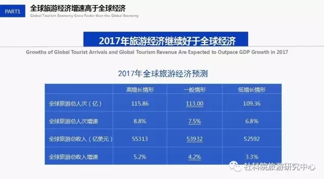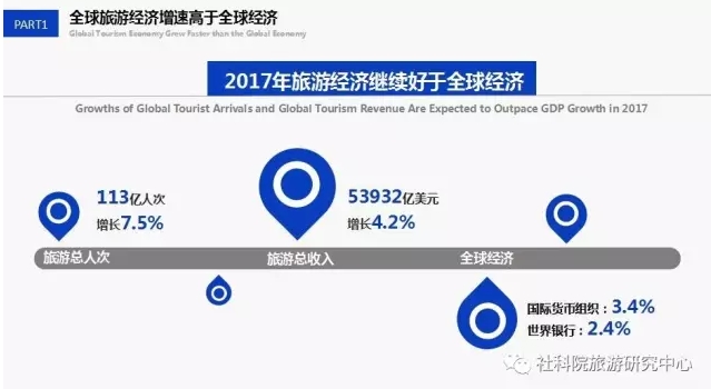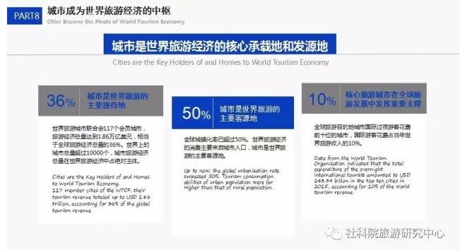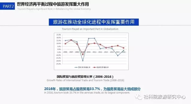 社科院:世界旅游经济趋势报告(2017) 中国社会科学院旅游研究中心主任宋瑞研究员代表课题组在中国出境游论坛暨世界旅游城市联合会研究成果发布会上发布了《世界旅游经济趋势报告(2017)》。该报告由世界旅游城市联合会(WTCF)委托中国社会科学院旅游研究中心完成。 该报告基于对全球旅游经济总规模等核心数据的分析与预测,围绕 “旅游在世界经济格局中的作用”这一主线,从八个方面揭示了世界旅游经济的发展趋势。 以下为宋瑞主任在成果发布会上展示的幻灯片(slides): 更多阅读:社科院:2015年中国自驾游年度发展报告WTOF:2018世界旅游经济趋势报告CPIC&社科院:2021年居民养老规划与风险管理白皮书社科院&阿里研究中心:2011年中国农民网店数为131万家 交易总额为209亿元文化和旅游部:2018年10月1日-4日全国接待国内游客5.02亿人次陈宇佳丨共享民宿服务失败类型探究Amadeus:2022年8月份酒店市场洞察中国旅游研究院:2022年上半年旅游热度报告中国旅游研究院:中国游客赴欧旅游趋势报告中国微度假消费趋势调查报告(2022)中国旅游研究院:中国研学旅行发展报告2022-2023中国旅游研究院:中国出境旅游发展年度报告2021中国旅游研究院:中国研学旅行发展报告2021中国旅游研究院:”文化赋能旅游,旅游振兴乡村”-域见中国·2021年文旅行业专题报告中国旅游研究院:2022中国旅游集团化发展报告