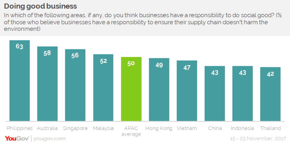 在亚太地区,一半的消费者认为企业应确保供应链不会损害环境(50%)。2/3的菲律宾消费者这么认为(63%),是该地区最高的;而在泰国则下降到42%,是该地区最低的。