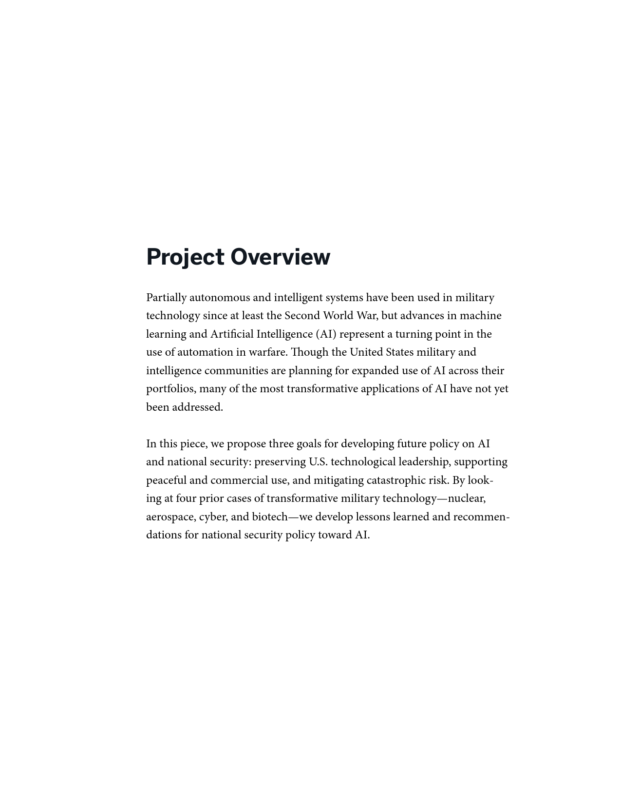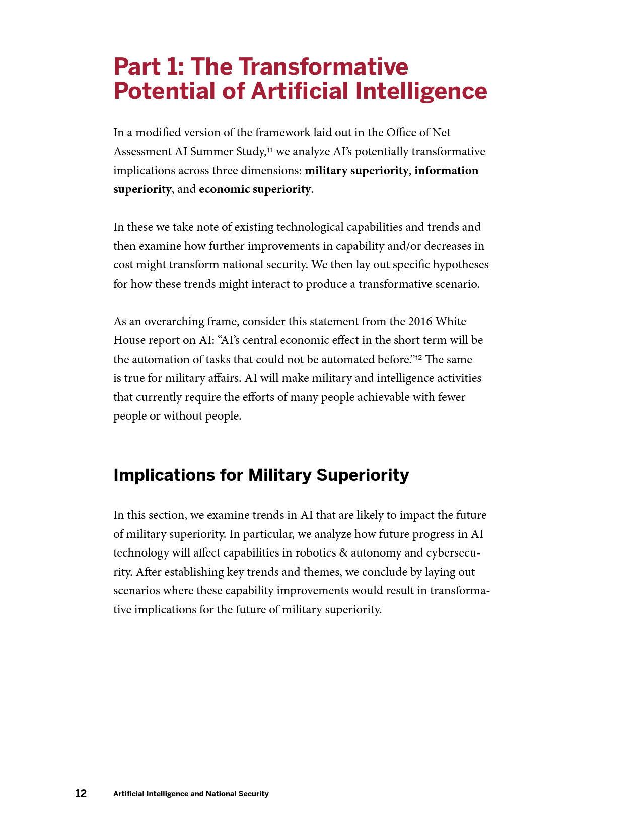 虽然美国军事和情报界计划在投资组合中纳入更多人工智能技术,但最具颠覆性的AI应用尚未实现。报告提出了制定人工智能和国家安全未来政策的三个目标: