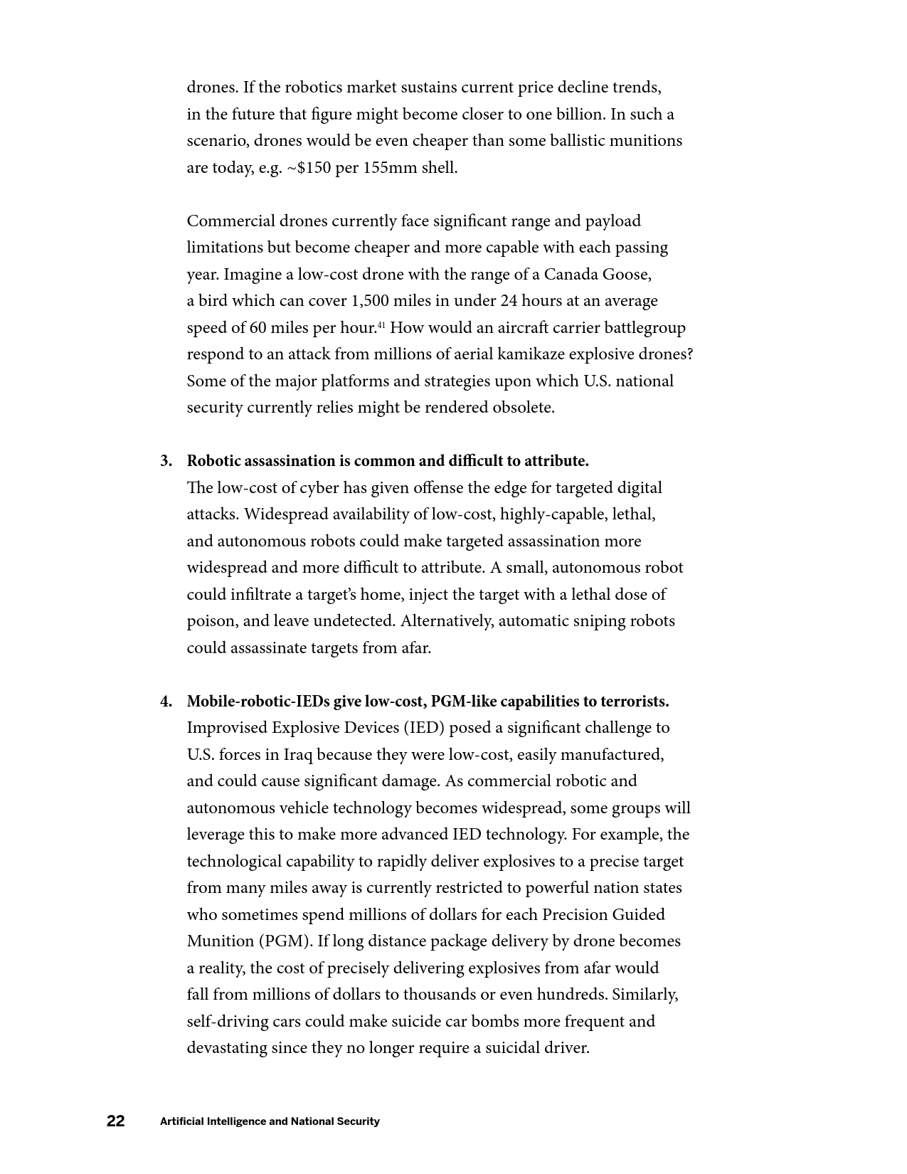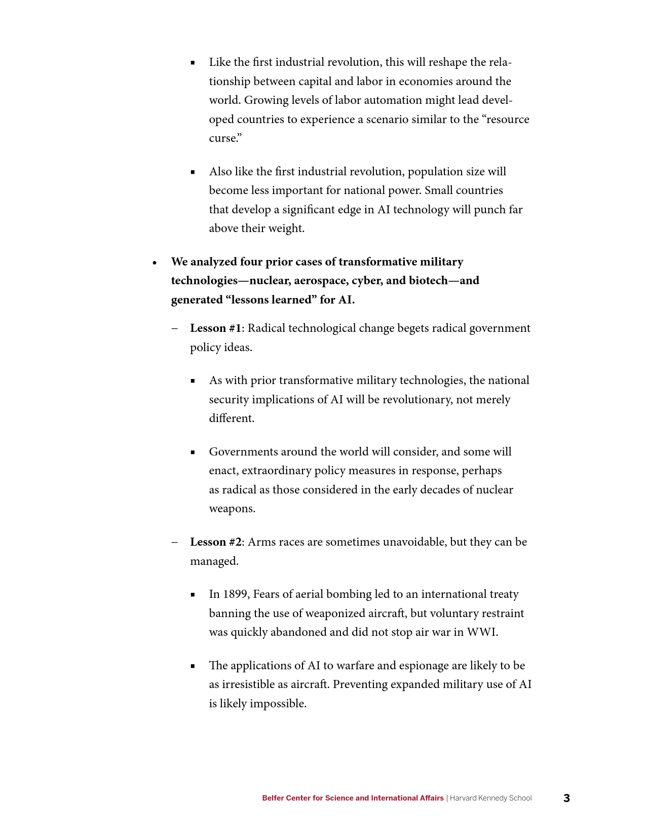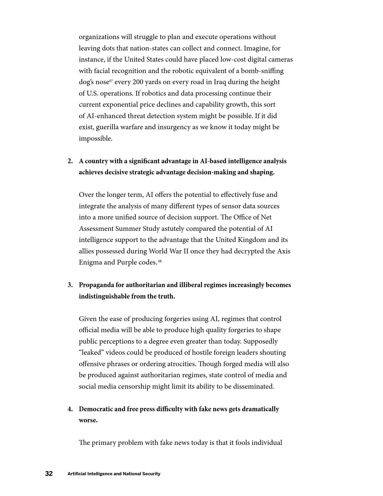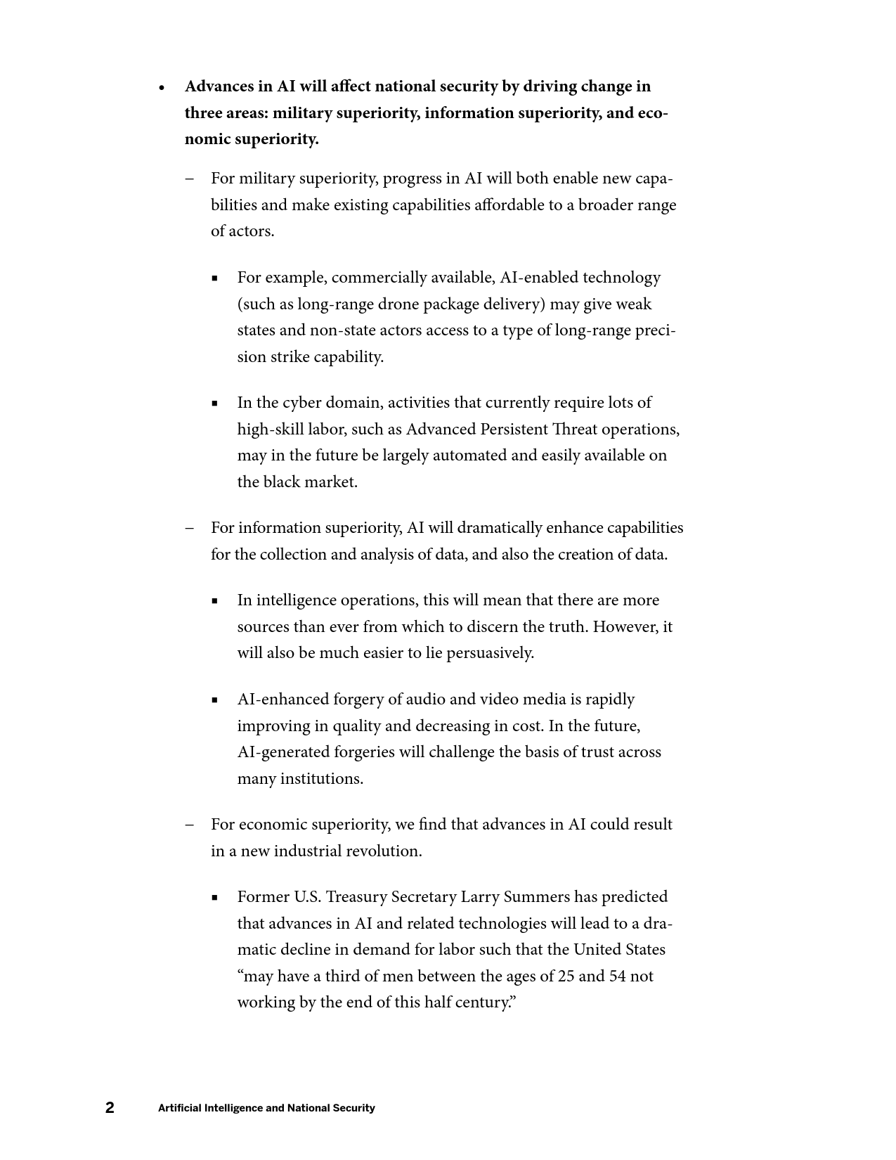 在军事方面,AI的发展将产生新的能力,并使现有能力成本被更广泛的行为体所接受,AI催生的商业可用技术(如远程无人机包裹运送等)可能会使弱国和非国家行为体获得远程精准打击能力。在网络领域,目前需要大量高技能劳动力的活动(如先进持续性威胁行动等)未来可能会实现高度自动化,并在黑市上广泛出售。在信息优势方面,AI将大幅提升数据收集、分析以及建立数据的能力。在情报行动中,意味着有越来越多的信息源可供分辨真相;相应的,制造伪情报也变得更加便利。但同时,借助AI技术,伪造音视频媒体的质量迅速提升,同时成本迅速下降。在经济方面,AI的发展可能会带来一次新的产业革命,将重新塑造世界经济中的劳资关系。