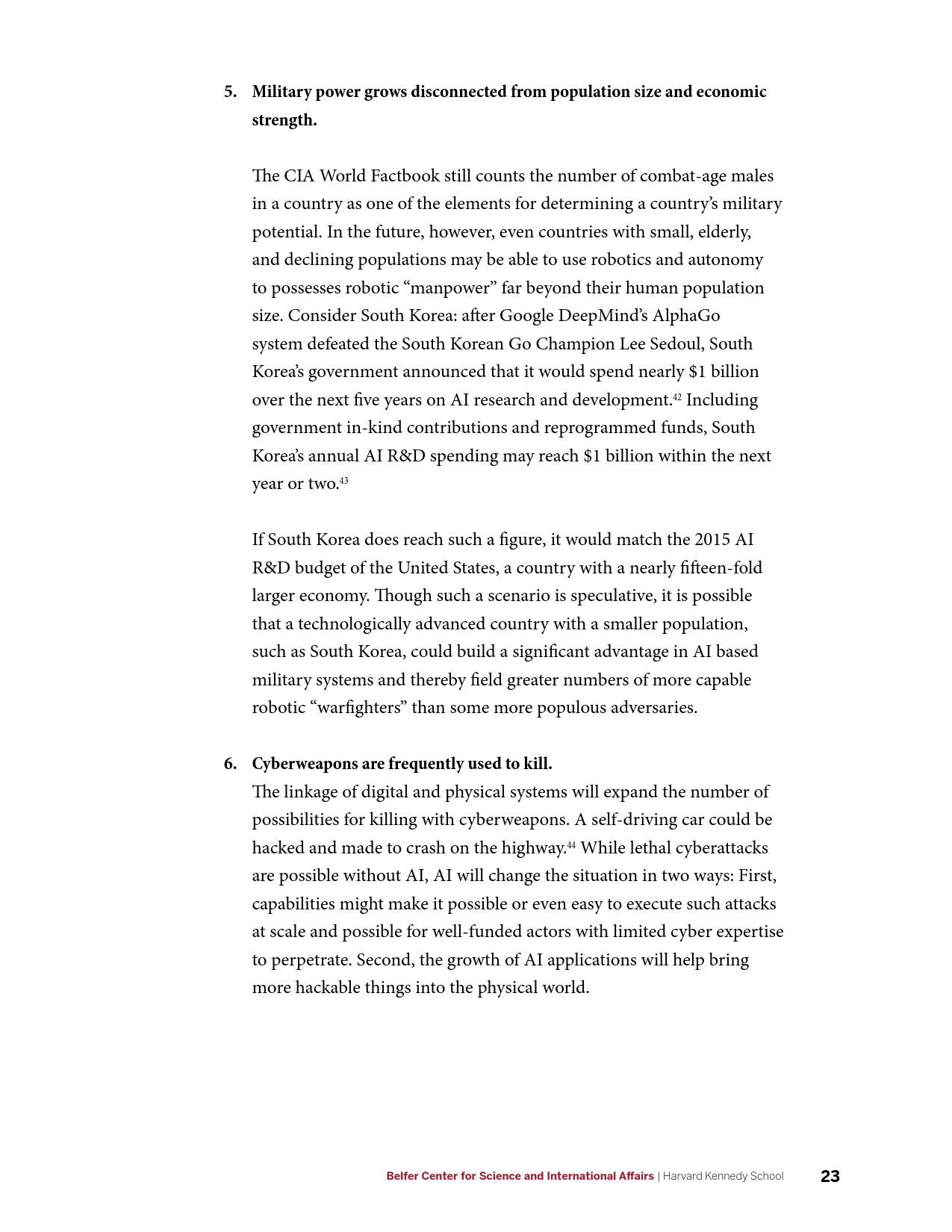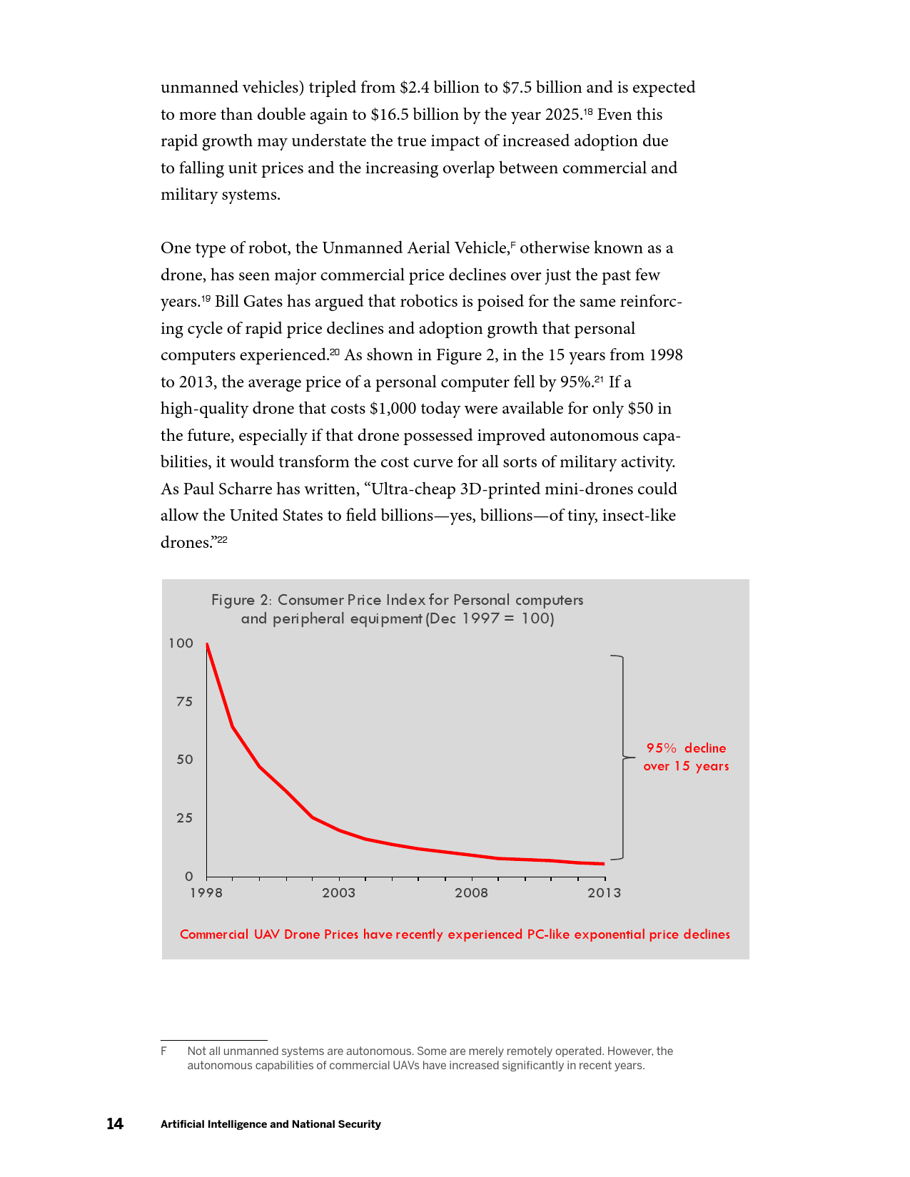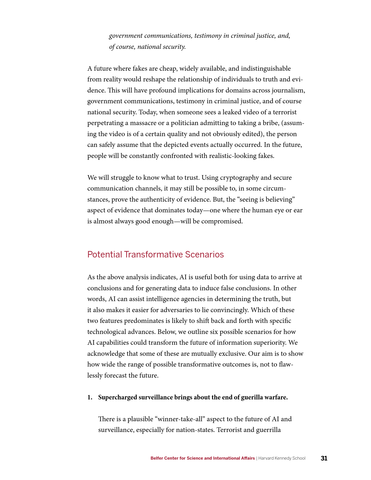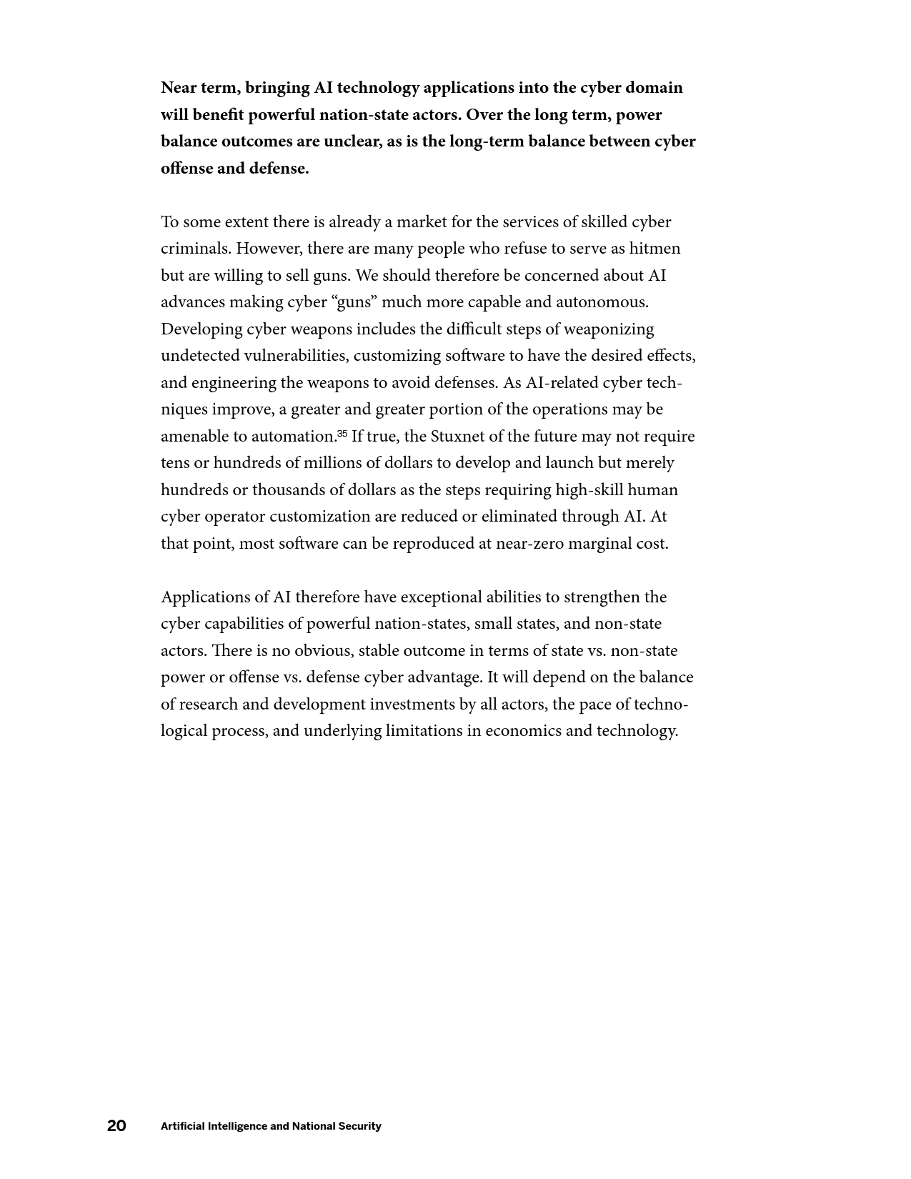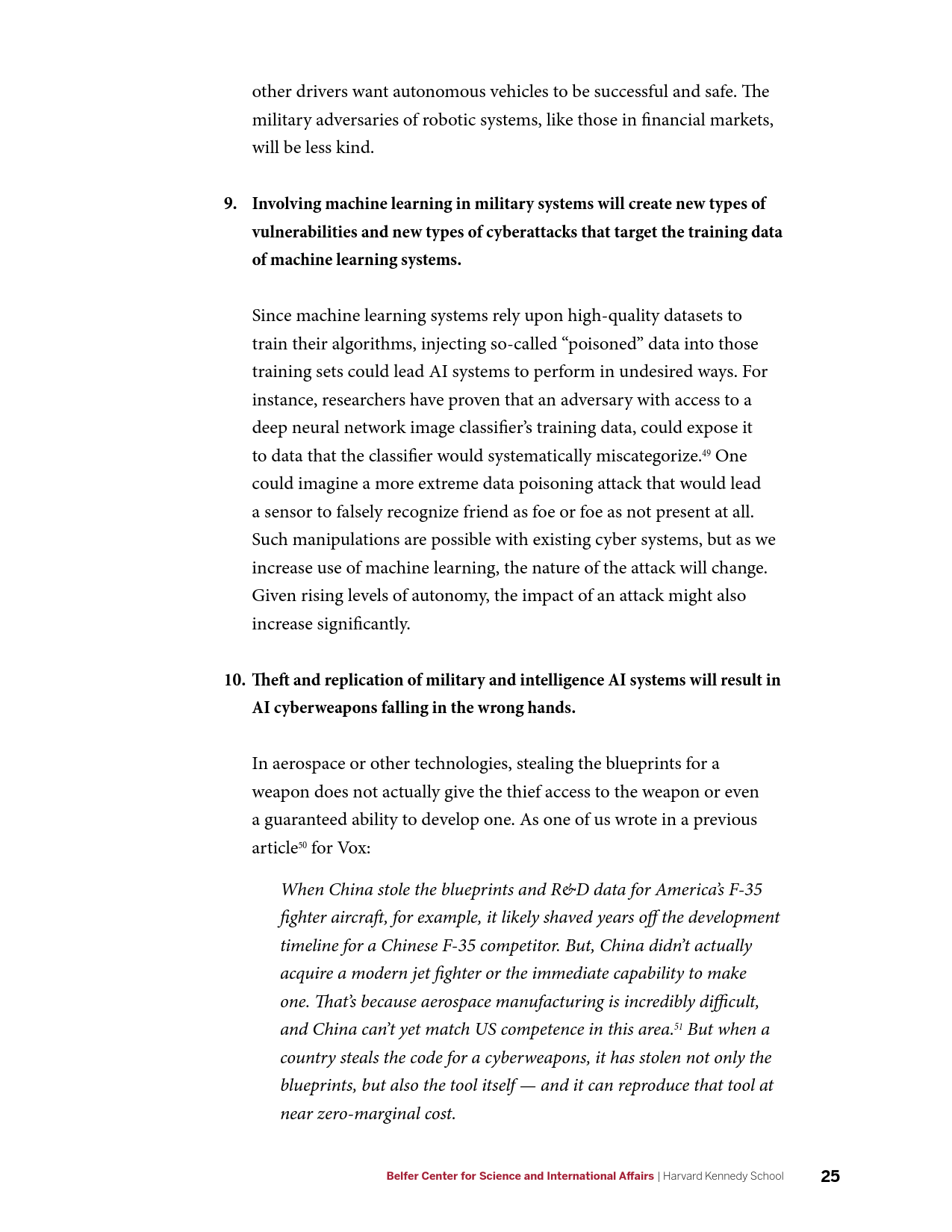 在军事方面,AI的发展将产生新的能力,并使现有能力成本被更广泛的行为体所接受,AI催生的商业可用技术(如远程无人机包裹运送等)可能会使弱国和非国家行为体获得远程精准打击能力。在网络领域,目前需要大量高技能劳动力的活动(如先进持续性威胁行动等)未来可能会实现高度自动化,并在黑市上广泛出售。在信息优势方面,AI将大幅提升数据收集、分析以及建立数据的能力。在情报行动中,意味着有越来越多的信息源可供分辨真相;相应的,制造伪情报也变得更加便利。但同时,借助AI技术,伪造音视频媒体的质量迅速提升,同时成本迅速下降。在经济方面,AI的发展可能会带来一次新的产业革命,将重新塑造世界经济中的劳资关系。