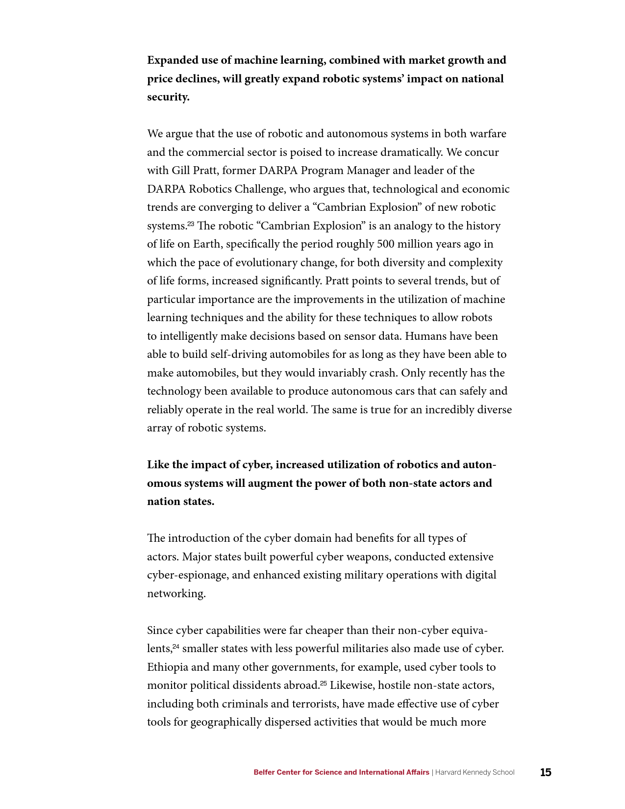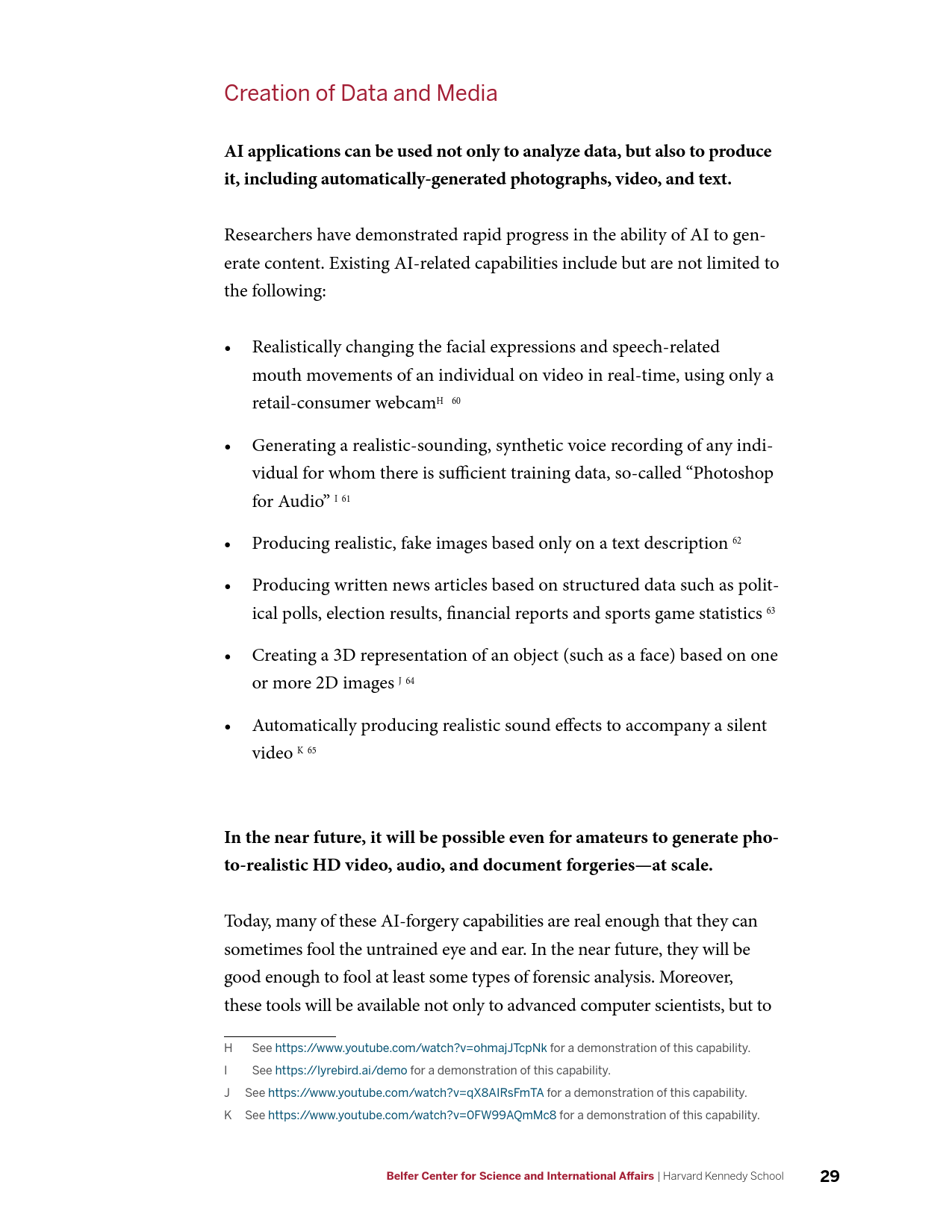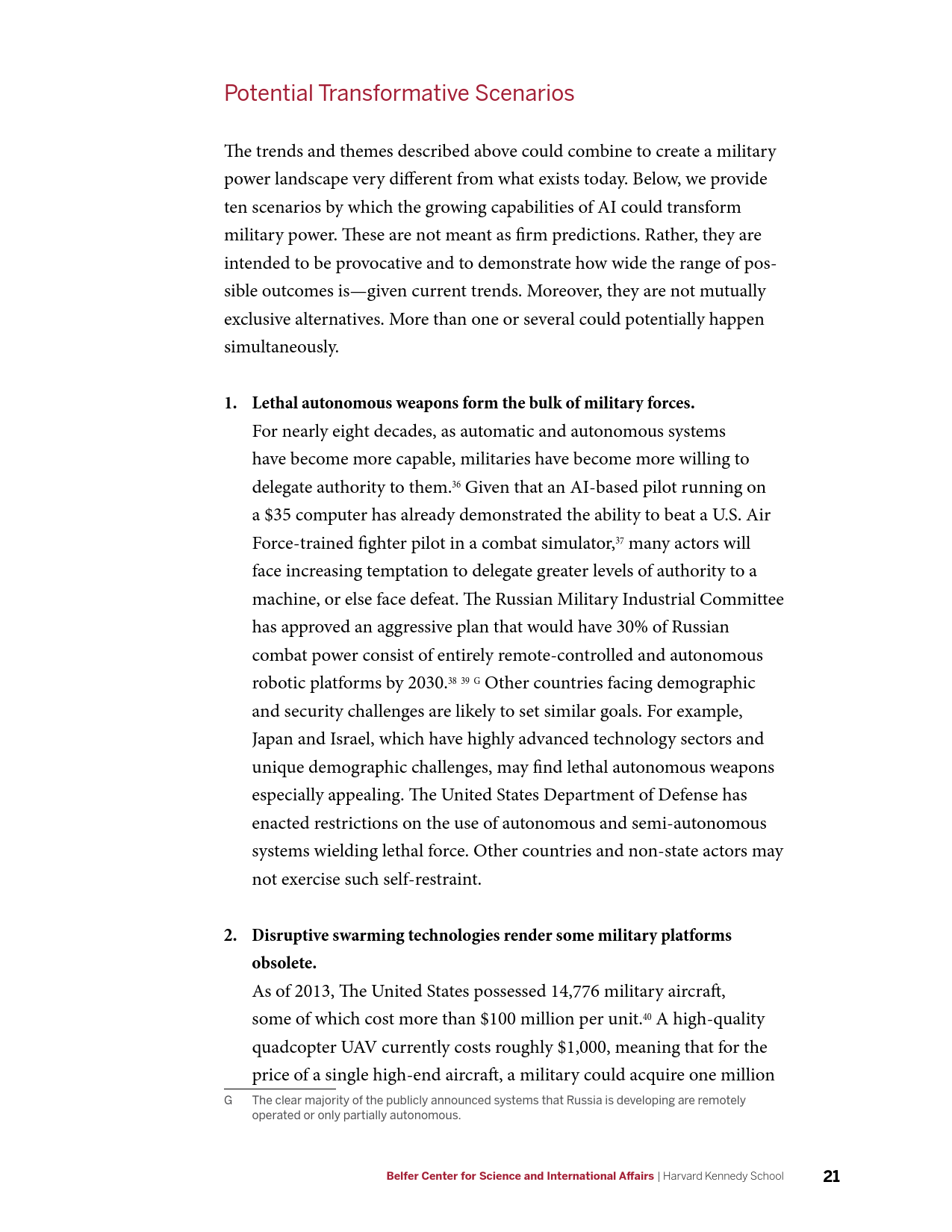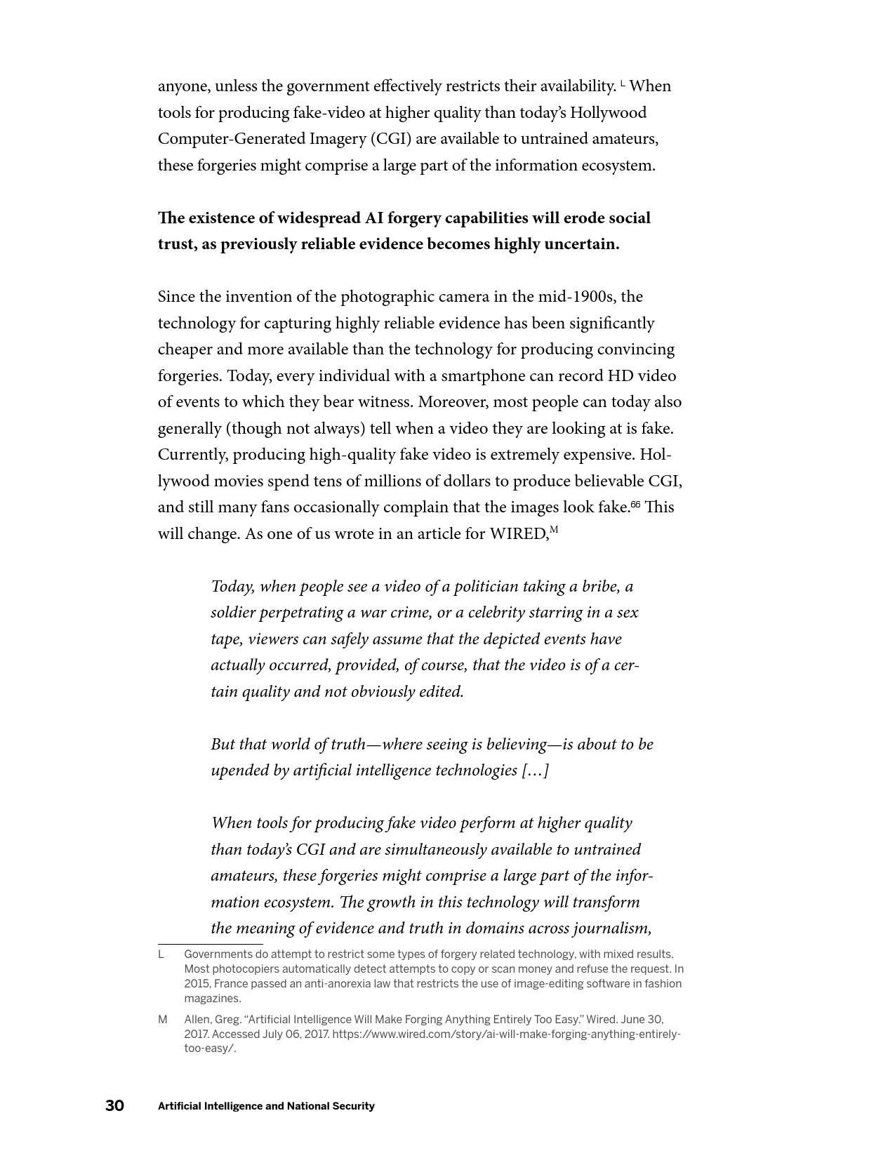 在军事方面,AI的发展将产生新的能力,并使现有能力成本被更广泛的行为体所接受,AI催生的商业可用技术(如远程无人机包裹运送等)可能会使弱国和非国家行为体获得远程精准打击能力。在网络领域,目前需要大量高技能劳动力的活动(如先进持续性威胁行动等)未来可能会实现高度自动化,并在黑市上广泛出售。在信息优势方面,AI将大幅提升数据收集、分析以及建立数据的能力。在情报行动中,意味着有越来越多的信息源可供分辨真相;相应的,制造伪情报也变得更加便利。但同时,借助AI技术,伪造音视频媒体的质量迅速提升,同时成本迅速下降。在经济方面,AI的发展可能会带来一次新的产业革命,将重新塑造世界经济中的劳资关系。