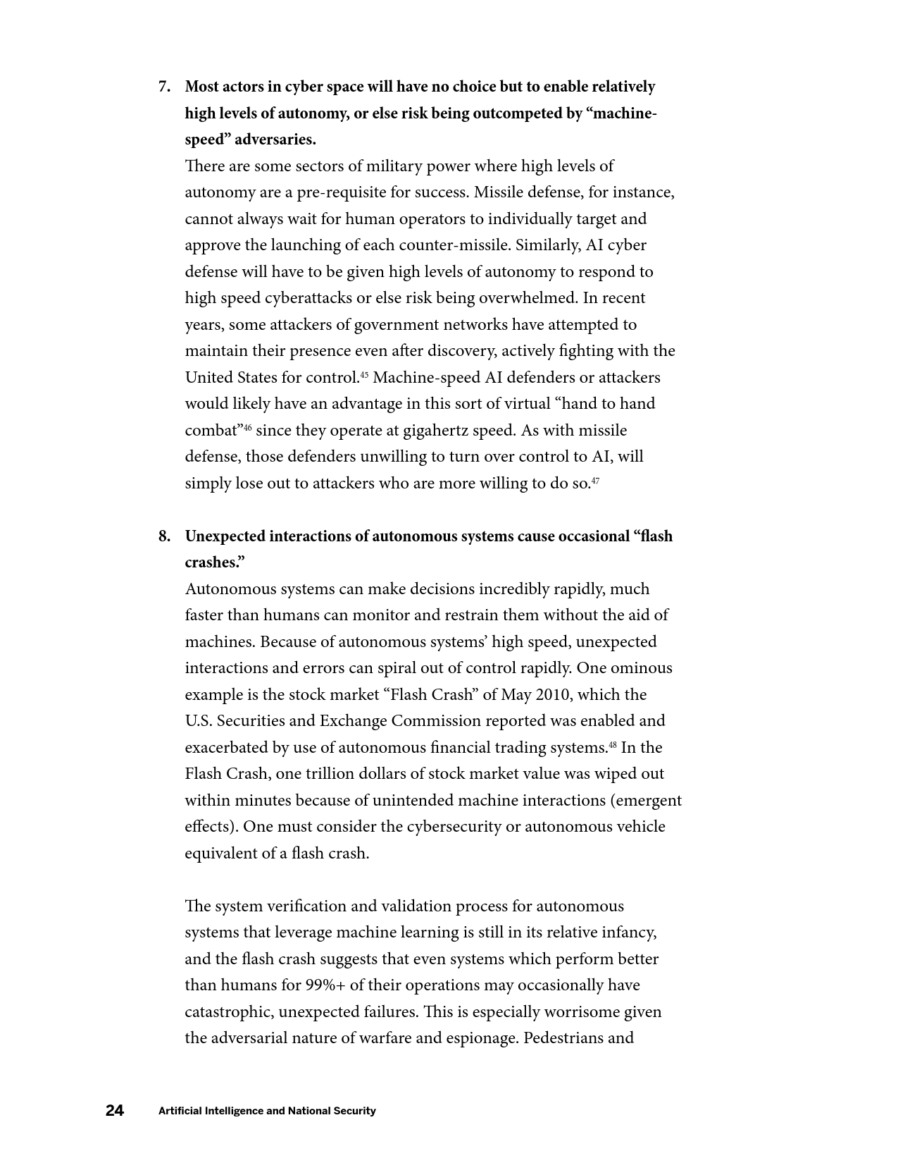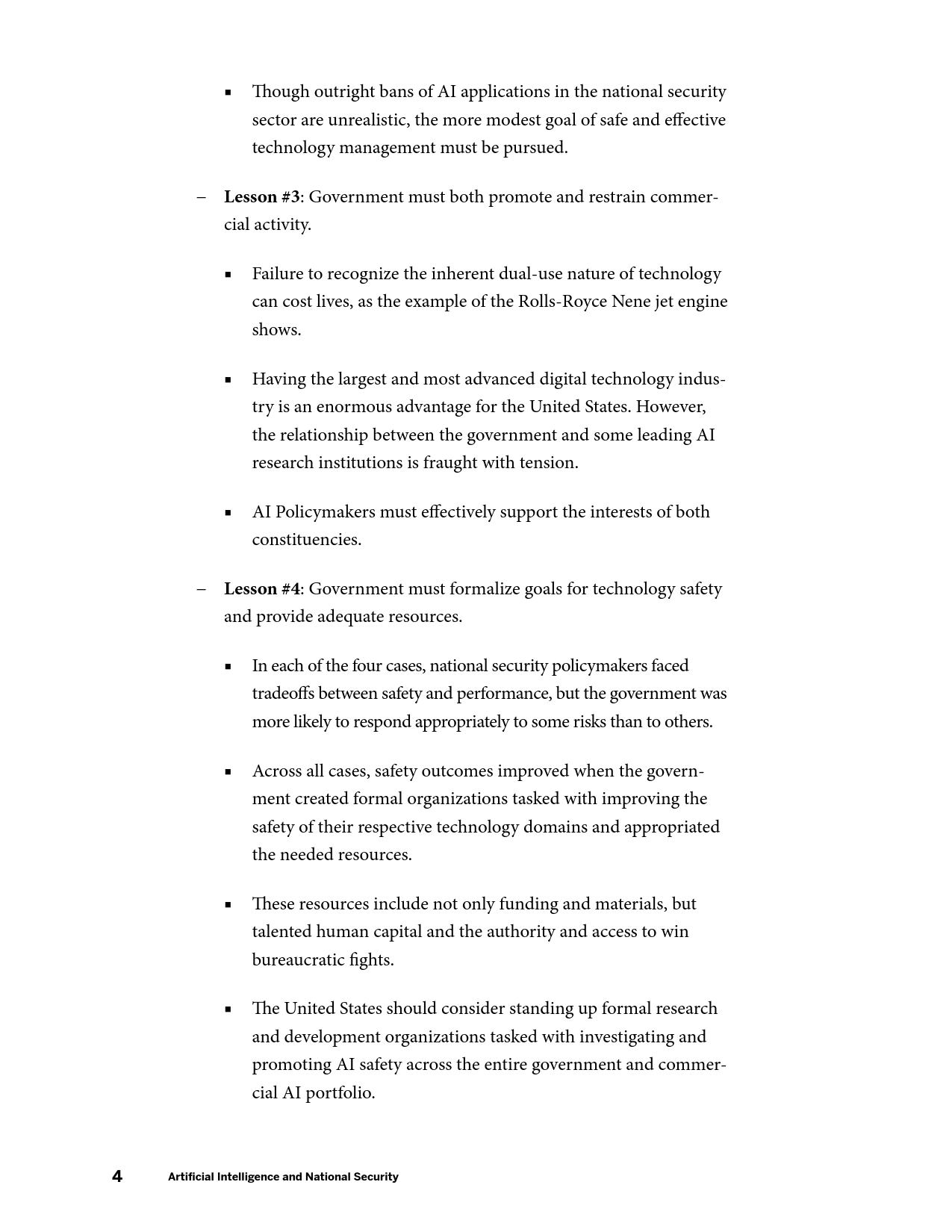国家安全委员会和国务院需研究美国应利用条约的形式限制哪些AI应用;国防和情报部门应设立专门的AI安全机构;DARPA应为AI系统自动防故障和安全运行技术研究提供资金;国家标准与技术研究院和国家安全局应探索防AI造假技术方案。