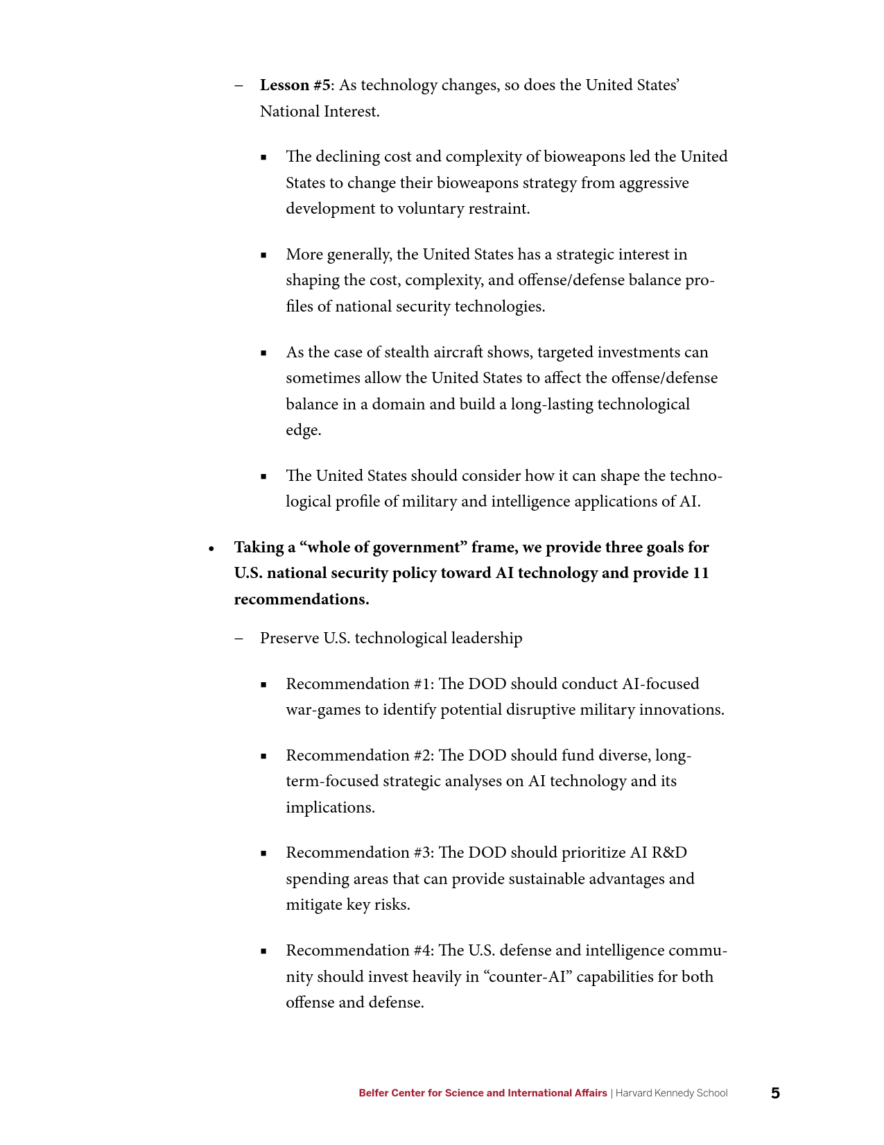 国防部应开展以AI为核心的军事演习,以甄别潜在的颠覆性军事创新;国防部应资助以人工智能技术及影响为主题的各种长期战略分析;国防部应优先考虑能够提供可持续优势并降低核心风险的AI研发投资领域;美国防情报界应大力投资“反AI”的进攻和防御能力。