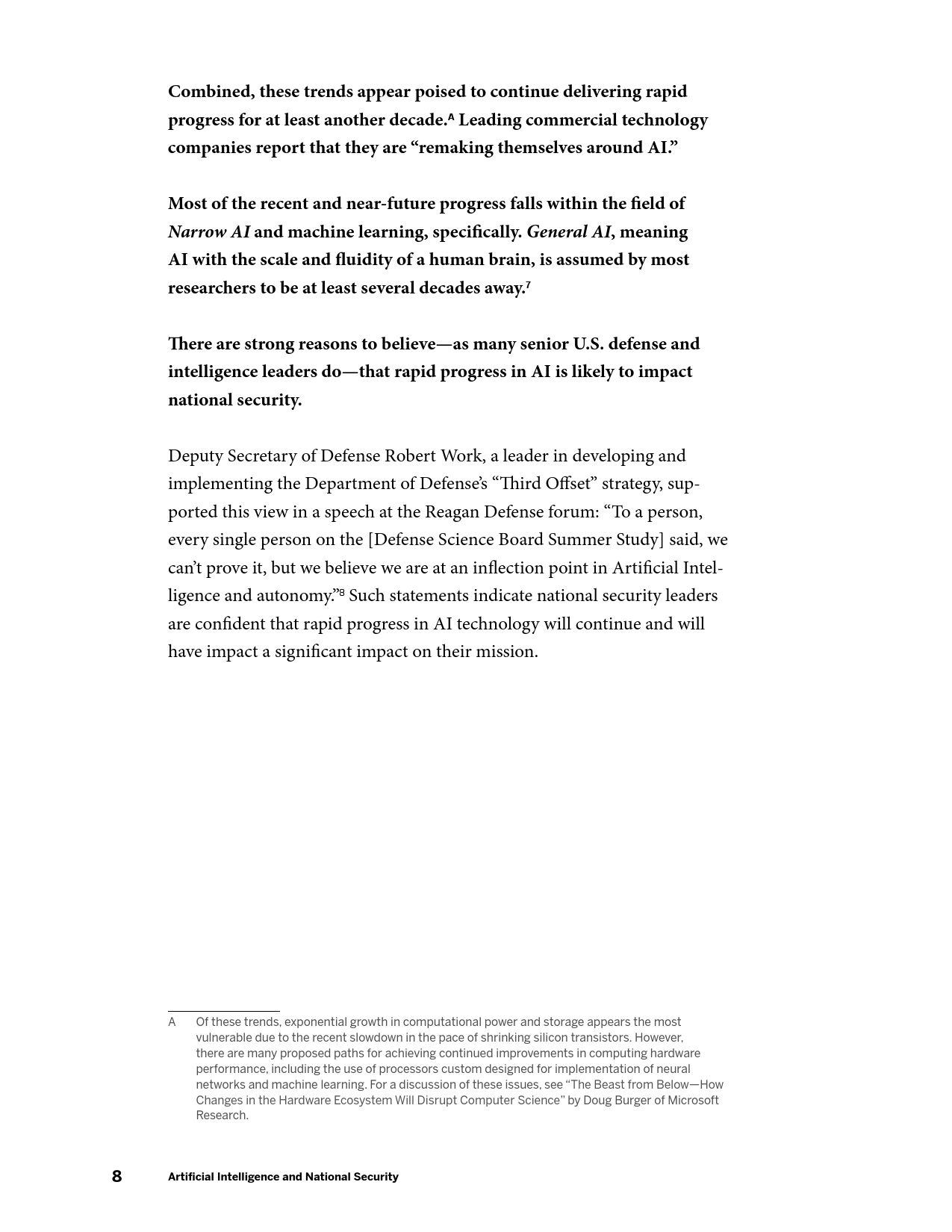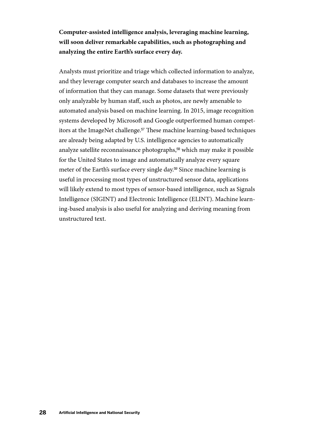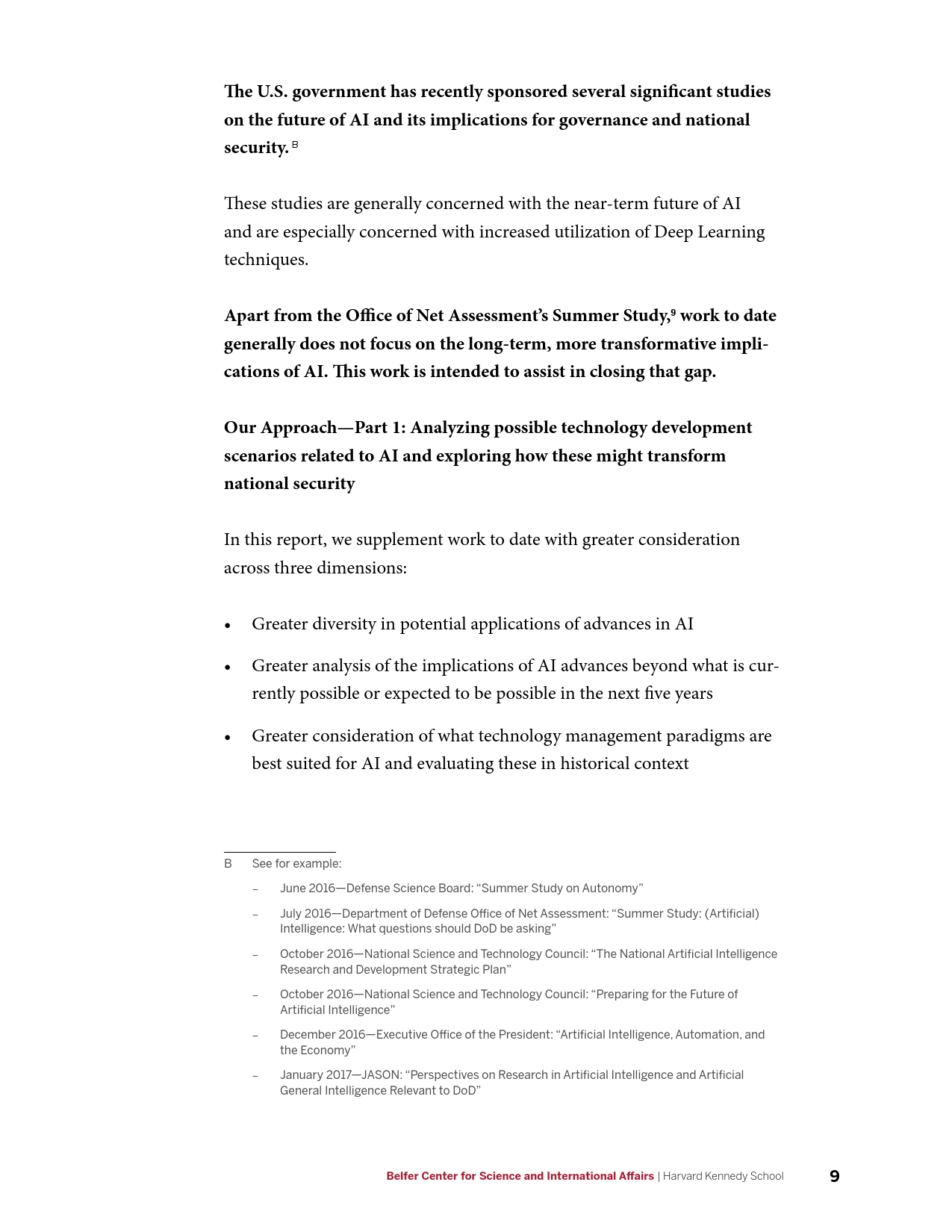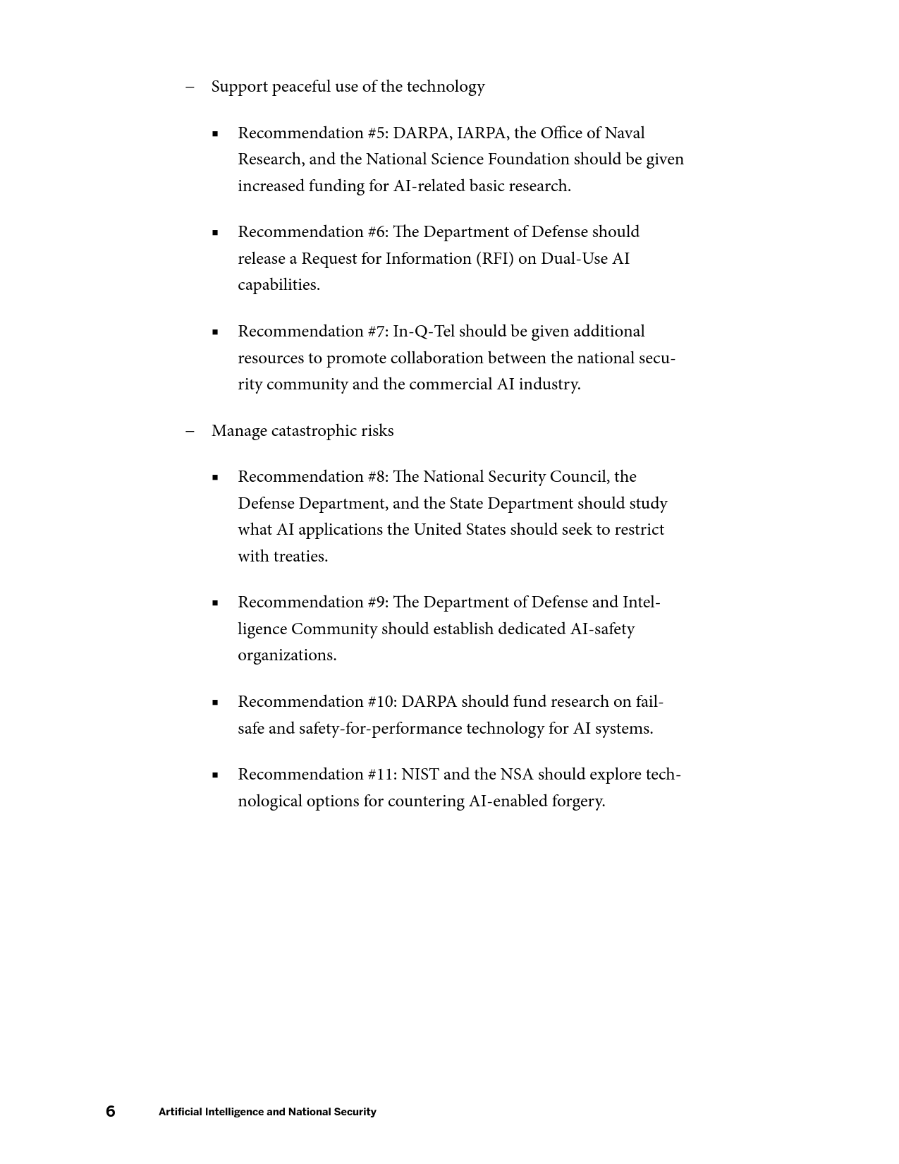 DARPA、IARPA、海军研究办公室和国家科学基金会应增加与AI相关的基础研究经费;国防部应发布关于AI军民两用能力的信息征询书;向美国In-Q-Tel公司(专门服务于中央情报局)提供更多资源,促进国家安全机构和AI商业公司的合作。