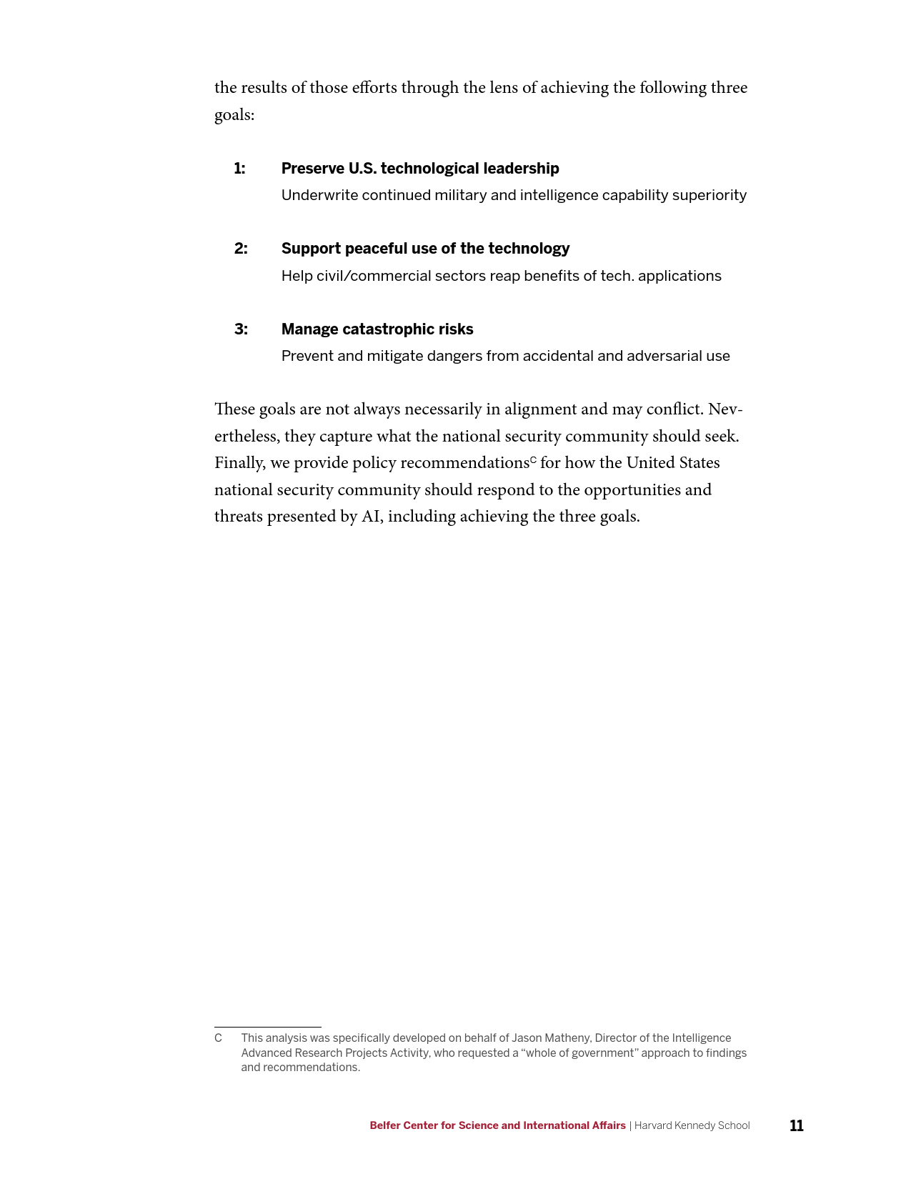 报告对美国政府有关AI技术的国家安全政策提出3项目标和11项建议。