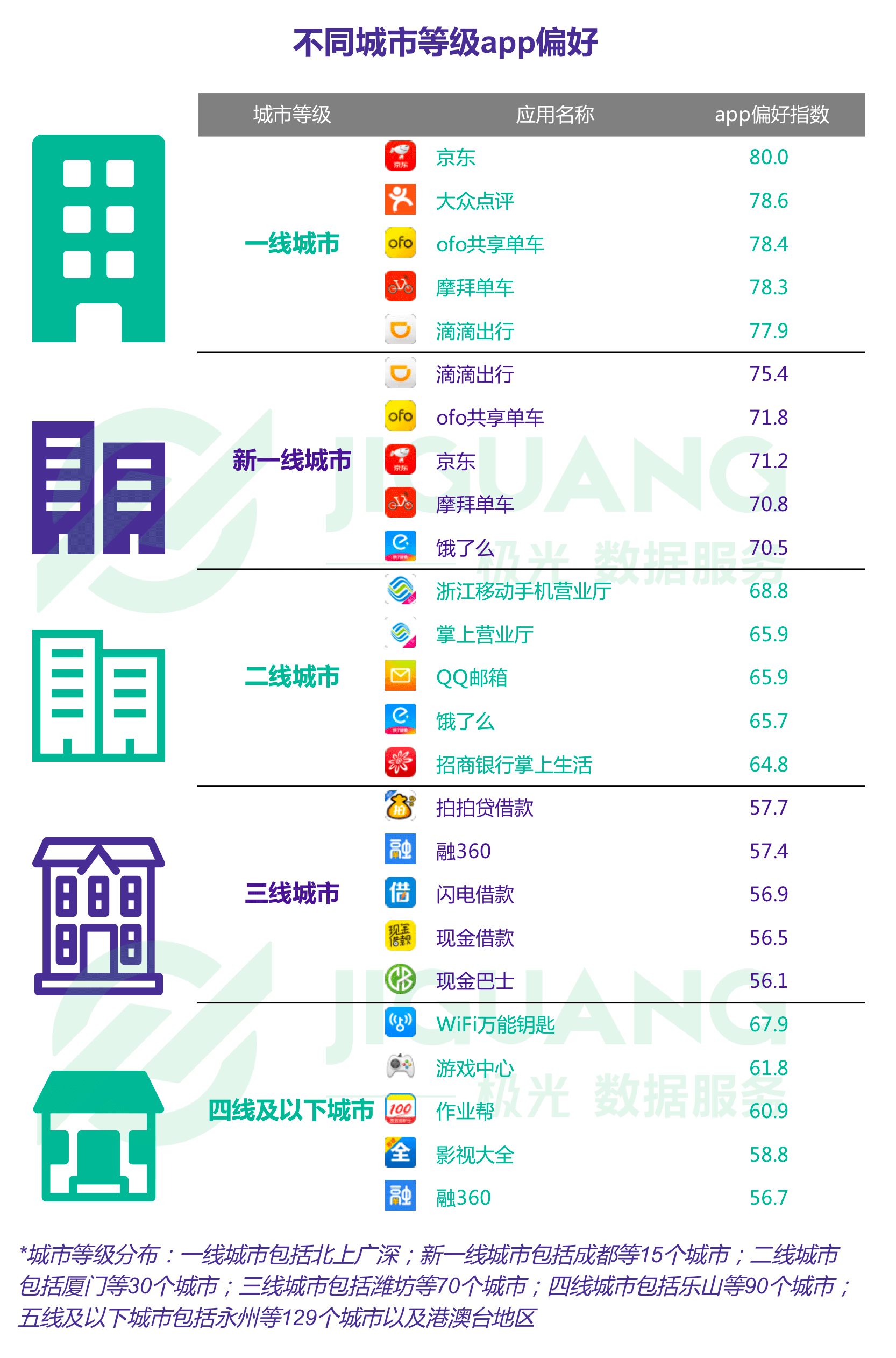 - 共享出行类app滴滴出行、ofo共享单车和摩拜单车在一线及新一线城市移动网民中的偏好度较高,三线城市用户则对P2P app情有独钟