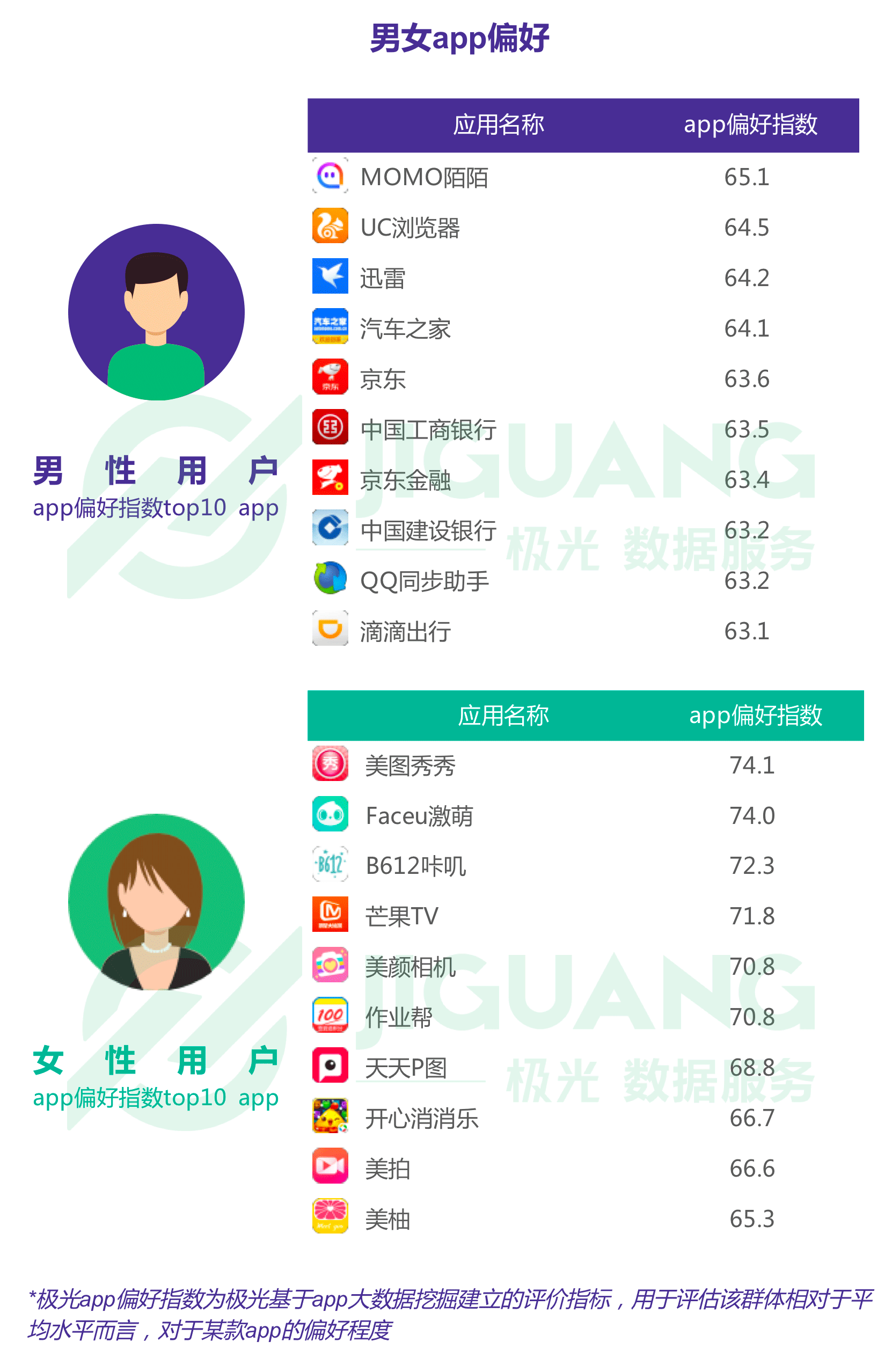 - 男女有别也体现在对app的选择上,在男性用户中偏好度最高的应用是陌陌,女性用户则最爱用美图秀秀、Faceu激萌和B612咔叽等拍照P图类app