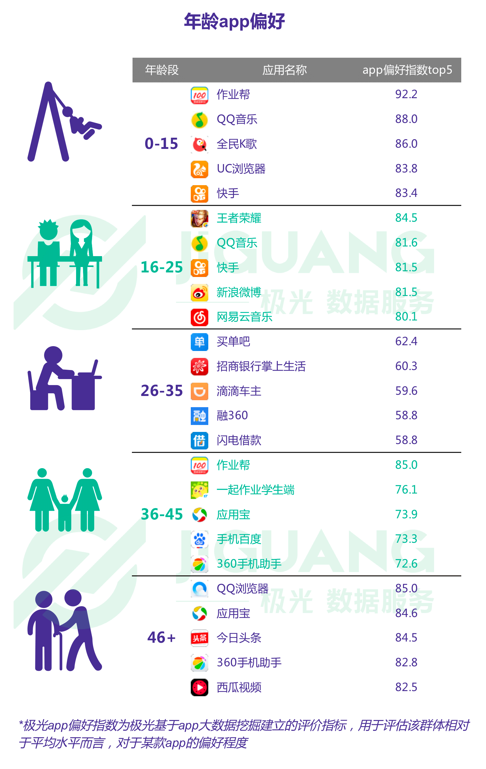 - 各年龄段网民偏好的app都有较显著的特点,在15岁以下的中小学生网民中偏好度最高的app是作业帮,已为人父母的36-45岁网民偏好使用作业帮和一起作业学生端,16-25岁网民则最喜欢打王者荣耀