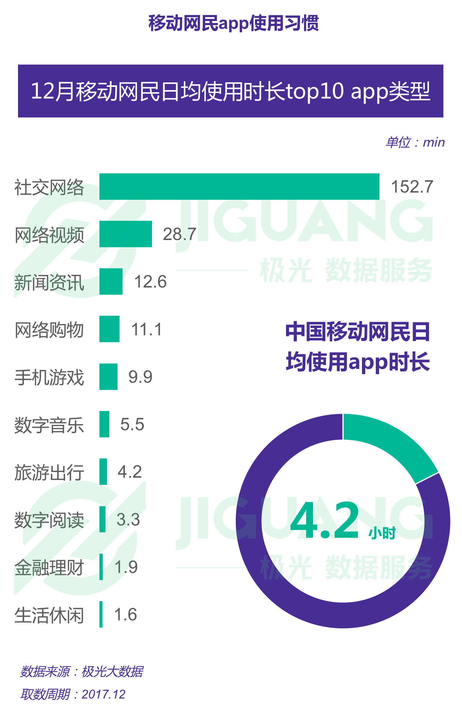- 12月中国移动网民每天花在各类app上的总时长是4.2小时,其中在社交网络app上逗留的时间超过2.5小时,观看网络视频的时间接近30分钟,另外还会花大概12分钟的时间获取新闻资讯,11分钟进行网络购物,以及大约10分钟的时间玩一会手游