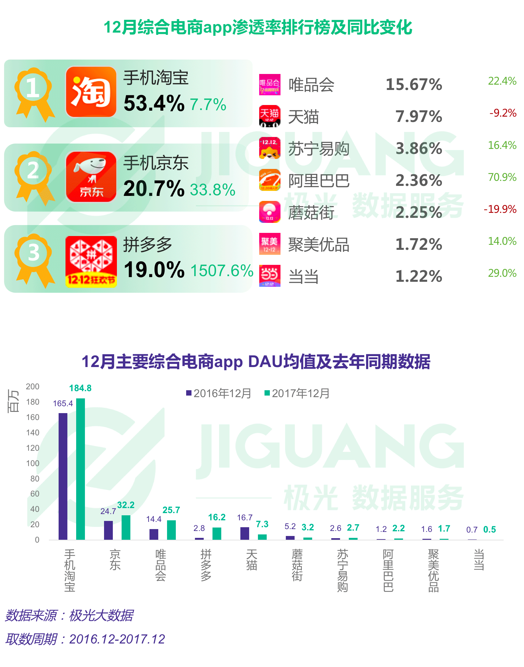 - 手机淘宝、手机京东和拼多多在综合电商app的渗透率排行榜中名列前三甲,他们的市场渗透率分别为53.4%、20.7%和19.0%,拼多多是有史以来“出淘”最成功的一个商业典范