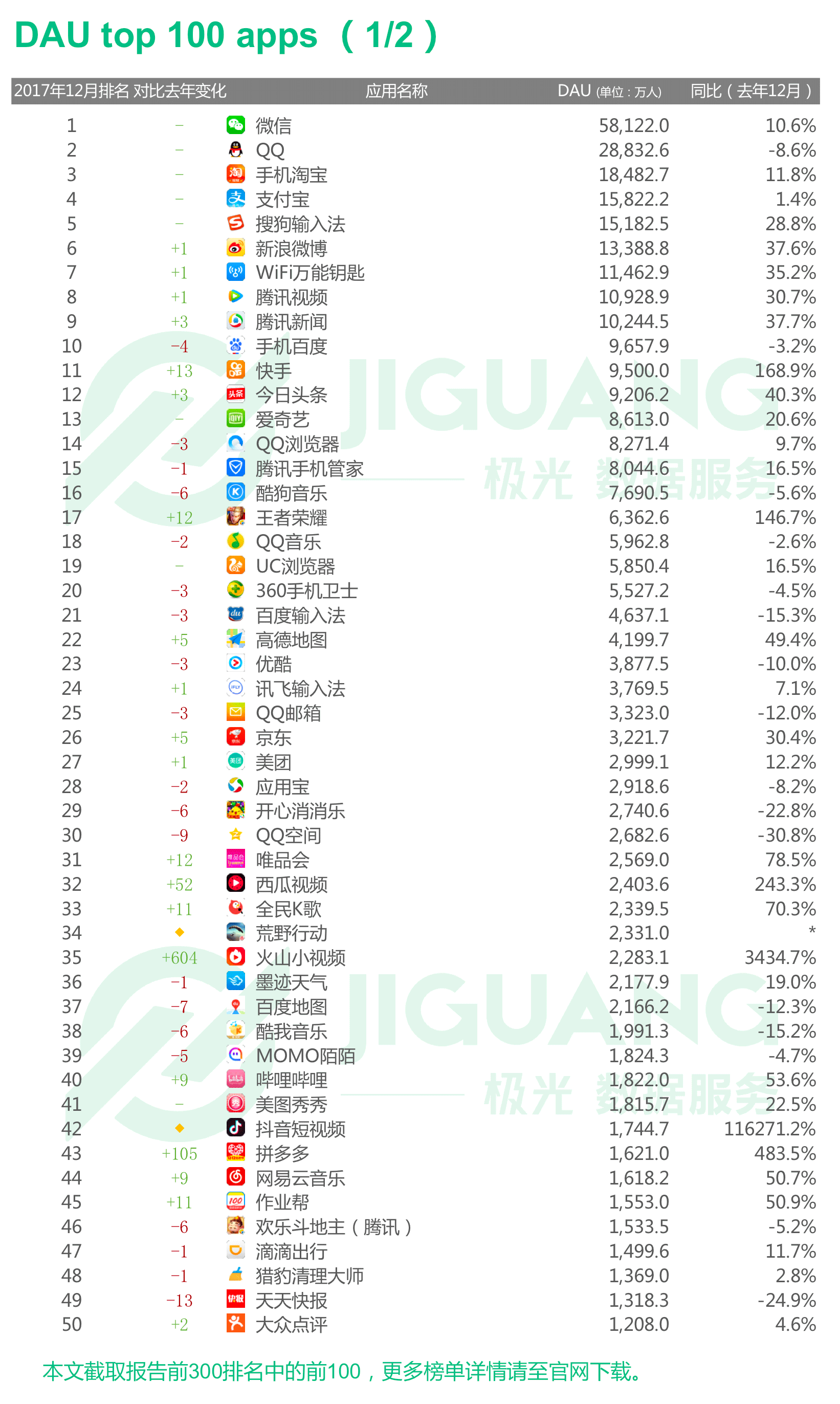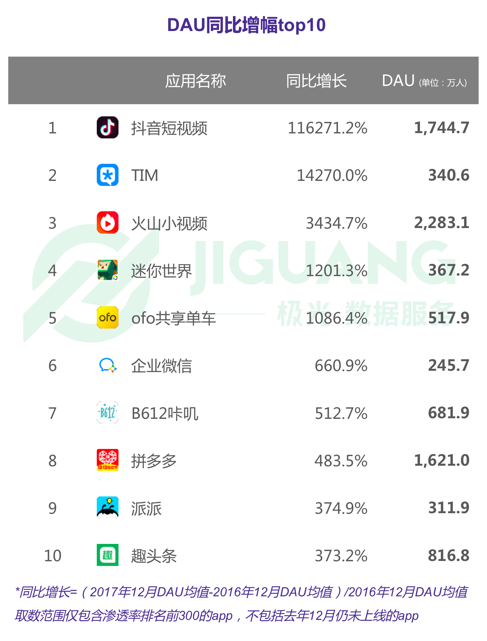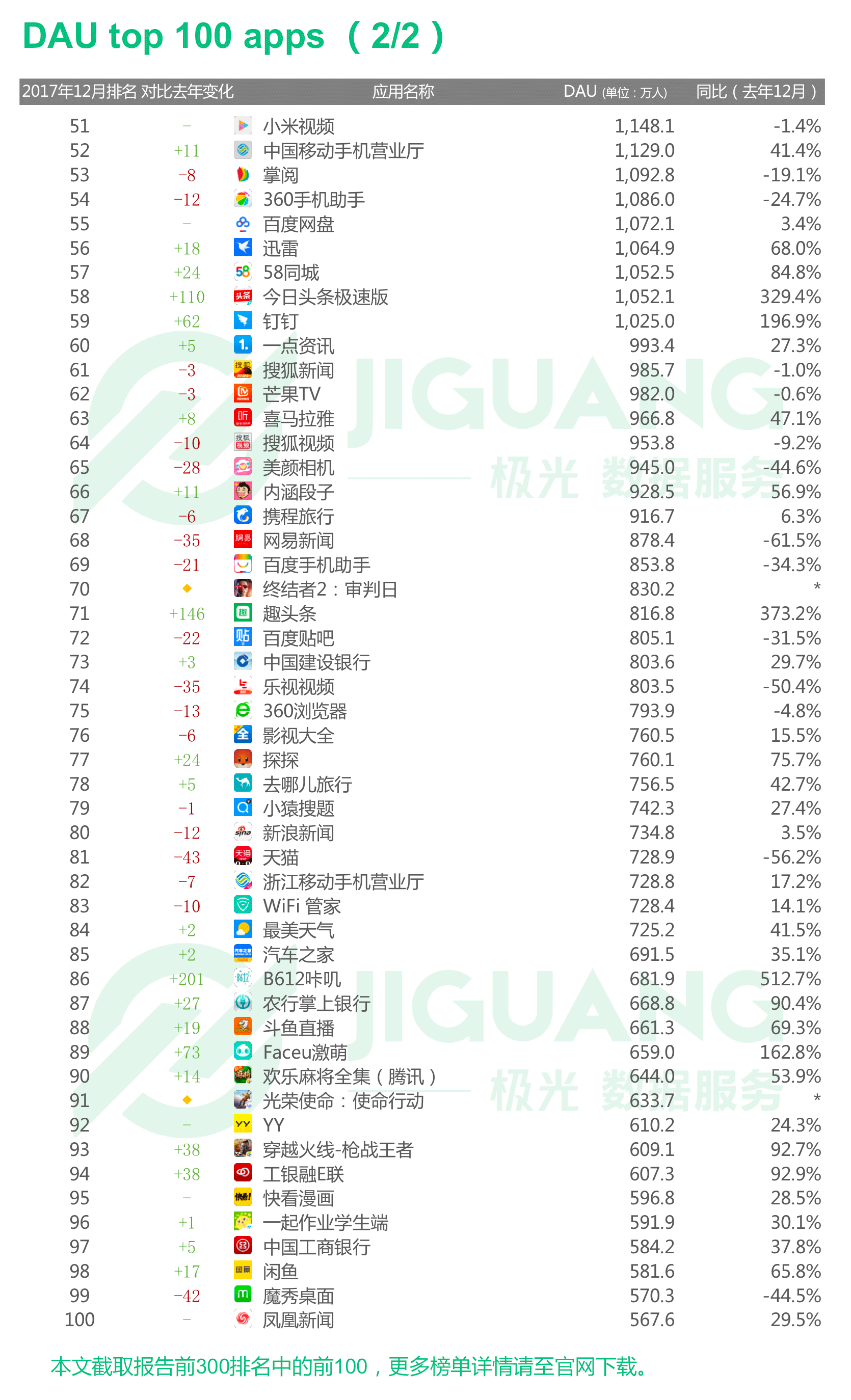 • 极光大数据显示,12月DAU top 300榜单新晋app有荒野行动(34名,2331.0万)、火山小视频(35名,2283.1万)、抖音短视频(42名,1744.7万)等59款app